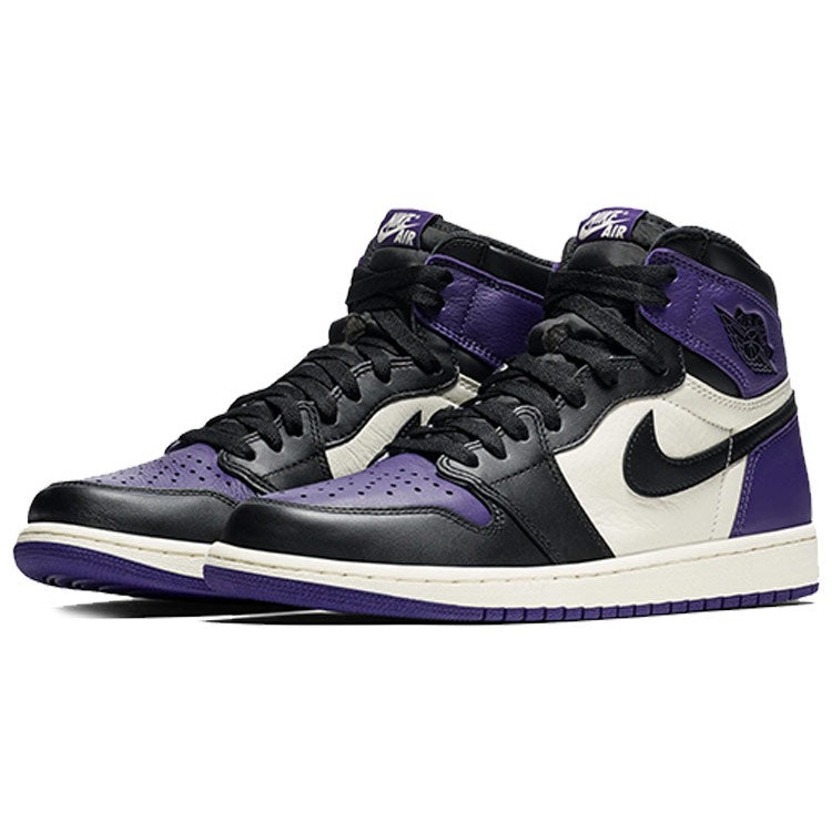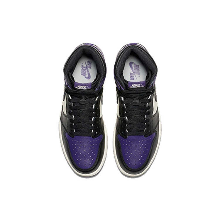 What screams both royalty and NBA s rookie of year in 1985? The Air Jordan 1 Retro High Court Purple. Showcasing a magical splash of color, these shoes have a leather upper in black, sail, and court purple.