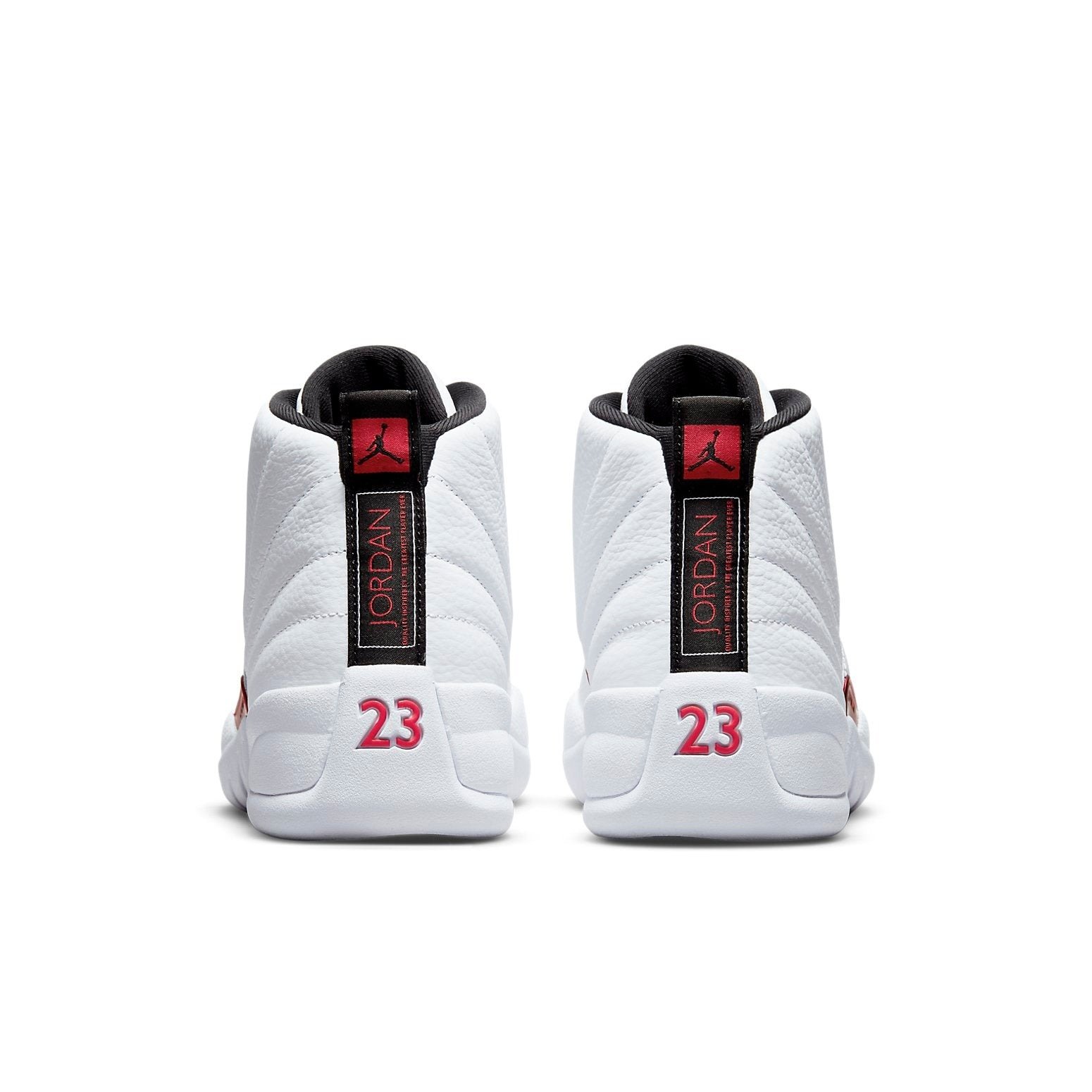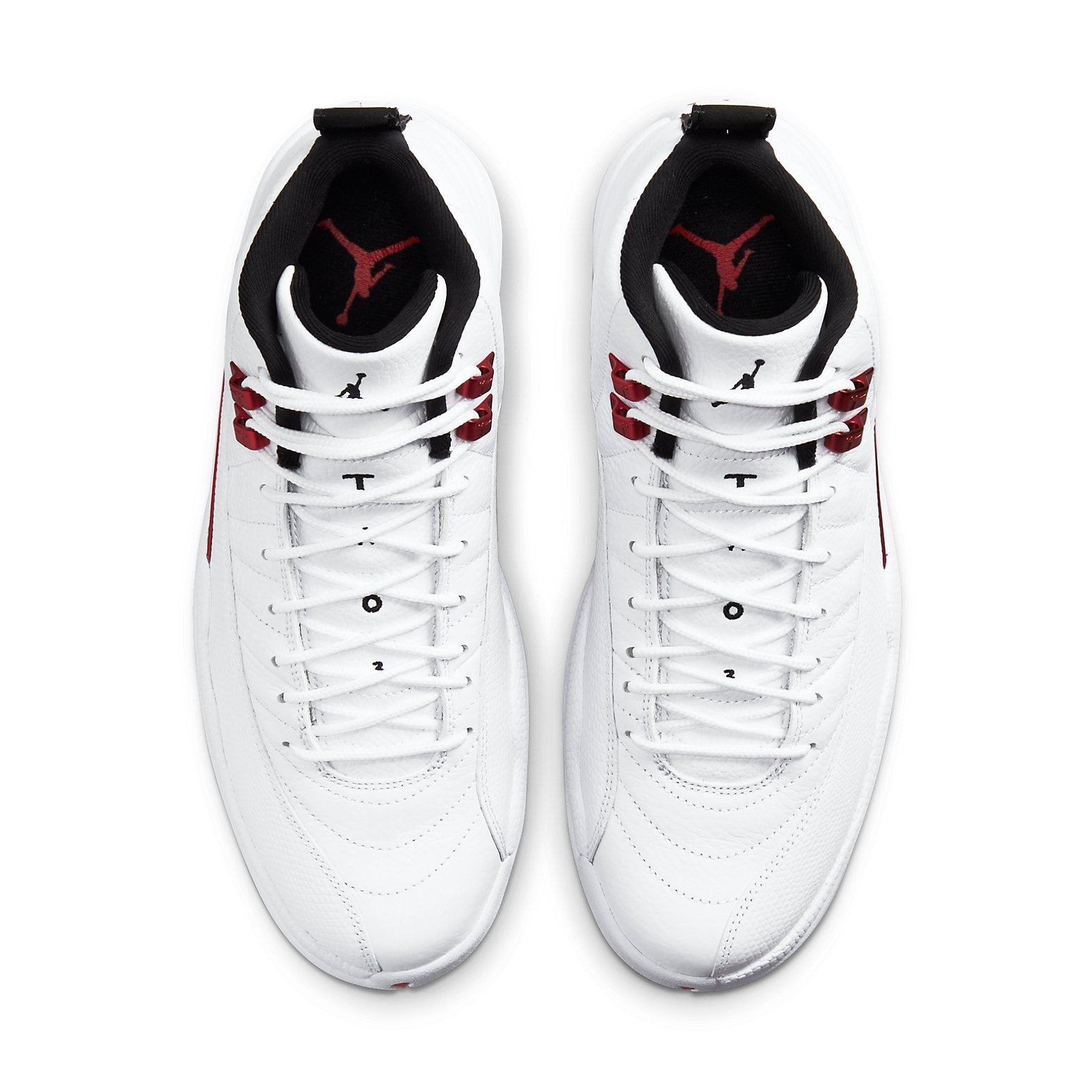 The Air Jordan 12 Twist features a white tumbled leather paneled upper with a pebbled leather mudguard. From there, red metallic Jumpman side tabs and eyelets, black woven heel tabs, and a sculptural sole completes the design. The Air Jordan 12 Twist released in July of 2021 and retailed for $190.