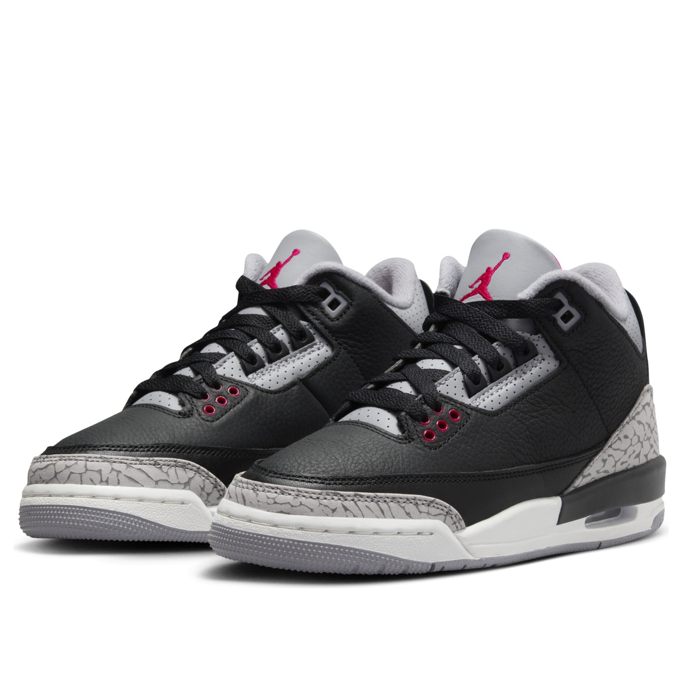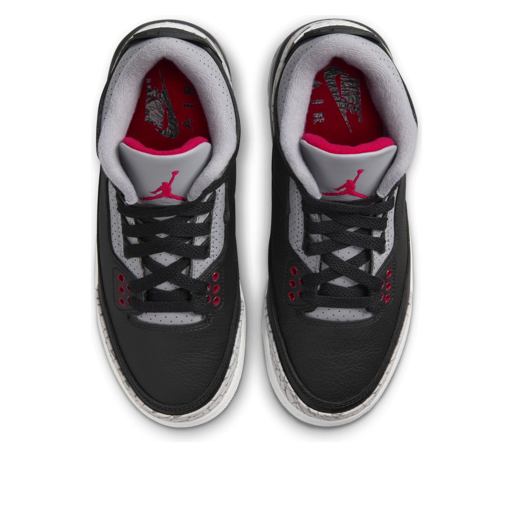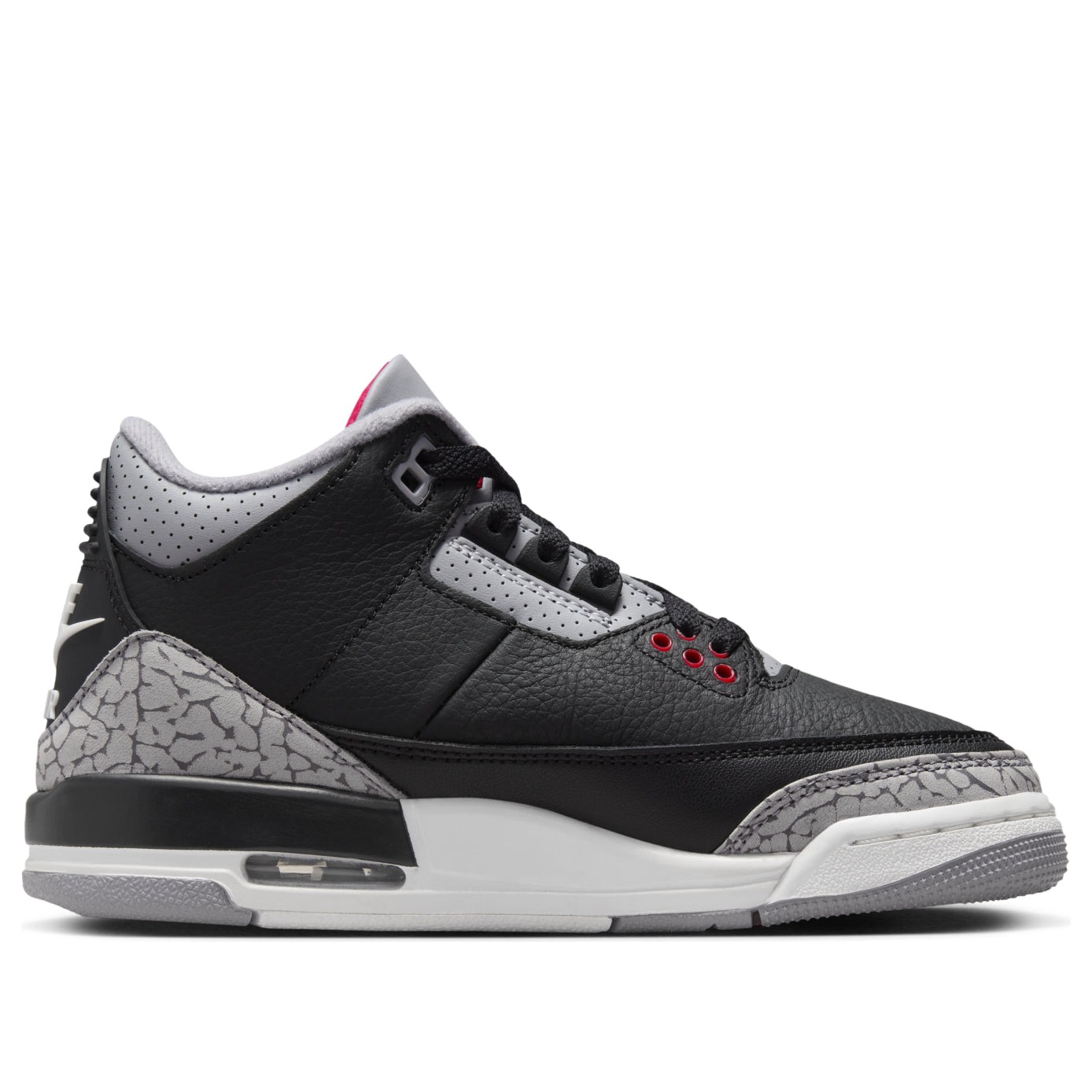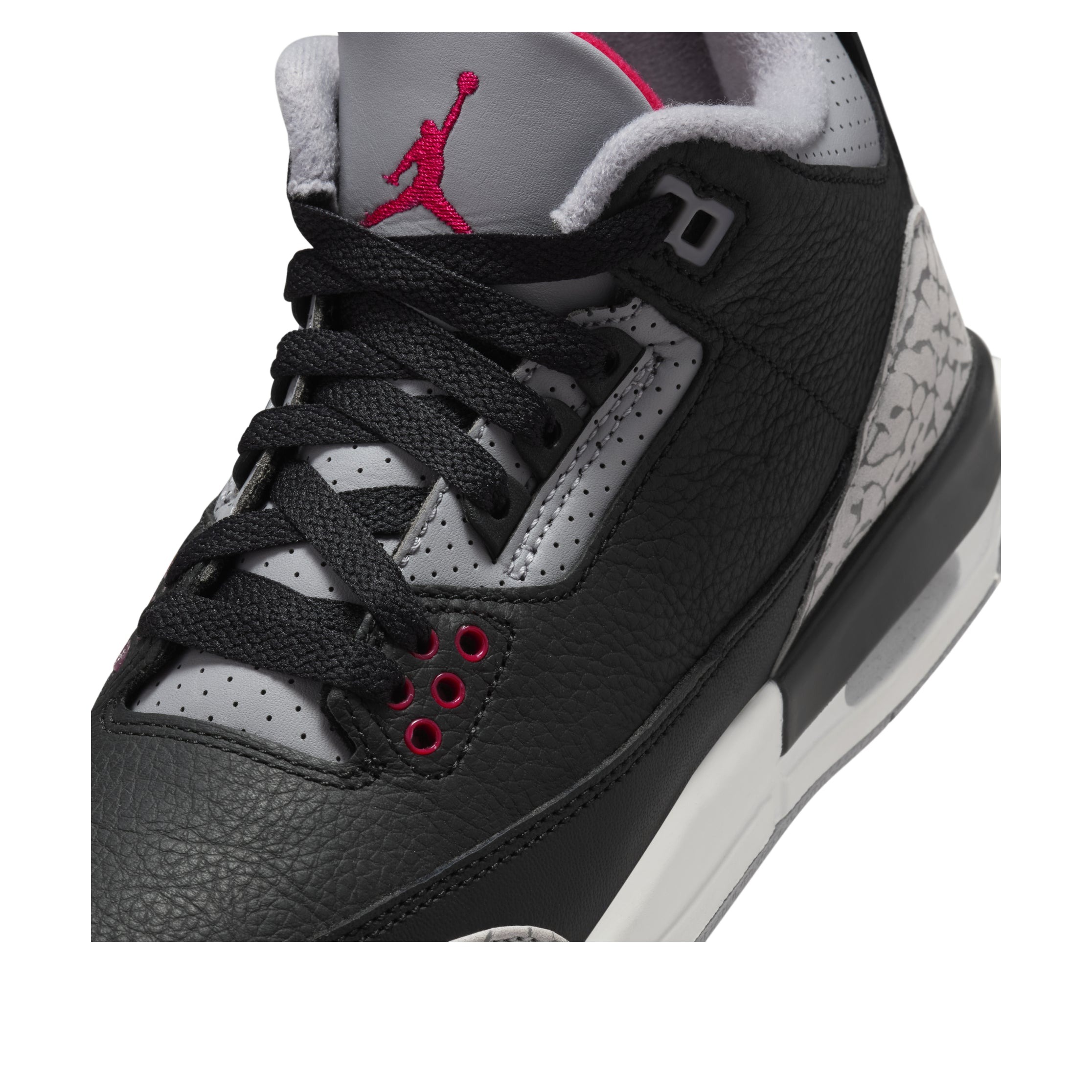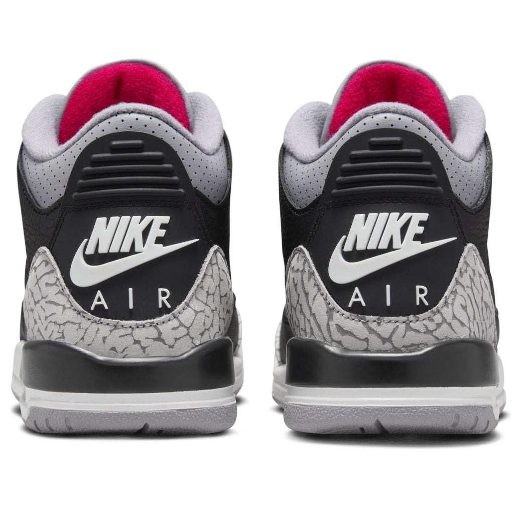 The Jordan 3 Retro Black Cement (2024) (GS) is a relaunch of Tinker Hatfield s iconic sneaker with gray elephant-print detailing and an eye-catching colorway of black, Fire Red, Cement Grey, and Sail.Originally released in 1988 and last seen in 2013, the Black Cement (2024) (GS) Jordan 3 Retro boasts a tumbled leather upper in black with tonal stitching. Elephant print decorates the leather overlays at the forefoot and heel, while perforations add texture to the gray leather around the collar. Pops of Fire Red stand out on the Jumpman logo, the first three eyelets, the bottom of the shoe, and the underside of the tongue. Padding in the tongue and collar completes the look and protects the ankle.Our experts like the tonal contrast provided by the raised, white Nike Air logo on the heel. The grade school-sized Jordan 3 Retro Black Cement (2024) (GS) was released on November 23, 2024, and sold for $150.