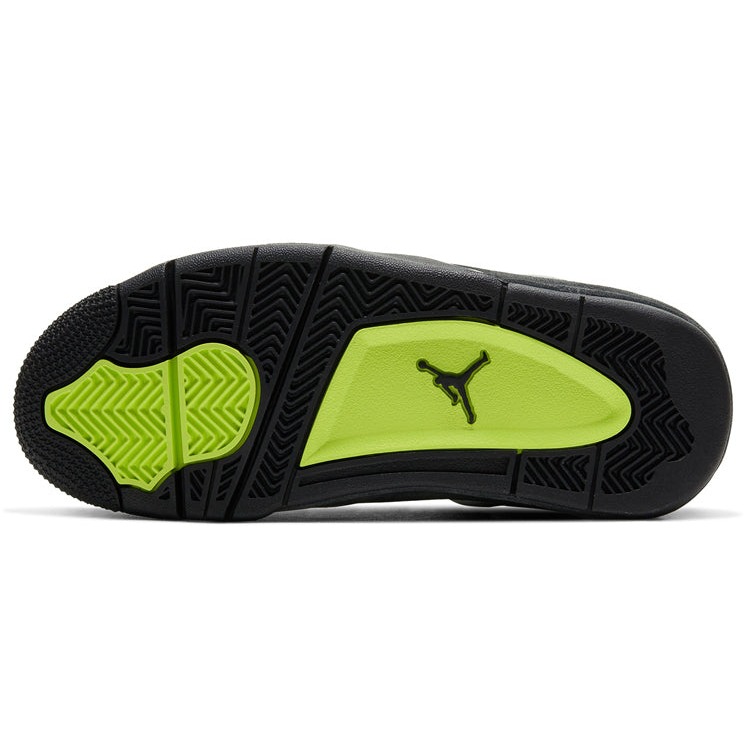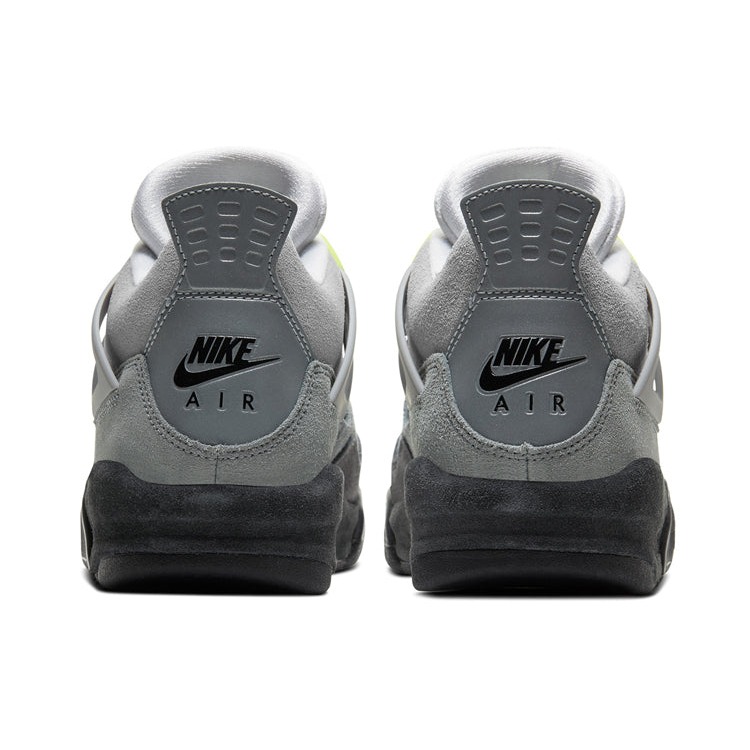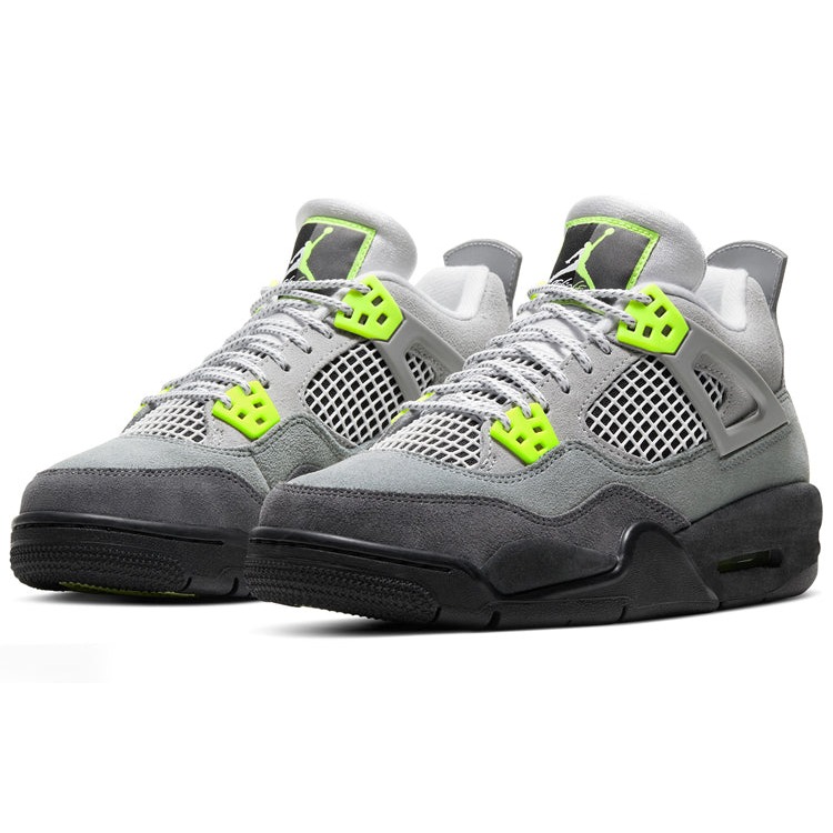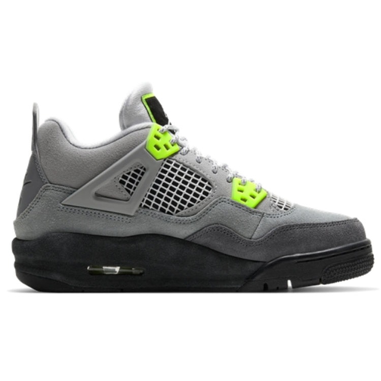 The Air Jordan 4 Retro SE Neon GS comes with a suede upper in a mixed gray colorway. This model of Retro Air Jordan 4 for grade-schoolers features a quarter panel netting in white, eyelets and the Nike Air emblem on the molded heel panel. On the tonge the jumpman logo is surrounded by neon yellow. The sneaker displays profile mesh guards and plastic eye stays. A solid black midsole supports the mid-top with a visible AiR sole unit and a neon yellow heel. The shoe tongue features a white colorway Jumpman emblem. The Air Jordan 4 Retro SE Neon GS was launched on the market on 21 March 2020 and originally retailed at $160.