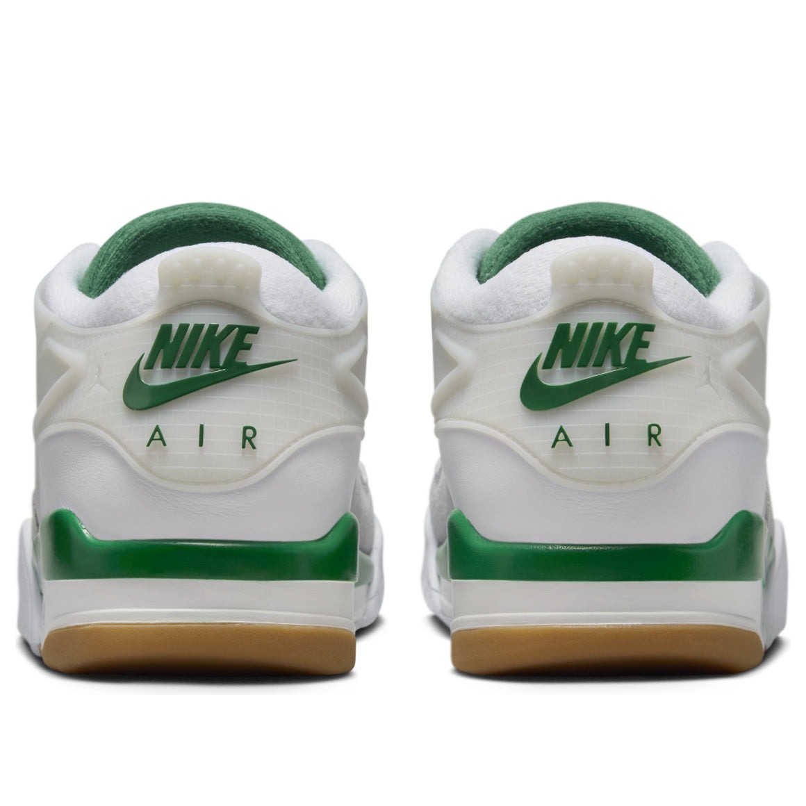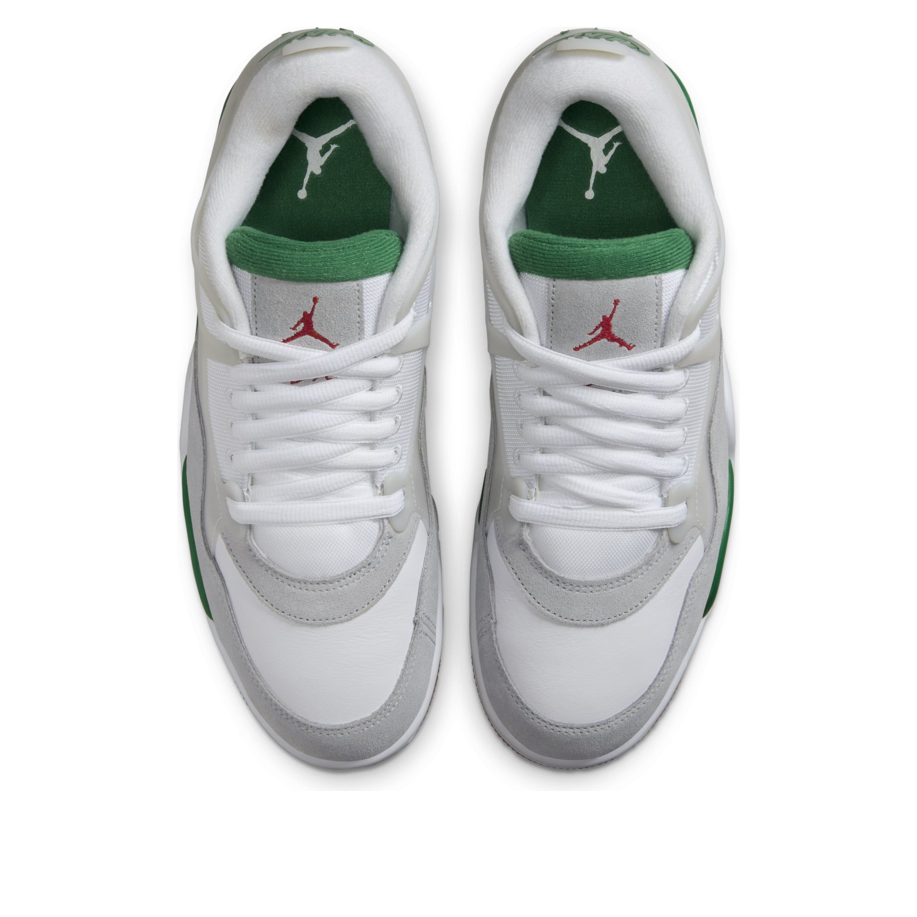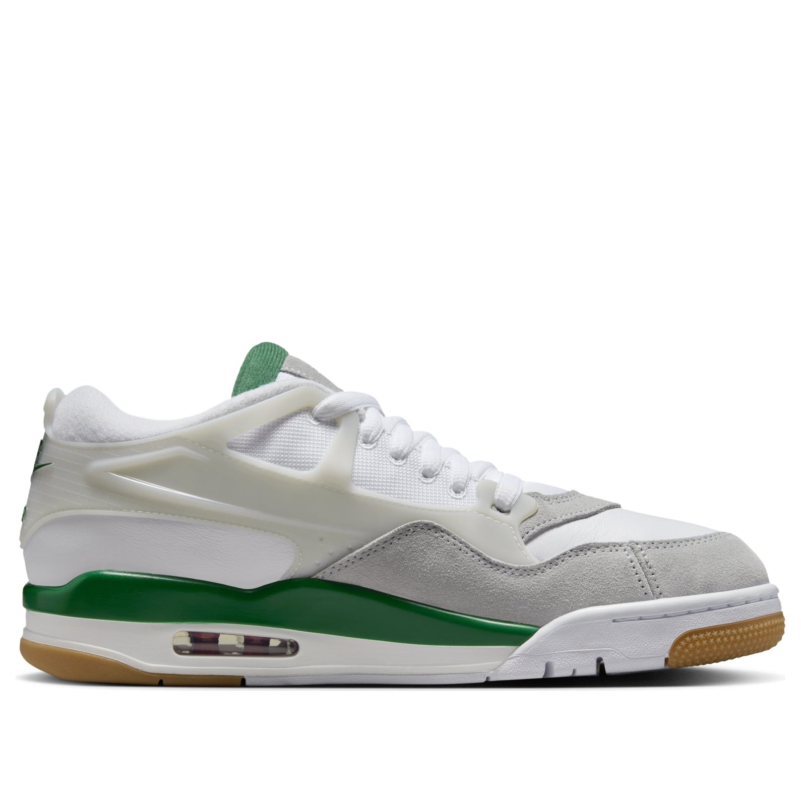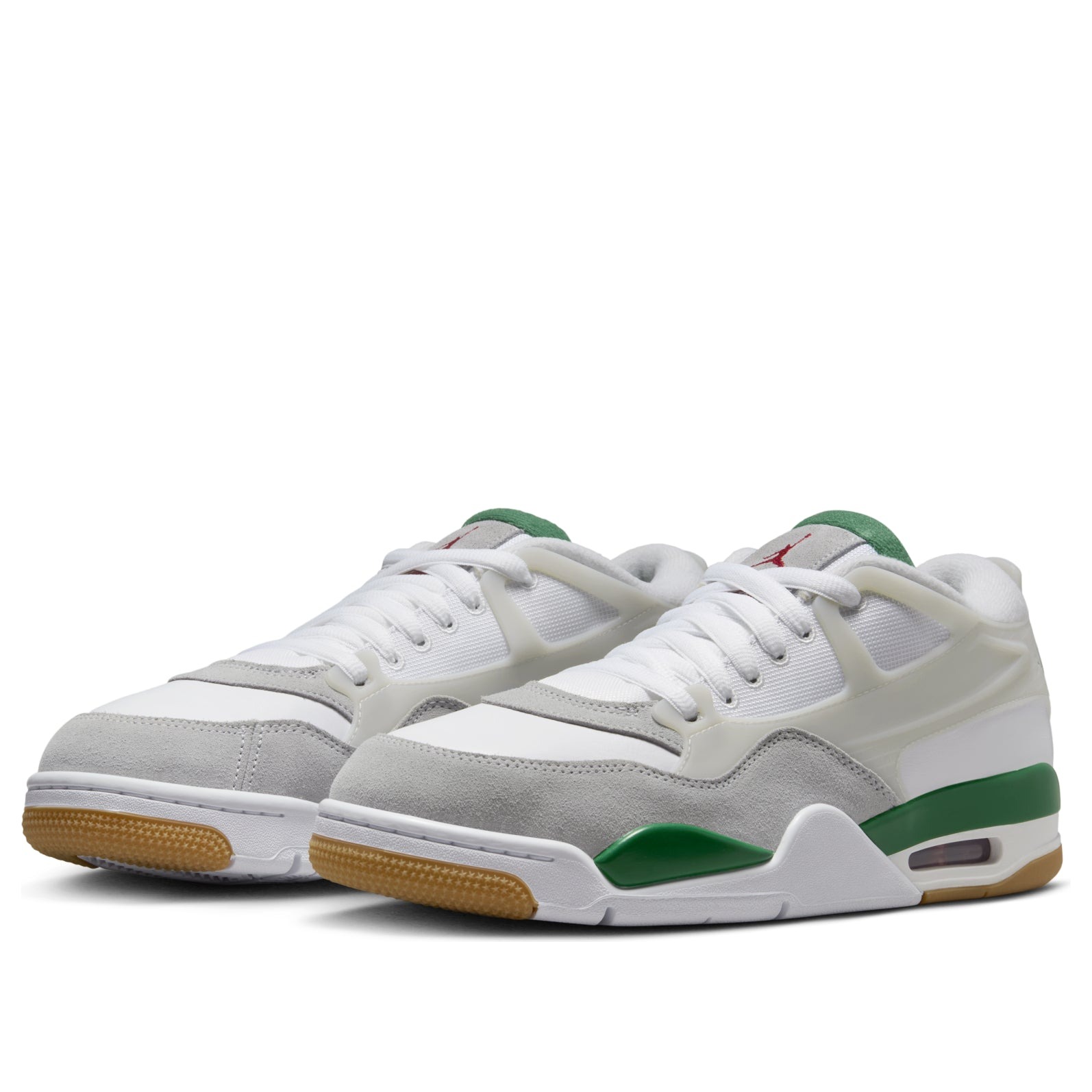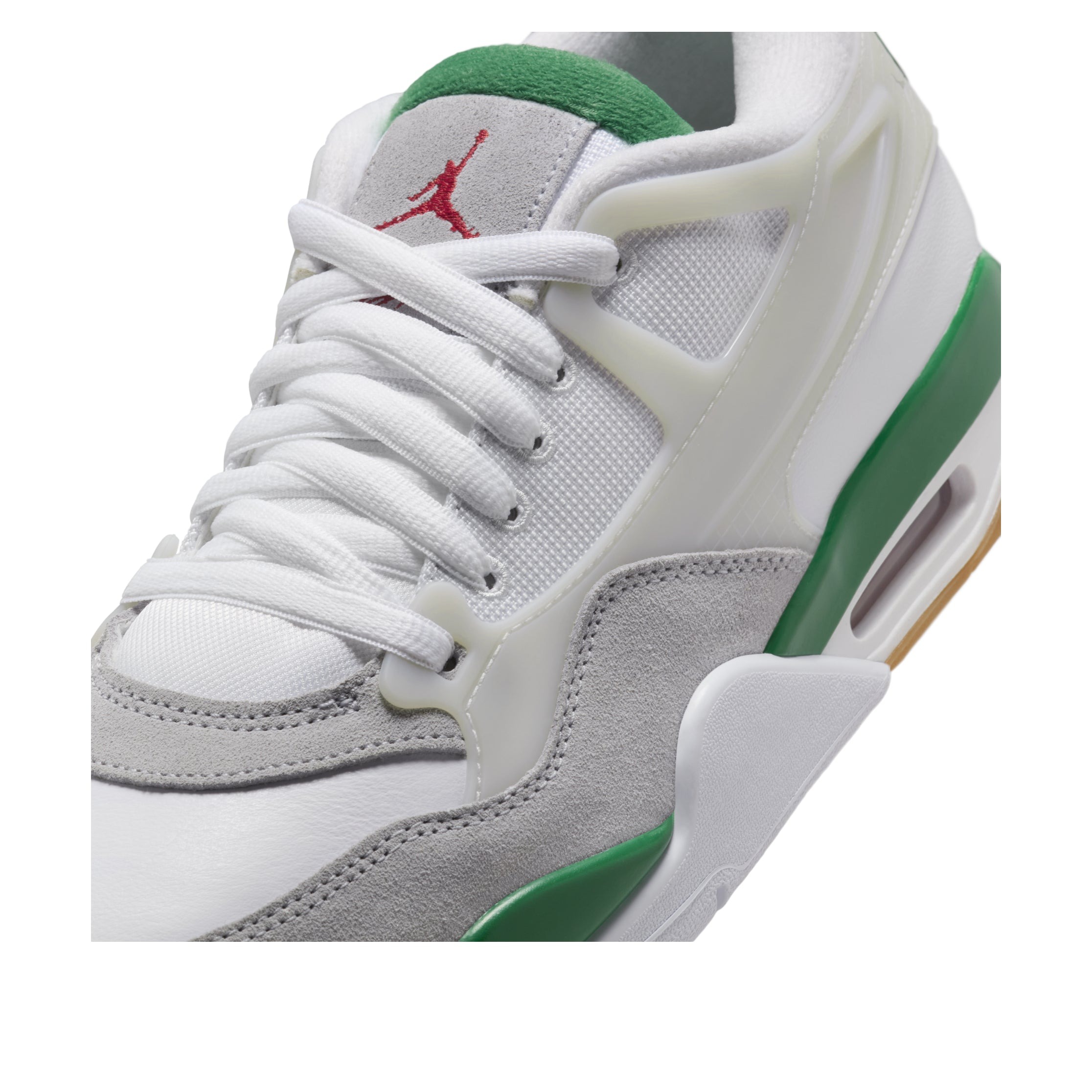 The Jordan 4 RM Pine Green is a performance sneaker with a modern design, equipped with visible Air units under the heel. The Pine Green Jordan 4 RM is made with a base of white leather. This material forms the toe box and the heel area, while a light grey suede mudguard rounds out the forefoot. The eyestays, wings, and heel of the shoe are joined together to make a supportive cage around the foot, while the Nike Air logo appears on the back of the heel in Pine Green. A red Jumpman logo adorns the tongue in red, and a Pine Green midsole supports the back half of the shoe. There is a visible transparent Air unit under the heel.What we like best about this shoe is the support cage, which appears where the Nike swoosh normally is, but provides improved functionality and a sleek look. The Jordan 4 RM Pine Green was released on February 1, 2025, for $150.