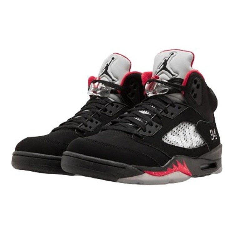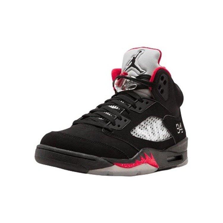 The Jordan 5 Retro Supreme Black is a limited edition of the Air Jordan 5 silhouette released as part of a collaborative effort between the Jordan Brand and Supreme, one of the biggest luxury streetwear brands in the world.The shoe features a predominantly black upper made from leather material, with red accents around the collar and a touch of silver on the tongue. It showcases a few distinctive design elements that make it stand out. Some of these elements include a large « Supreme » logo embroidered inside the mesh panel on both sides of the shoe and red shark teeth on the midsole.The stand-out feature on the Jordan 5 Retro Supreme Black is its Air-Sole units in the heel and forefoot to aid with cushioning the foot and also provide impact absorption, ensuring a comfortable wearing experience. The shoe was made available for retail on October 16th, 2015 at the price of $198.