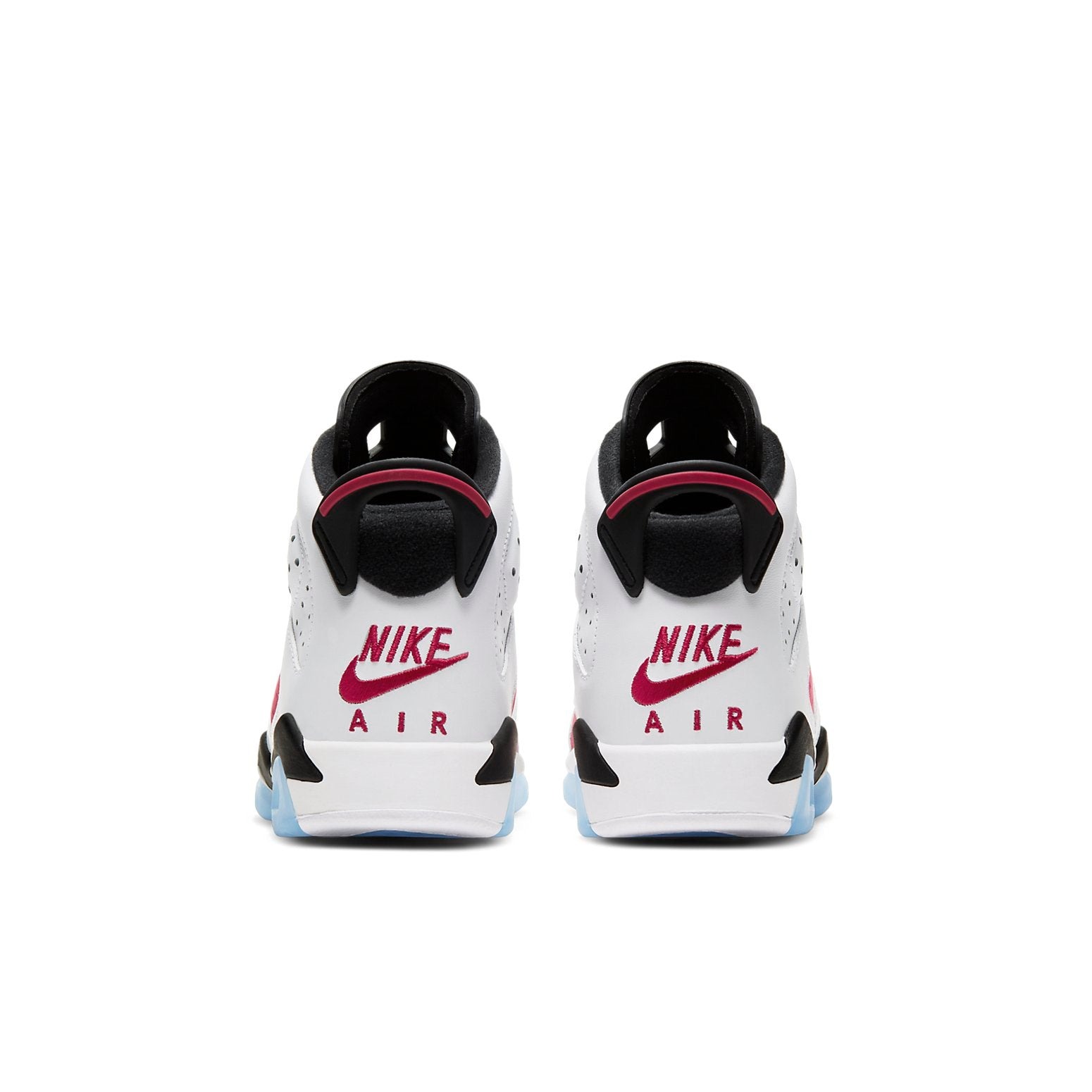 The Air Jordan 6 Retro Carmine 2020 for Grade School (GS) uses a White/Carmine/Black colorway in this grade school sized shoe. A black mudguard threads through the white midsole and edges the carmine nubuck upper and white leather overlays and collar. A carmine lace lock features black Jumpman icons. A carmine Jumpman and Air logo enhance the collar. The white Nike Air logo and Swoosh appear on the black insole. A denser white rubber and a carmine Jumpman amplify the translucent white outsole. White laces and a black tongue and sock lining complete the look.The Air Jordan 6 Retro Carmine 2020 GS was released on February 13, 2021, at a retail price of $150.