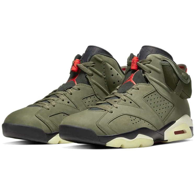 Trailing the buzz of their recent collaborations, Travis Scott and Jordan Brand team up once again for the Jordan 6 Retro Travis Scott, now available on Newsole. This is the fourth Air Jordan silhouette that Cactus Jack has touched. This sneaker made its mainstream debut when Travis rocked them on stage during his Super Bowl LIII performance and the rest is history.This AJ 6 features an olive upper with black detailing and red contrasting accents on the tongue and lace locks. A side cargo pocket is displayed on the collar, giving this sneaker a design modification that makes it the first of its kind. A sail midsole, glow-in-the-dark translucent outsole, 3M detailing and both Nike Air and Cactus Jack branding on the heel completes the design. These sneakers released in October of 2019 for $250.