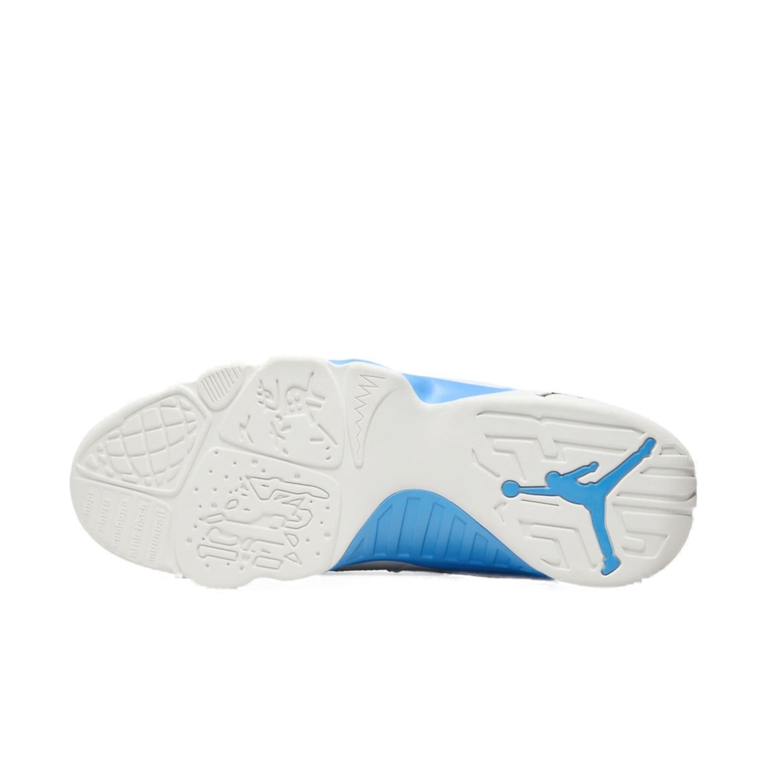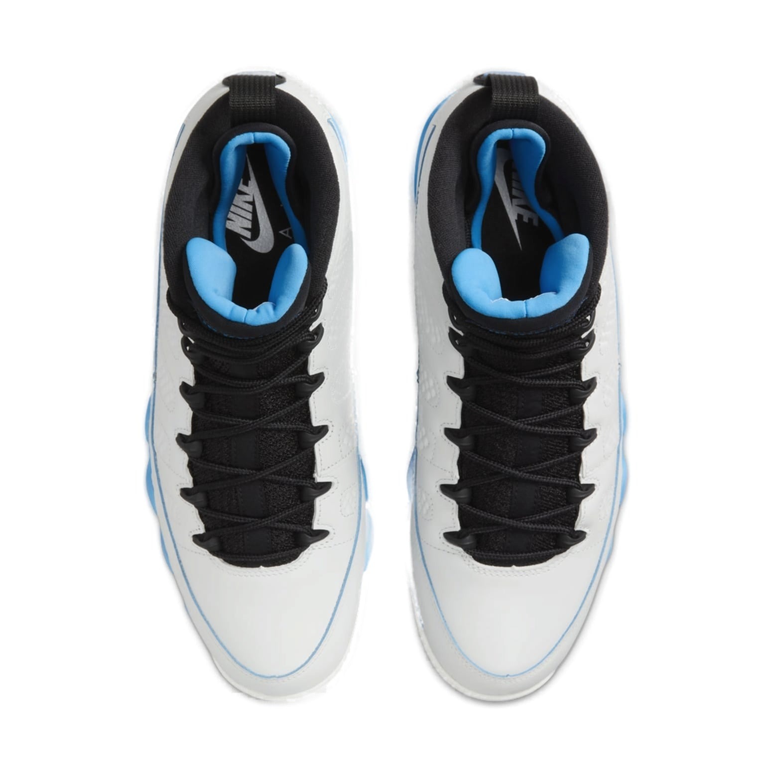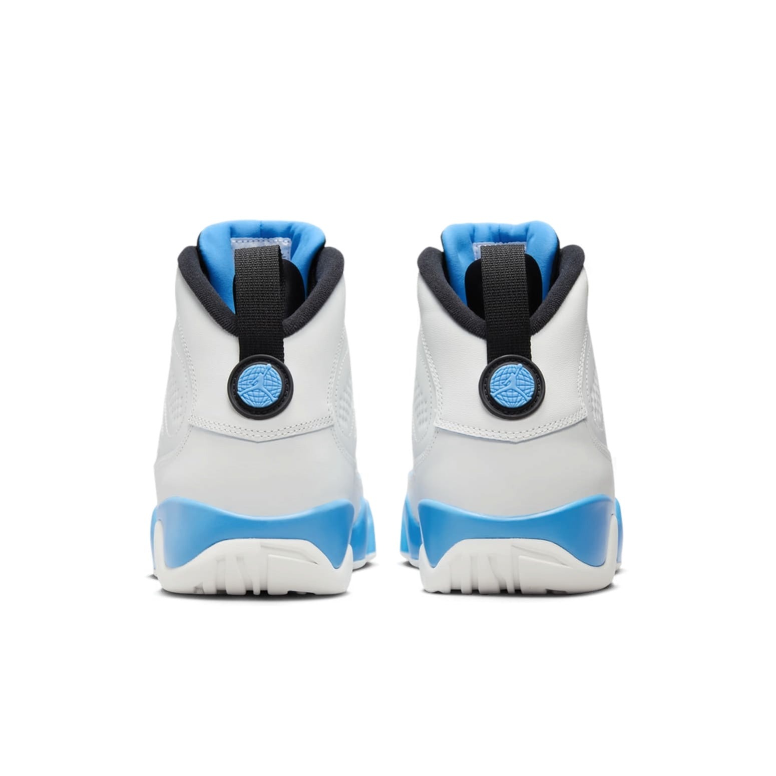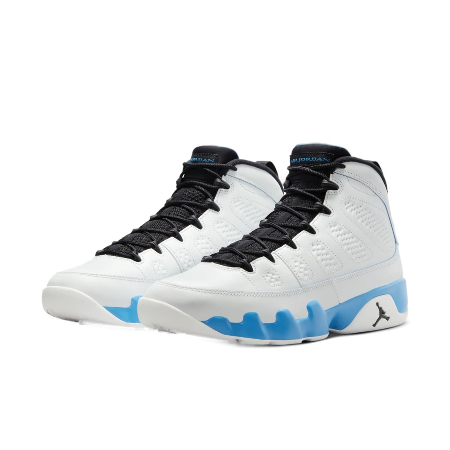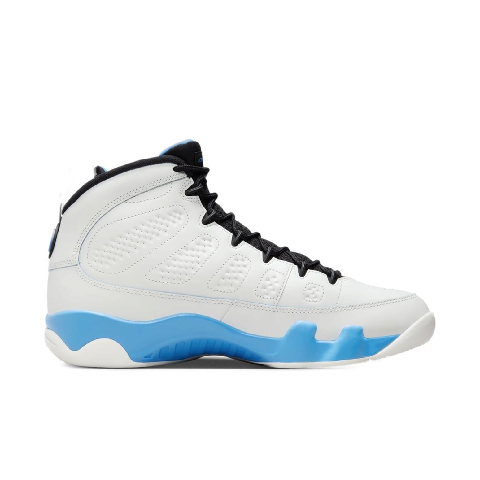 The Air Jordan 9 Retro Powder Blue 2024 revives a fan favorite colorway with a fresh execution. It features a white leather upper thats both luxurious to the touch and robust for wear. Black components grace the tongue, eyelets, liner, pull tabs, and midsole, highlighted by the iconic Jumpman. These dark accents set the stage for the dark powder blue featured on the midsole, inner lining, tongue branding, and logo on the heel pull tabs, imbuing the sneaker with a cool, collected charm that makes this sneaker truly stand out. Every aspect of the sneaker is infused with intention the powder blue adorns the midsole creating a visual synergy thats both striking and sophisticated. The Air Jordan 9s unique globe emblem on the heel celebrates Jordans global influence, while the intricate stitch patterns and layered panels add depth and texture to the design. The release of the Air Jordan 9 Retro Powder Blue on March 23, 2024, for $210, marked a triumphant return of a beloved colorway. The launch celebrated Jordans global appeal, with the sneakers white and black composition setting the stage for the serene powder blue, ensuring its place in the annals of sneaker culture as a testament to timeless design and universal appeal.
