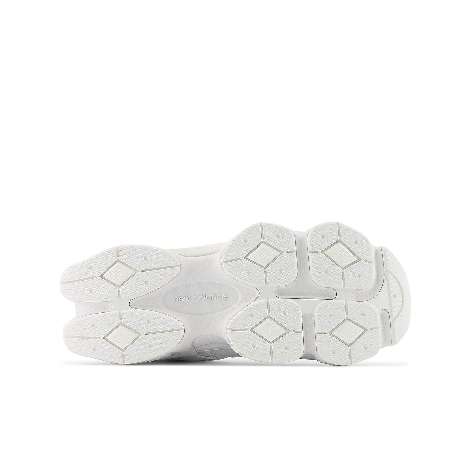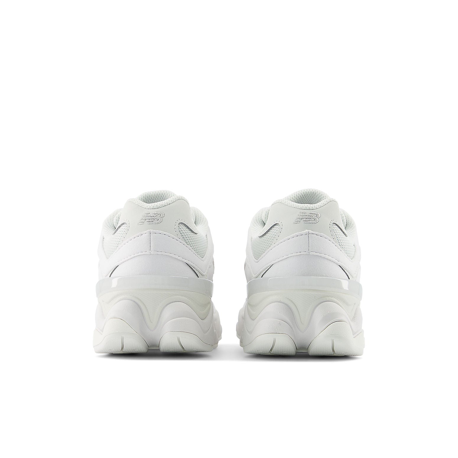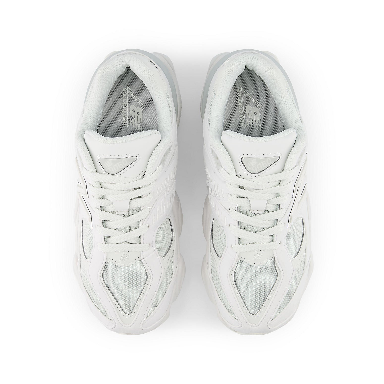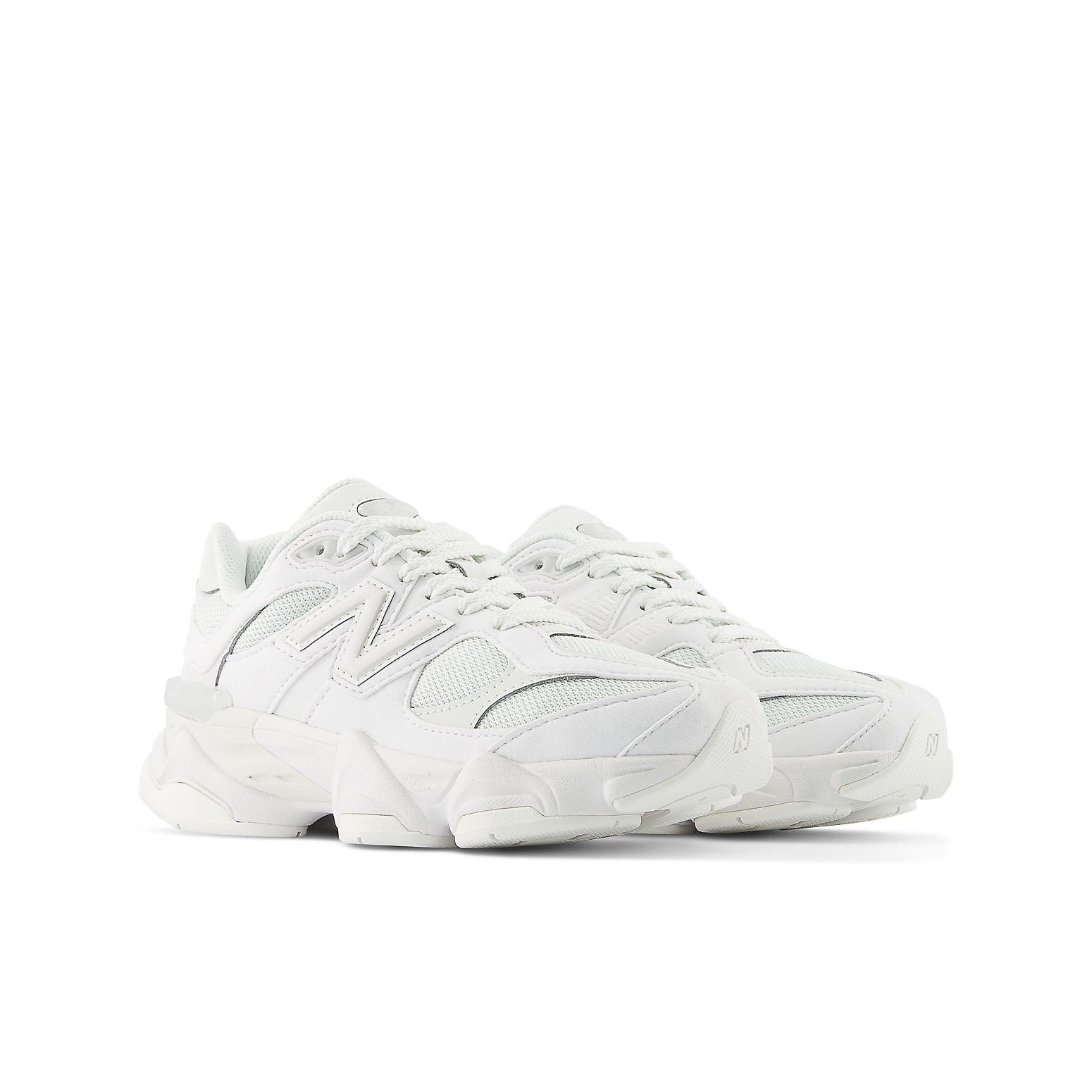 The New Balance 9060 Reflection (GS) is a grade school-sized shoe with a classic design and a shiny heel counter.This version of the New Balance 9060 comes with a white mesh and leather upper. Mesh dominates the toe box and the area under the ankle for breathability, while leather overlays form the toe cap and support the midsole. Leather overlays also run around the heel. The New Balance » N » appears across each side of the shoe in white, with a solid design on the lateral side and a dashed one on the other side. A small NB appears on the heel collar, while the tongue also bears New Balance branding. A shiny white TPU heel counter provides extra support, while a chunky and wavy white outsole completes the look.What we like most about this shoe is the all-white and shiny color scheme. The shiny heel counter adds a bit of visual interest to the white shoe. The New Balance 9060 Reflection (GS) was released on May 26, 2023, for a price of $110.
