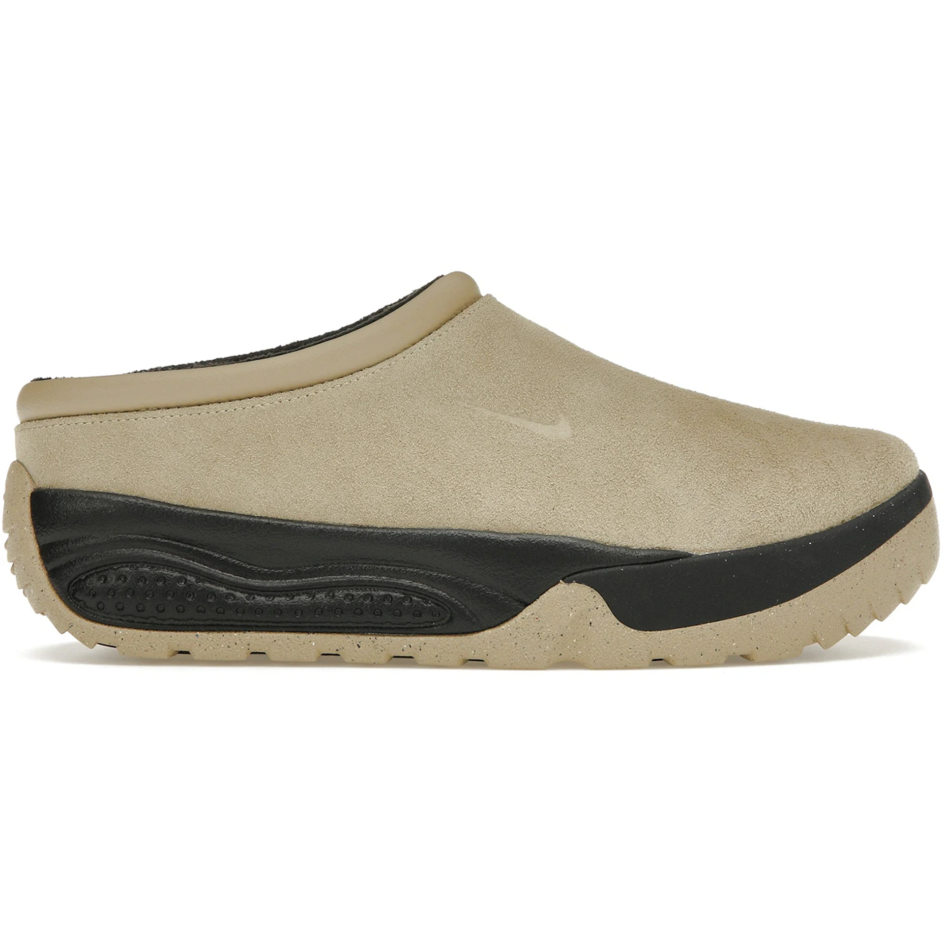 The Nike ACG Rufus Limestone Black is a unique slipper that has now made a comeback after about a decade. This model of the Nike ACG Rufus is made with a seamless suede upper in a Limestone tan color. The only design seen on the upper is a small Nike Swoosh embossed into the lateral side. The midsole is black rubber that dons a wavy texture near the bottom, and speckled Limestone tan forms the thick outsole, fully enclosing the black midsole. A small black Nike swoosh appears on the front tip of the outsole. The midsole has foam cushioning for extra comfort. Our favorite thing about this shoe is the unique black midsole unit that contrasts nicely with the Limestone color of the rest of the shoe. The Nike ACG Rufus Limestone Black was first released on May 10, 2024, for an initial retail price of $110.