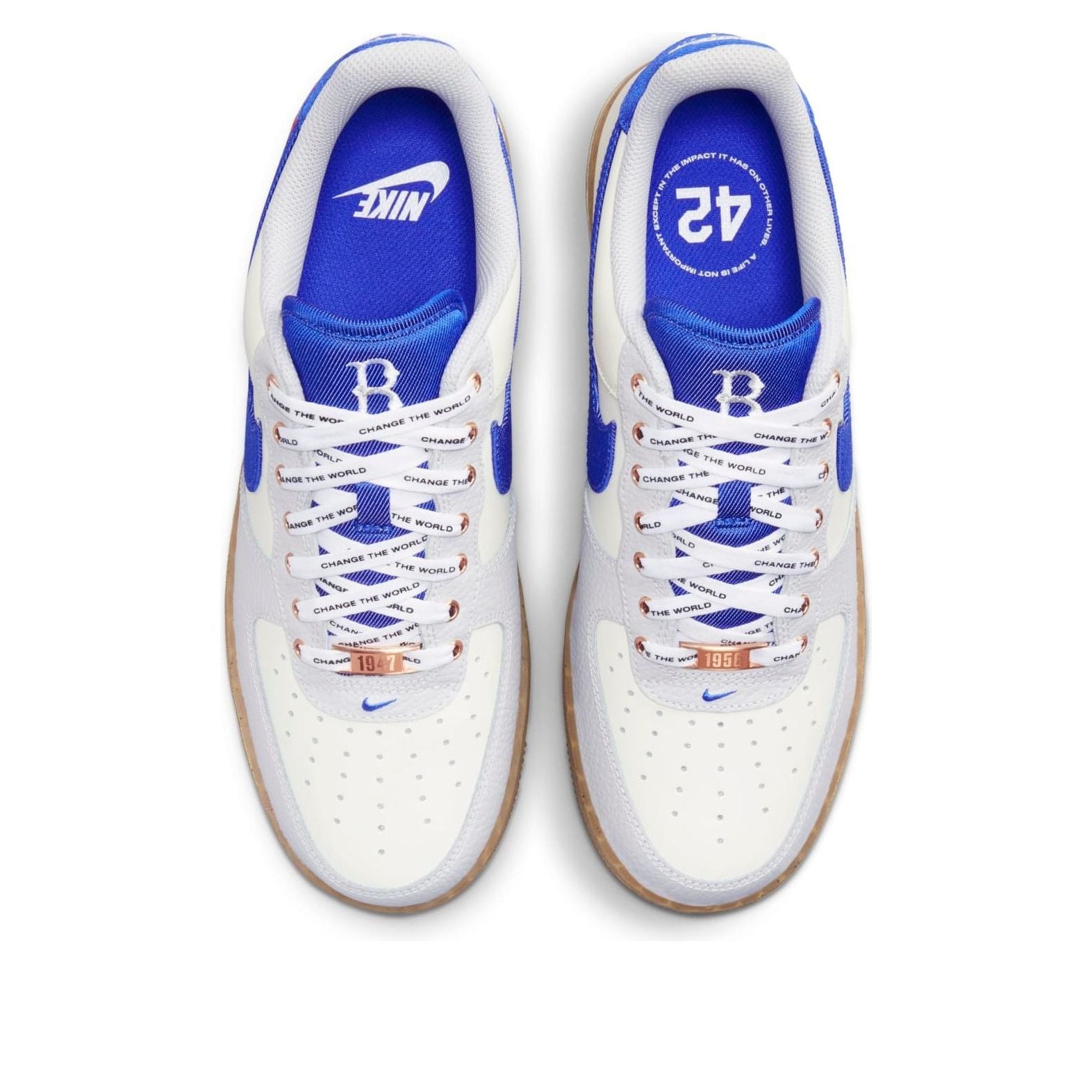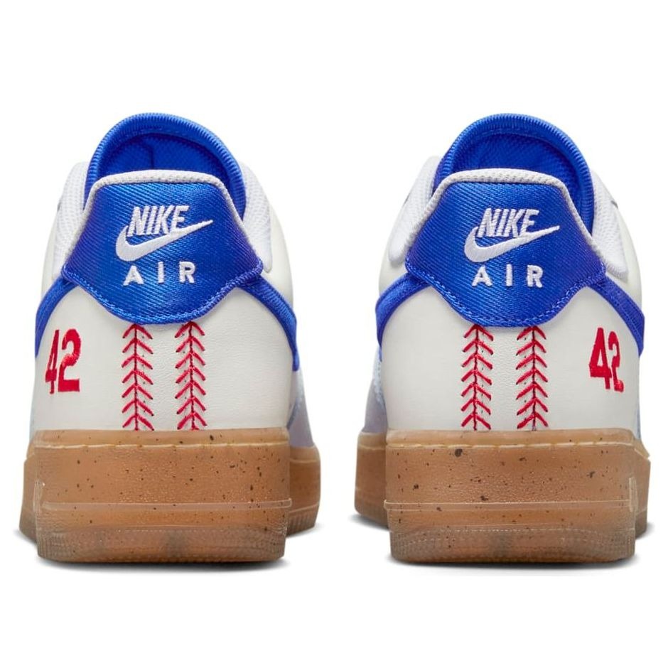 The Nike Air Force 1 Low Jackie Robinson comes in a blend of multiple colors that shape its outside look, with University Red, Sail, Racer Blue, white, black, and neutral gray being the major tones.The Low Jackie Robinson Nike Air Force 1 takes inspiration from the classic Brooklyn Dodgers uniforms, paying tribute to Jackie Robinson. The shoes include embroidered 42 on the heel and the team logo on the tongue. The laces have the phrase « Change The World » printed on them, and the lace dubrae is metallic bronze, symbolizing the significant years in Jackie Robinson’s career, when he retired in 1956 and when he broke the color barrier in 1947. The upper part of the shoes combines tumbled leather on the toe and lace collar, along with smooth white leather on the toe-box, mid-panel, and heel.The gum sole that extends throughout the shoe was found to by the sneaker s intriguing features by our experts. The Nike Air Force 1 Low Jackie Robinson sold for $120 on its launch on April 15th, 2023.