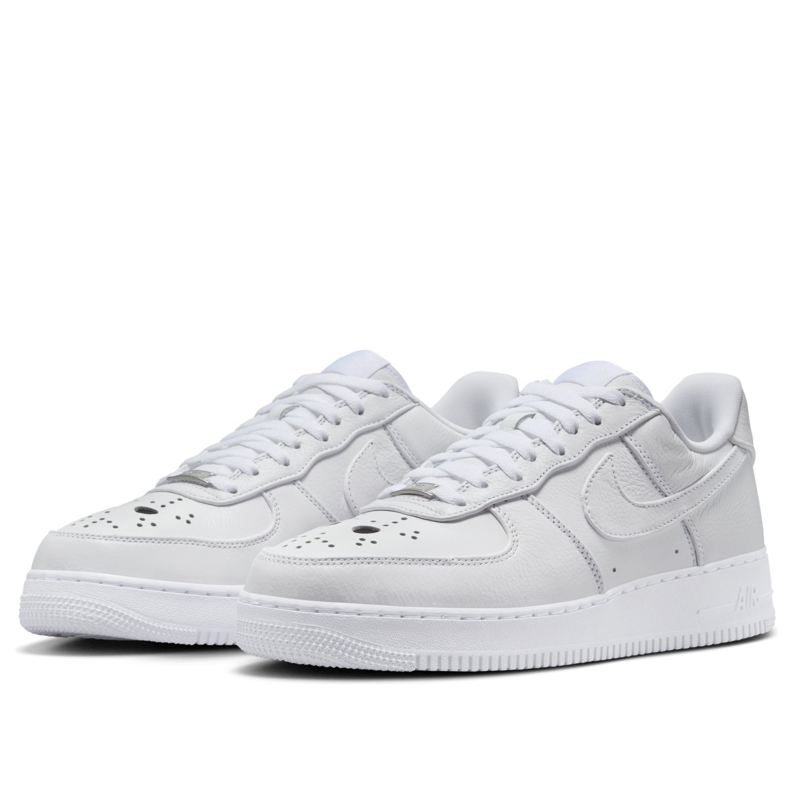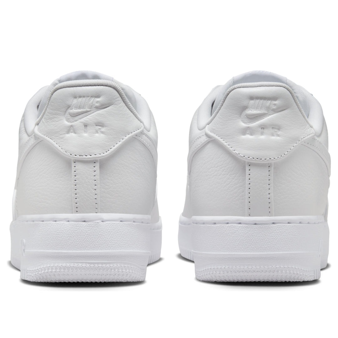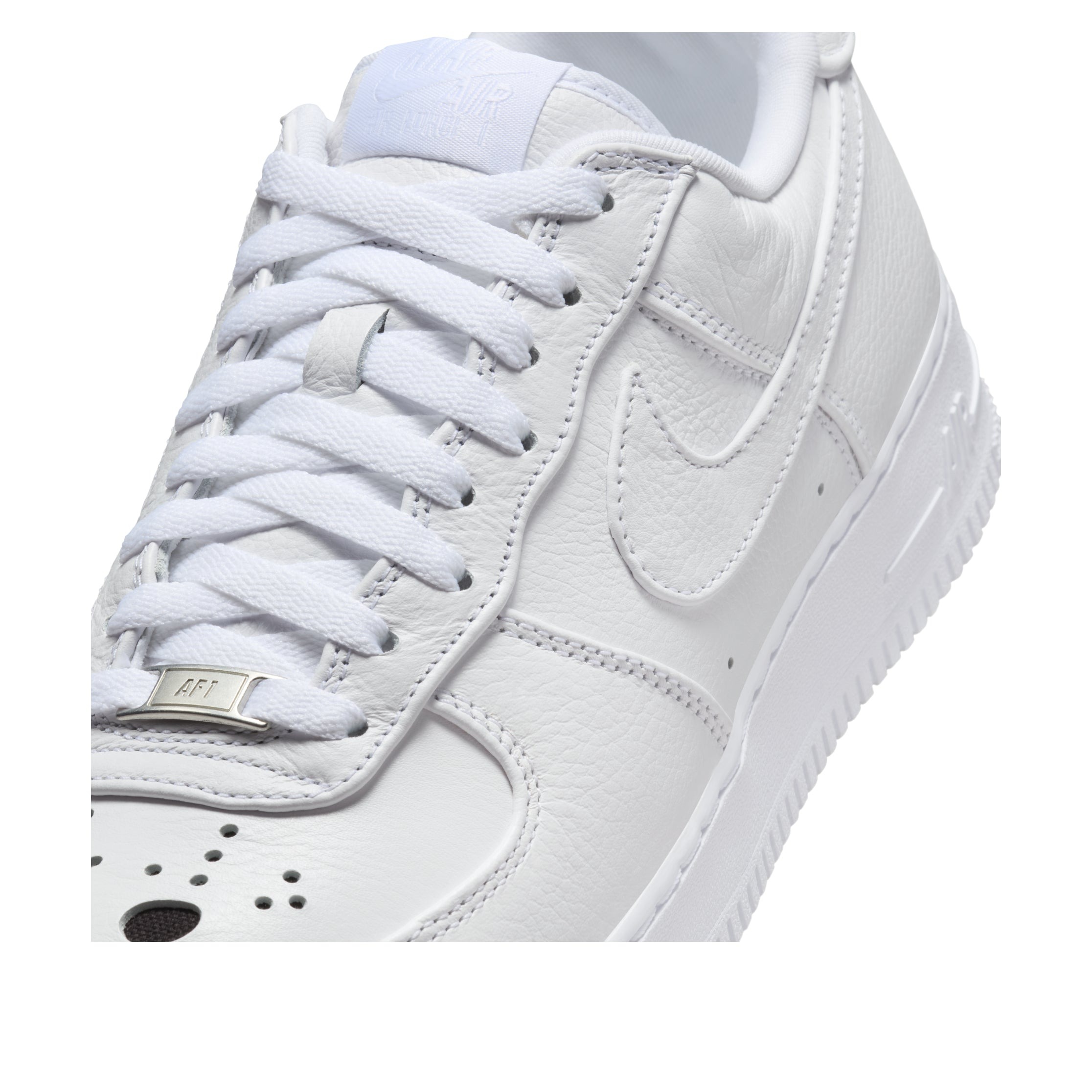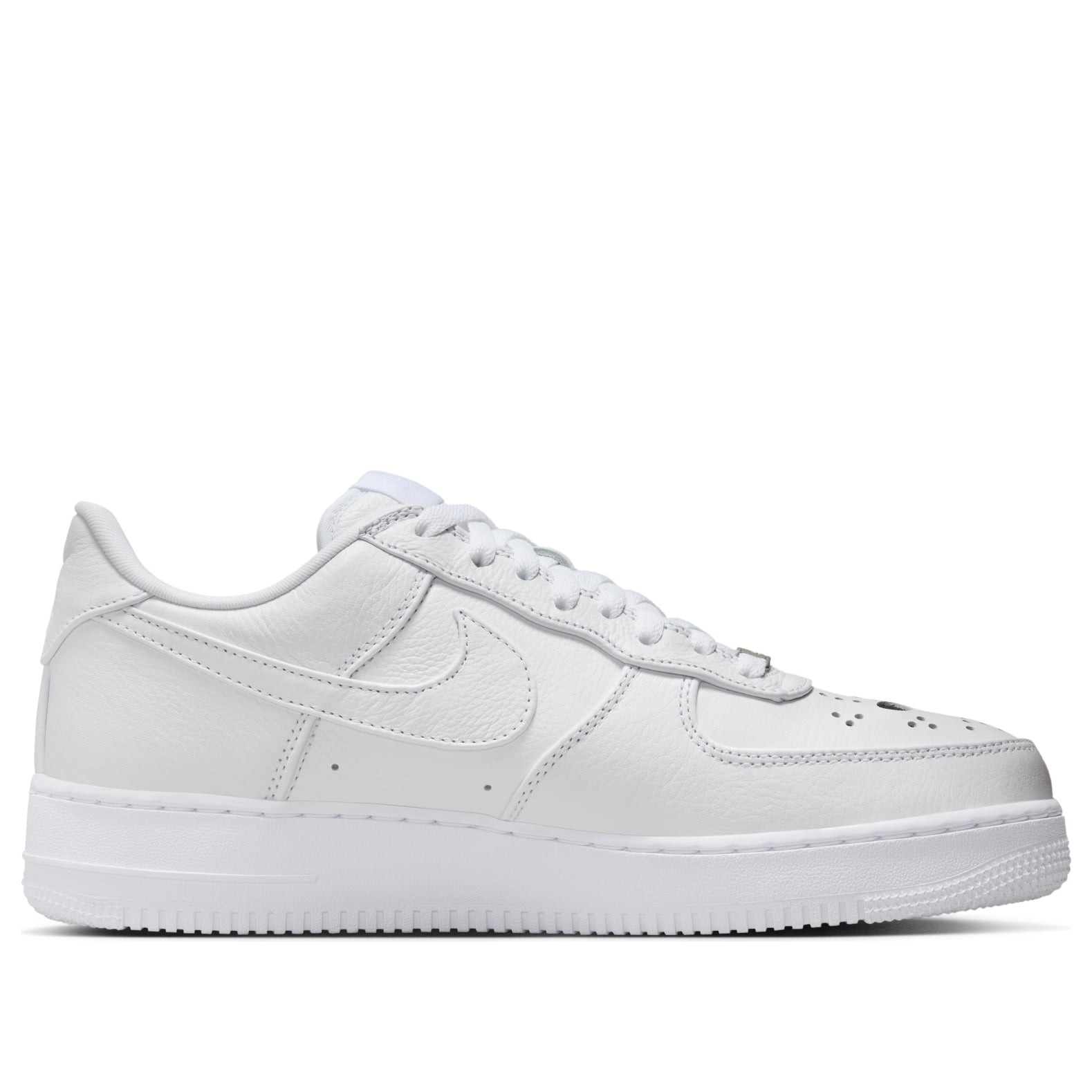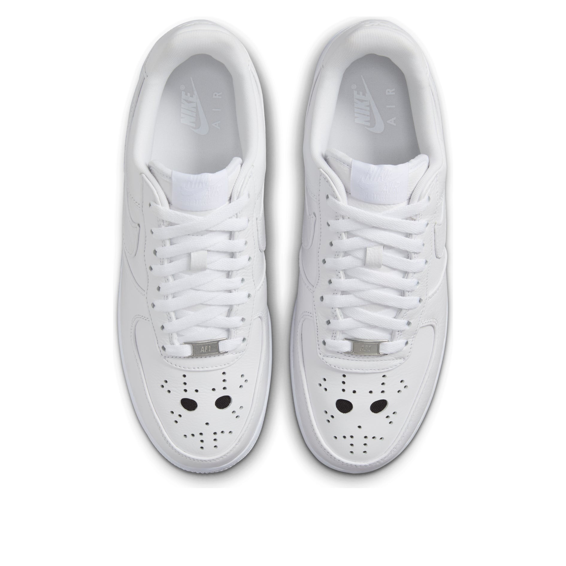 The Nike Air Force 1 Low Jason Voorhees is a low-top shoe designed with the character Jason Voorhees from the Friday the 13th movie series in mind. The Jason Voorhees Nike Air Force 1 Low has an upper made of white leather. This material forms the side panels, the toe box, and the overlays that form the toe cap, eyestays, heel counter, and heel collar. The Nike Swoosh also appears on each side as a white leather overlay. The side panels contain two perforations near the bottom for breathability, and the toe box is also perforated. Instead of the classic perforation pattern, however, this time the perforations appear in the shape of the Jason Voorhees mask, with two larger ones in the middle as his eyes. A Nike patch appears on the tongue, and a Nike Air logo appears on the heel counter. What stands out about this shoe is the perforation pattern in the shape of Jason Voorhees mask, which really drives the theme of this shoe home. The Nike Air Force 1 Low Jason Voorhees was released on October 24, 2024, for $150.