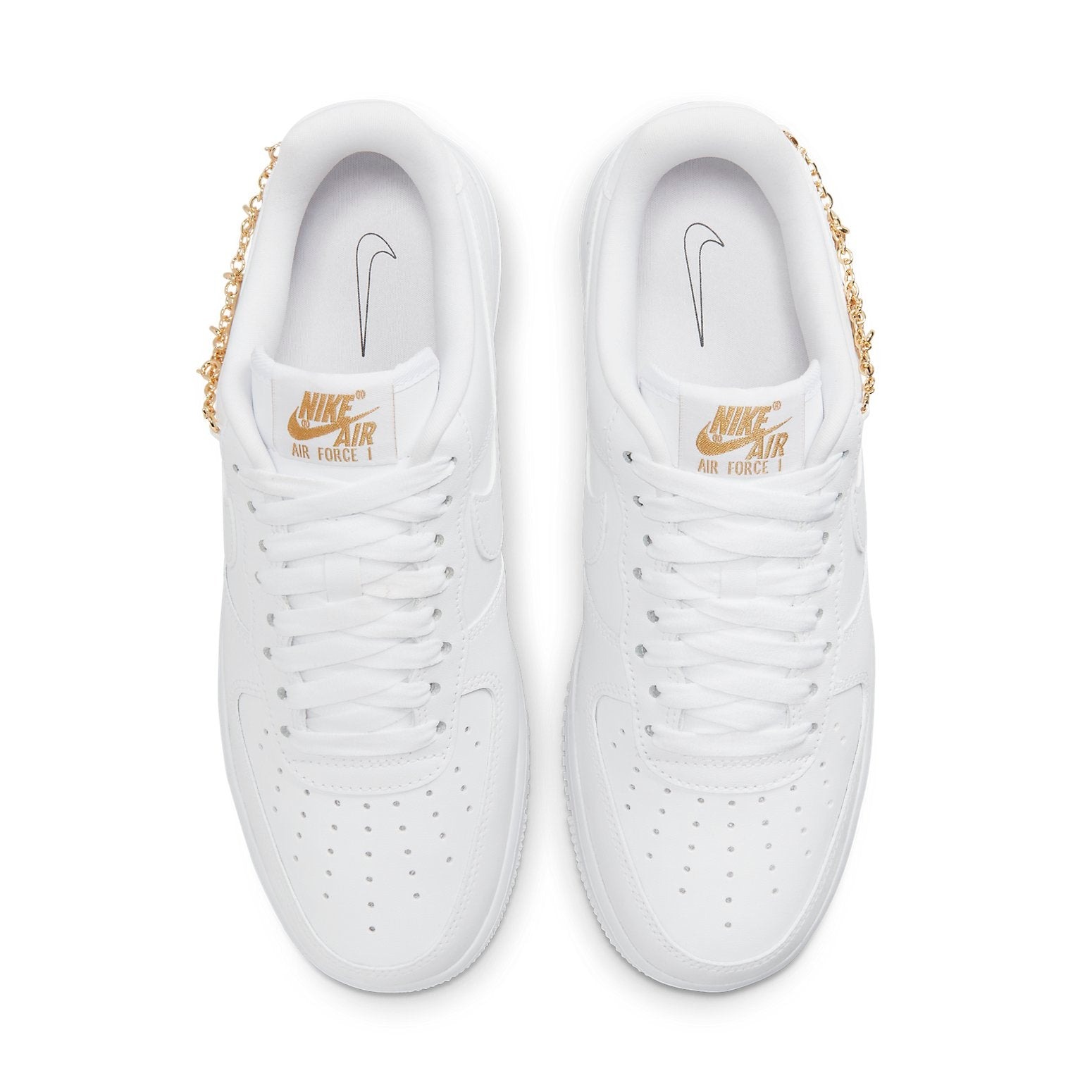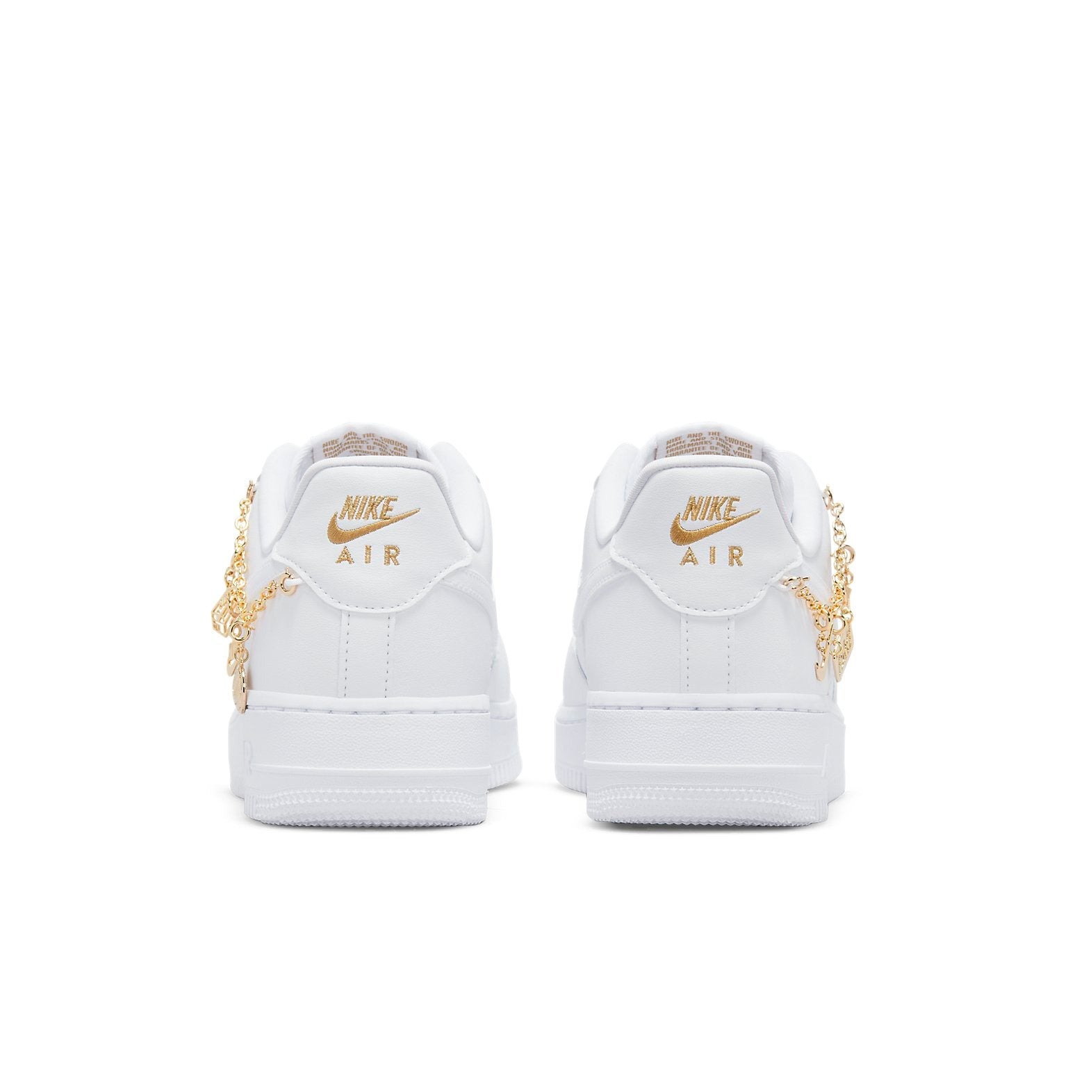 The women’s Nike Air Force 1 Low LX Lucky Charms White (W) features a smooth white leather upper with matching overlays and Swooshes. At the collar, a gold metallic chain with Nike charms pops against the white upper. From there, matching gold Nike Air embroidery at the heel completes the design.The women’s Nike Air Force 1 Low LX Lucky Charms White (W) released in 2021 and retailed for $110.