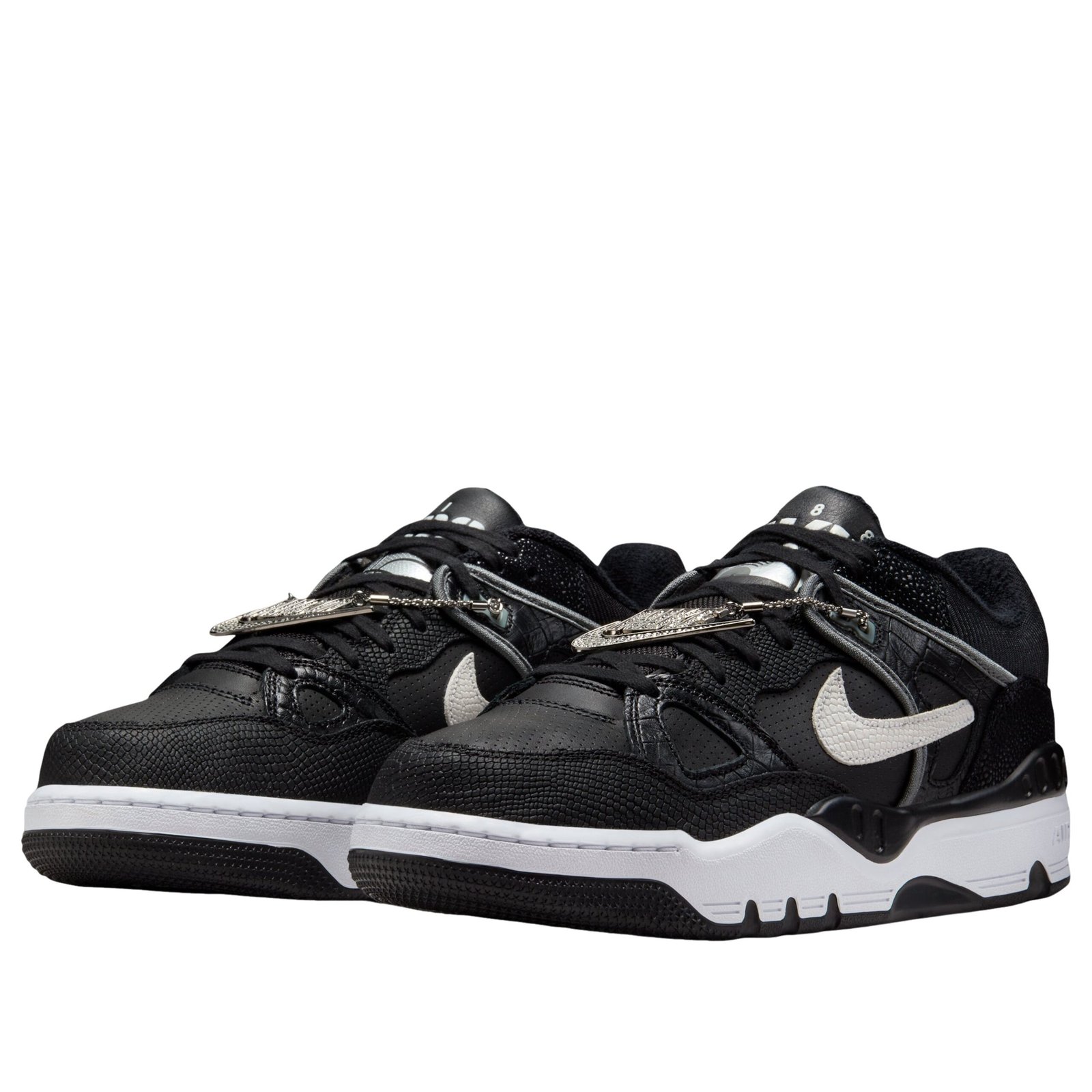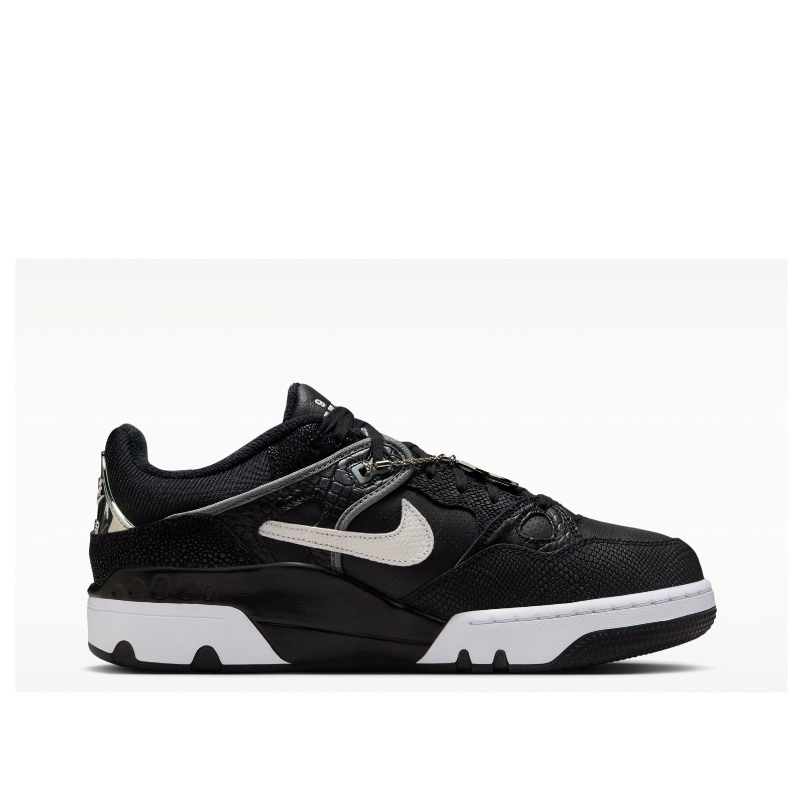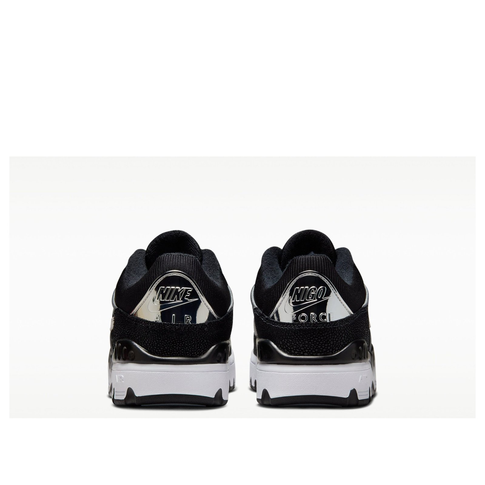 The Nike Air Force 3 Low SP Nigo Black White revives a retro basketball silhouette, reinterpreted through a clean, classic color scheme. The colorway features Black, Smoke Grey, Metallic Platinum, and White. The structured, mid-90s inspired design uses paneled leather construction, with Black dominating the upper. This silhouette is notable for its chunky profile and multi-layered aesthetic, characteristic of late-eighties and early-nineties court shoes. Slated for a release on April 24, 2025, this throwback model carries a retail price of $150. The contrasting White midsole and bright Metallic Platinum details provide clear definition to the aggressive shape. The collaboration ensures a considered material application and an emphasis on the historical significance of the court shoe. Our team praises the successful revival of the structured, multi-paneled retro silhouette, sharply contrasted using Black and White with a touch of Metallic Platinum shine.