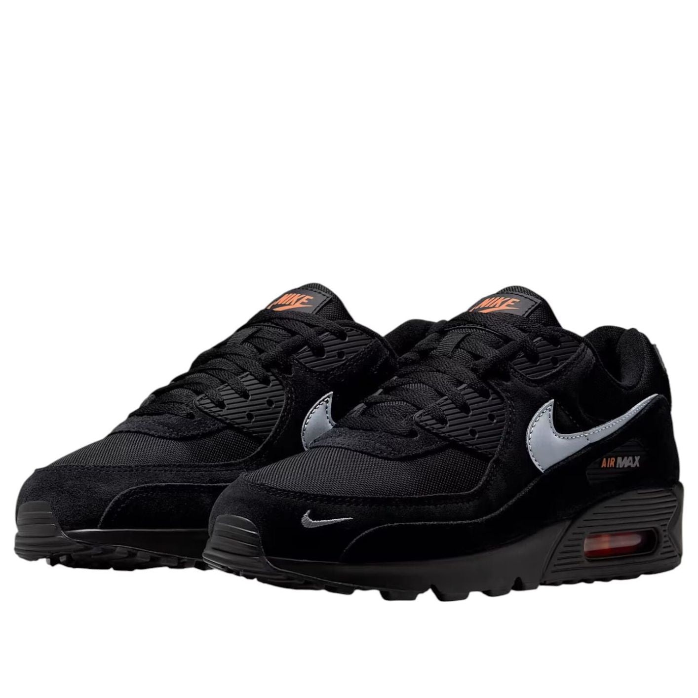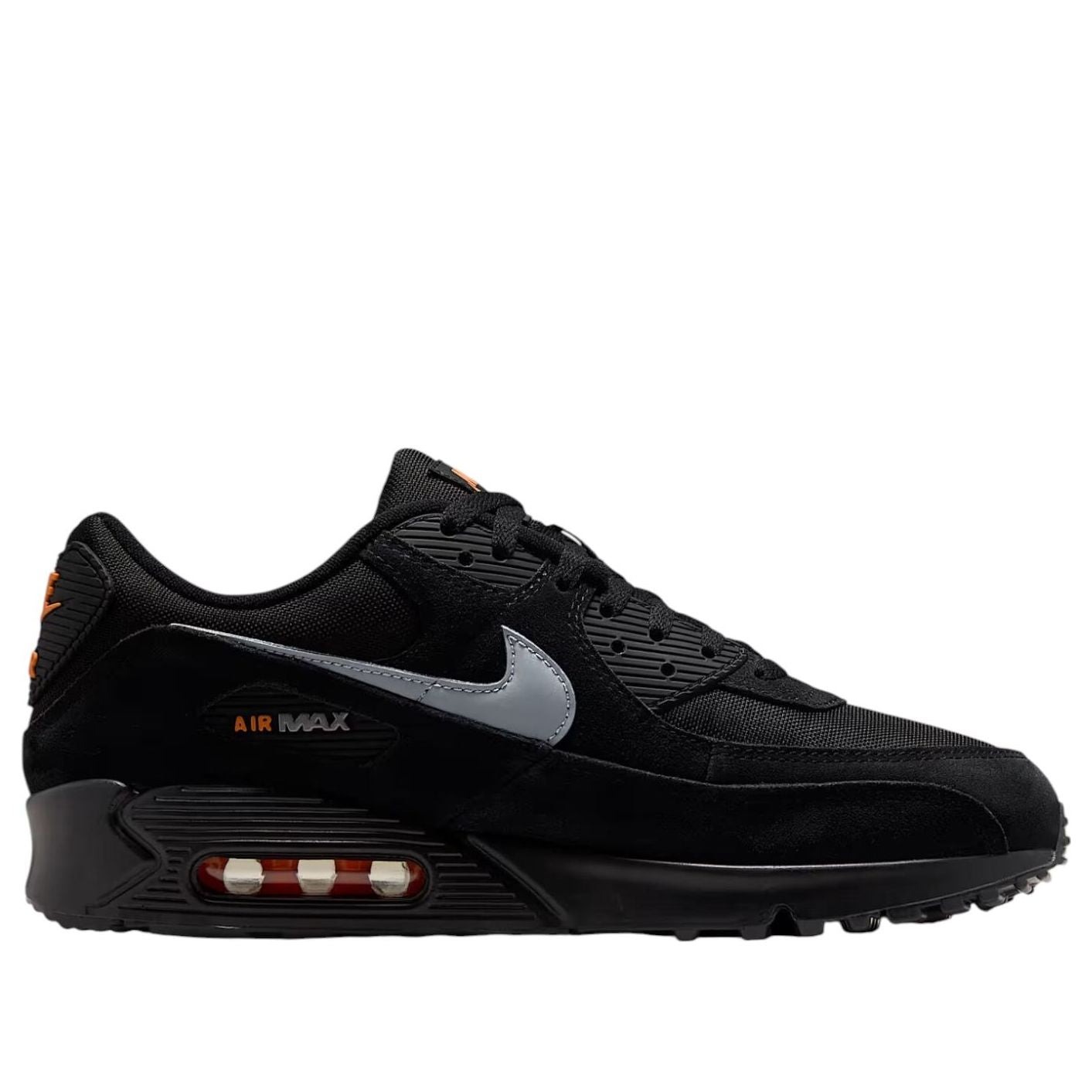 The Nike Air Max 90 Black Metallic Cool Grey Orange features a Black/Metallic Cool Grey/Total Orange colorway. This Nike Air Max 90 was first released for $135 on September 01, 2025.