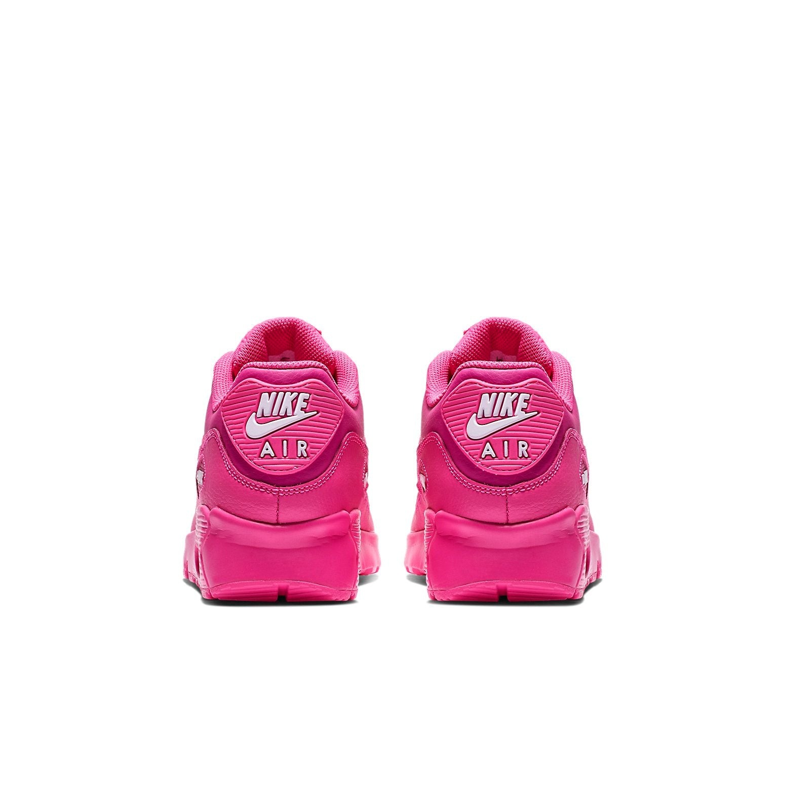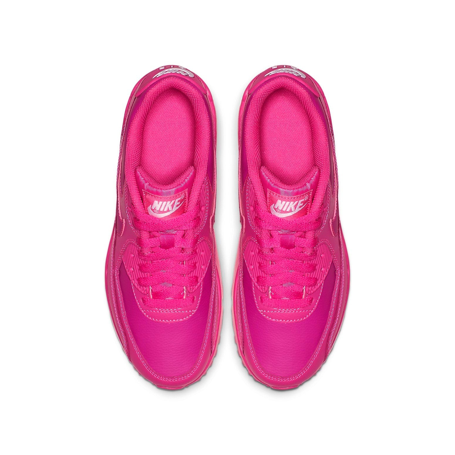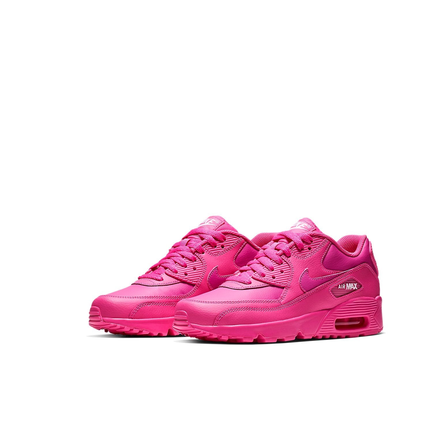 The Nike Air Max 90 Laser Fuchsia (GS) presents a classic silhouette dressed in vibrant monochrome. This sneaker, sized explicitly for grade school-aged kids, pops with style and delivers comfortably.The Laser Fusion Nike Air Max 90 for Grade Schoolers begins with an upper base of fuchsia smooth leather. Overlays of pink leather in a more shade adorn the eyestays, vamp, toe box, mudguard, and heel. A Nike Swoosh that matches the upper base peaks out from between overlays on the side panel. White Nike branding adorns the TPU heel tab, and Air Max branding appears in a TPU cut-out window on the side panel. The tongue with white Nike branding, the laces, the sockliner, and the insole are also fuchsia.The aspect of this sneaker we most appreciate is the high-octane soul unit that made this sneaker so famous. Visible Max Air is housed in a fuchsia foam midsole. This rests atop a fuchsia rubber outsole with waffle pattern lugs that give traction and heritage style. The Nike Air Max 90 Laser Fuchsia (GS) was released on January 15, 2019, for a retail price of $90.