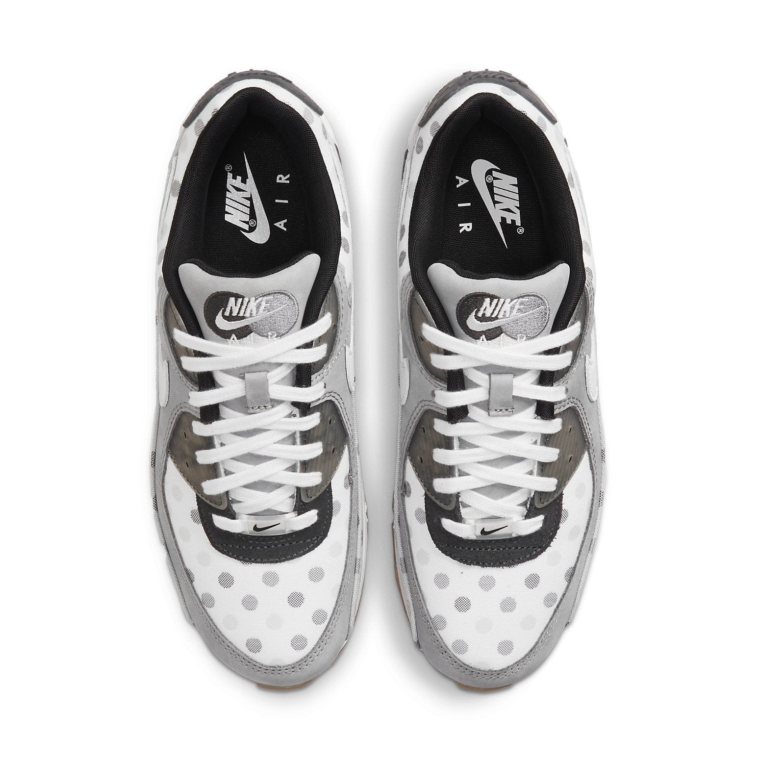 The Nike Air Max 90 White Polka Dot features a white and grey leather, mesh, suede, and canvas upper with small polka dots applied in grey dispersed throughout the design. On the tongue, a Venn Diagram style embroidery is prominent. From there, a gum outsole completes the design. The Nike Air Max 90 White Polka Dot released in July of 2021 and retailed for $150.