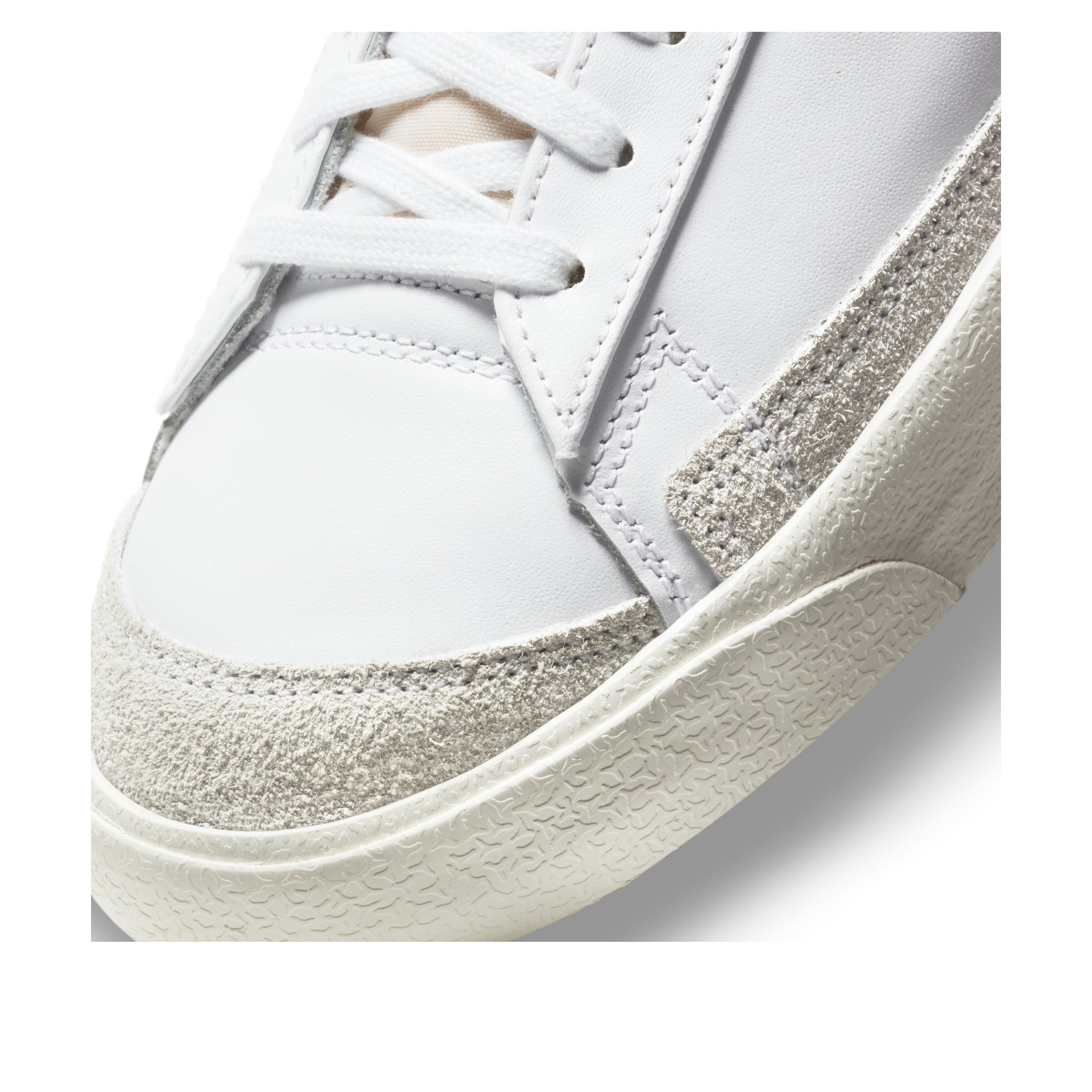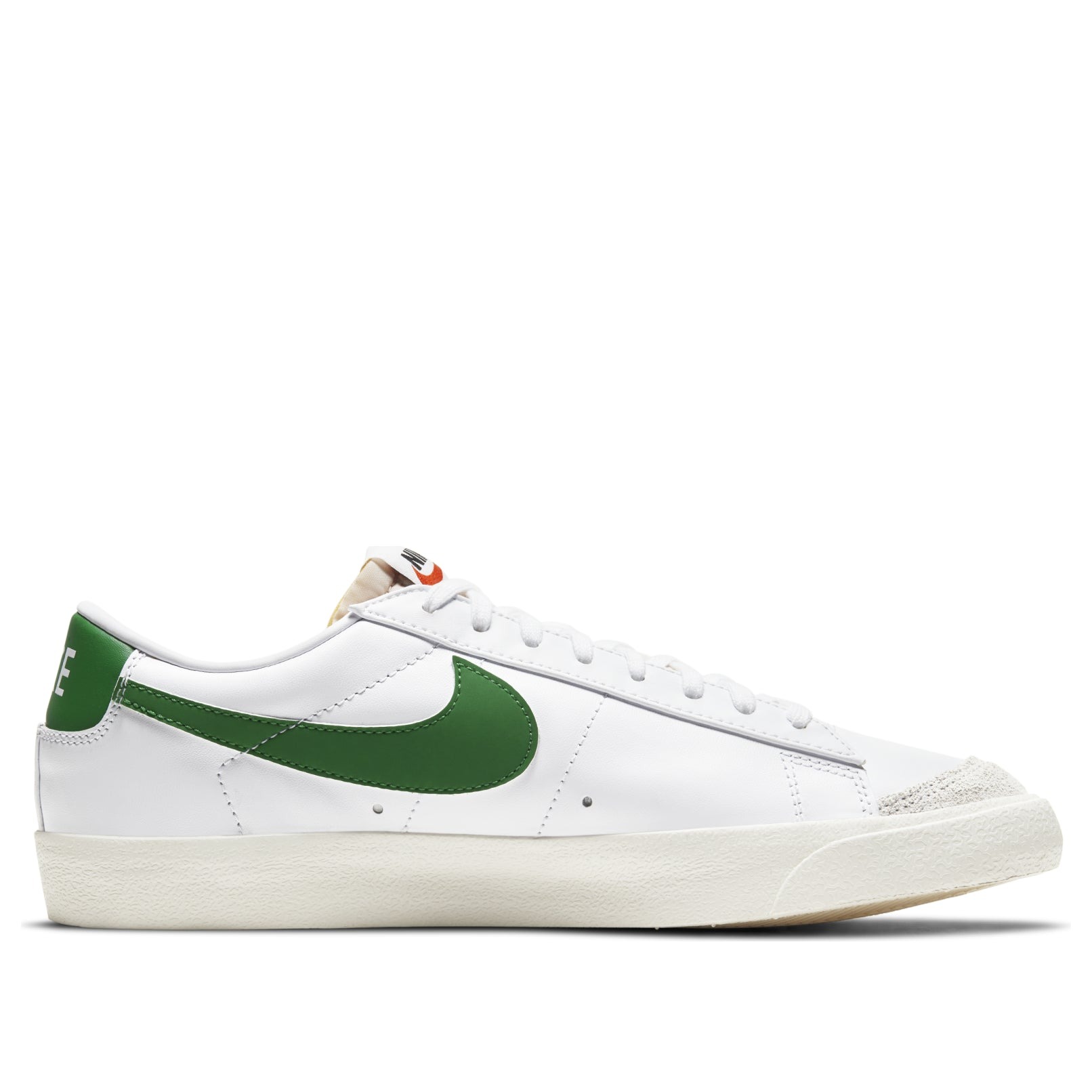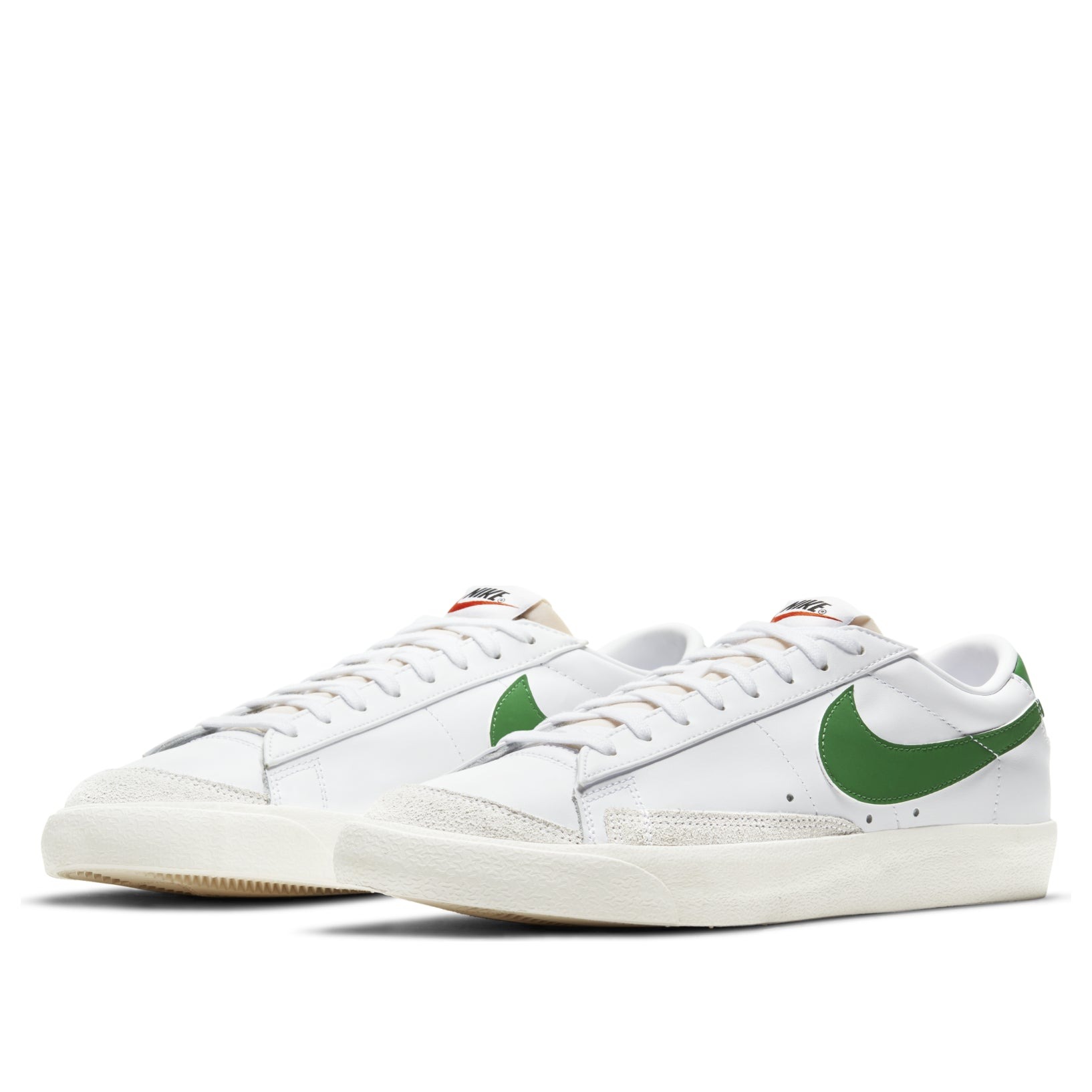 The Nike Blazer Low 77 Pine Green, designed by Bill Bowerman, is a two-toned hue sneaker model reflecting its hardwood court origin.The Blazer Low 77 by Nike has a white leather upper armored by tonal suede toe and lateral forefoot overlays. The shoe Swoosh and heel tab feature a contrasting pine green color engraved with the block inscription of the Nike wordmark. The shoe has a second Nike logo woven on the foam tongue. The sneaker has an off-white rubber midsole. The Nike Blazer Low 77 Pine Green was released in March 2021 at a retail price of $85.