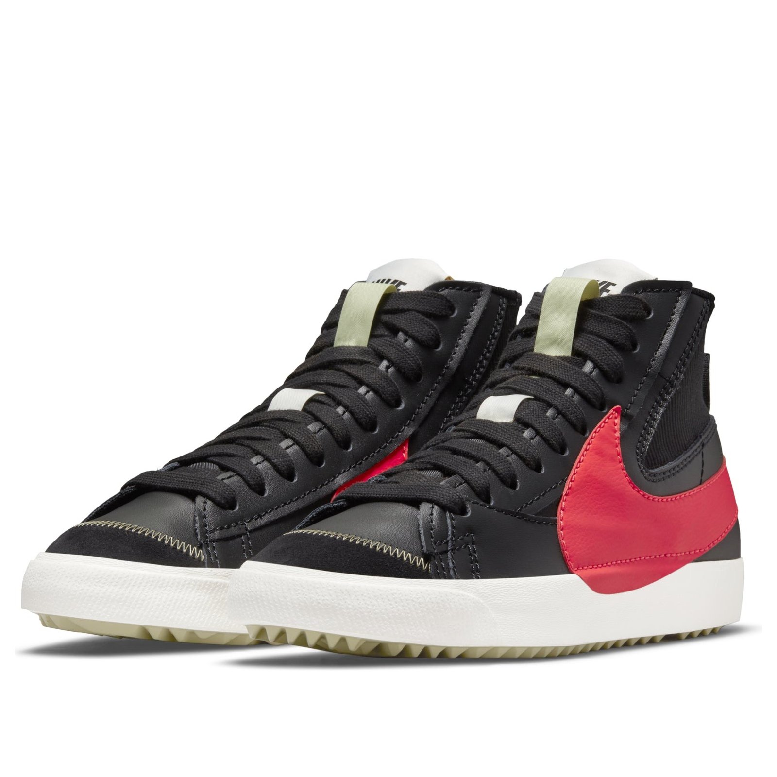 The Nike Blazer Mid 77 Jumbo Black Bright Crimson is a vintage sneaker iteration with an updated colorway. The Jumbo Black Bright Crimson incorporates several silhouettes in its build.Like the original hoops, the Jumbo Black Bright Crimson uses leather and rubber material dressed in a black/bright crimson/Sail/Olive Aura colorway. The upper is crafted from soft leather materials with a sock-like construction on the heel. The sneaker lends itself to SB Dunk styling with an oversized, bright crimson Swoosh that bleeds onto the midsole. A herringbone-patterned outsole decked out in sail colorway sits beneath the white midsole supports the silhouette’s construction. A light neon green tab runs down the throat and ends at the foam-padded tongue, which sports a white coloration. What our experts love about the Mid 77 Jumbo Black Bright Crimson is their leather foundation with a serrated sole for traction. For a fresh twist, a sock-like construction punctuates the leather material for a lightweight yet durable build. The Nike Blazer Mid 77 Jumbo Black Bright Crimson sneakers were released on November 18th, 2021, retailing for $110.