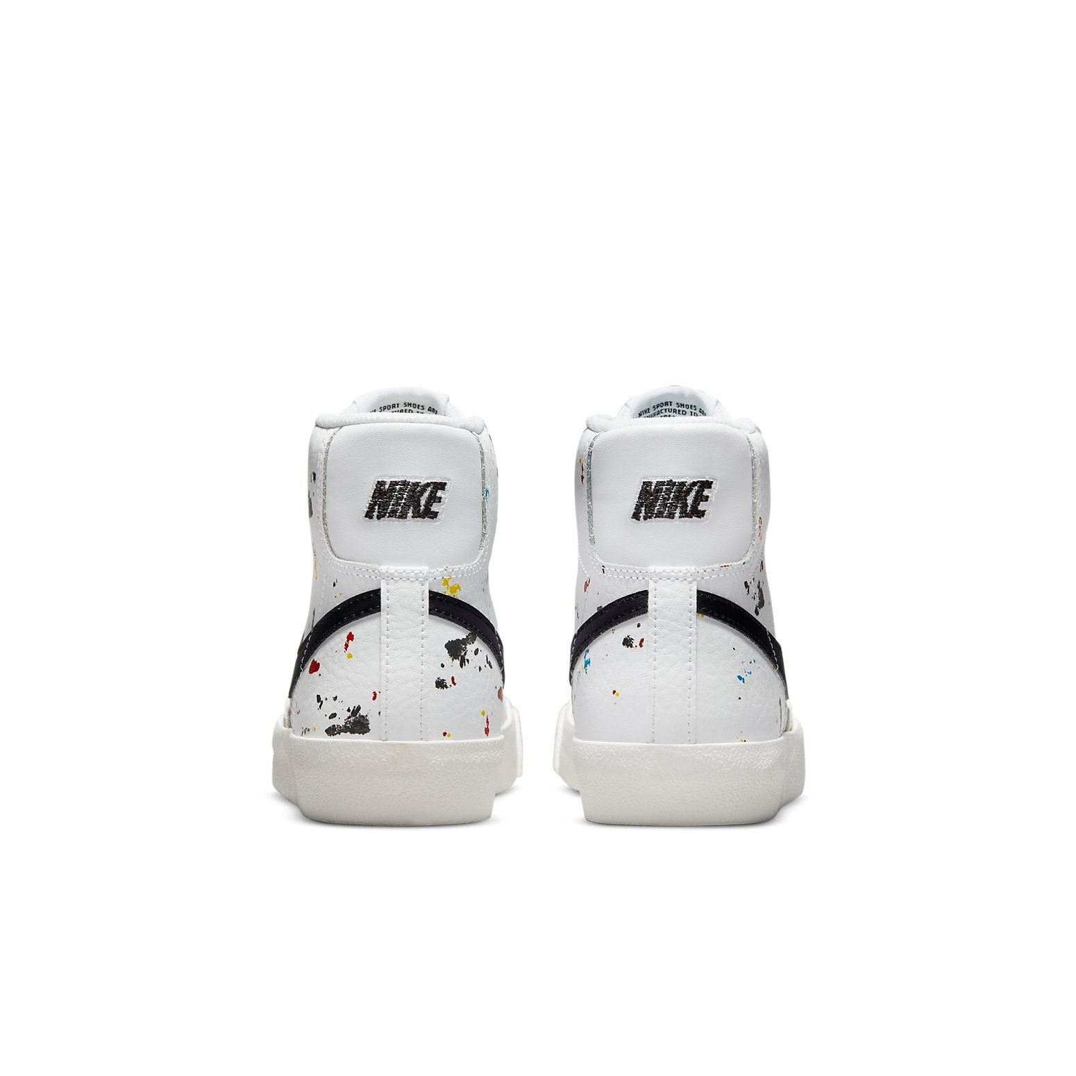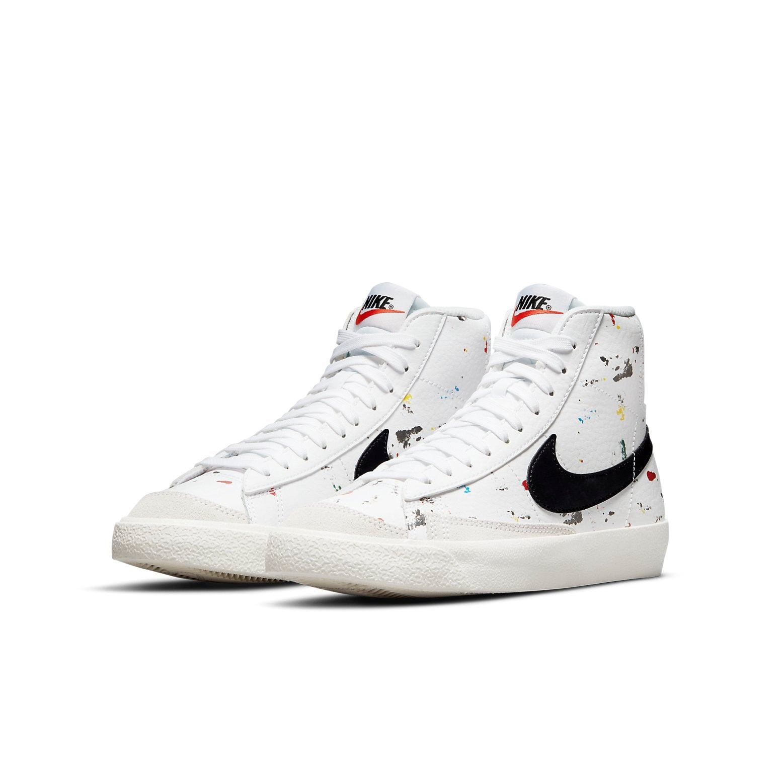 The Nike Blazer Mid 77 Paint Splatter (GS) features a White/White/Sail/Black colorway. This Nike Blazer Mid 77 was first released for $110 on June 04, 2021.