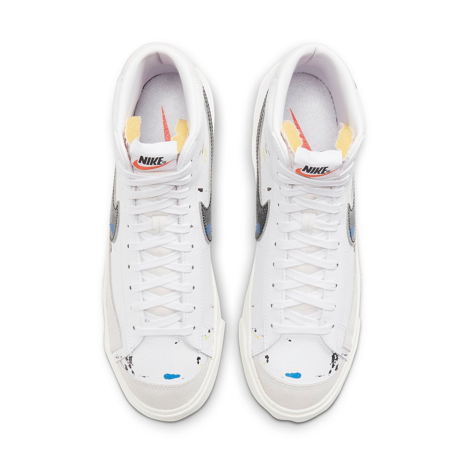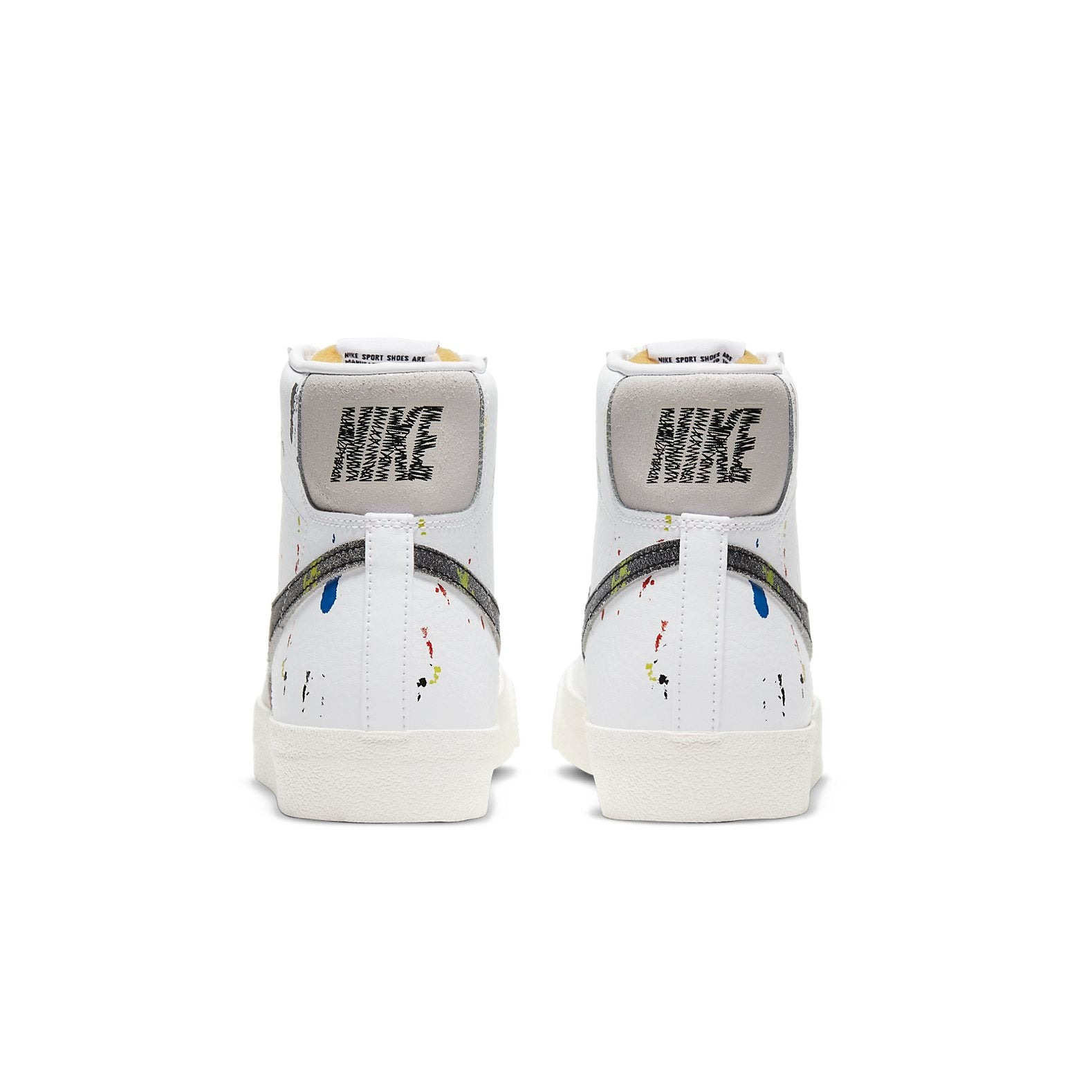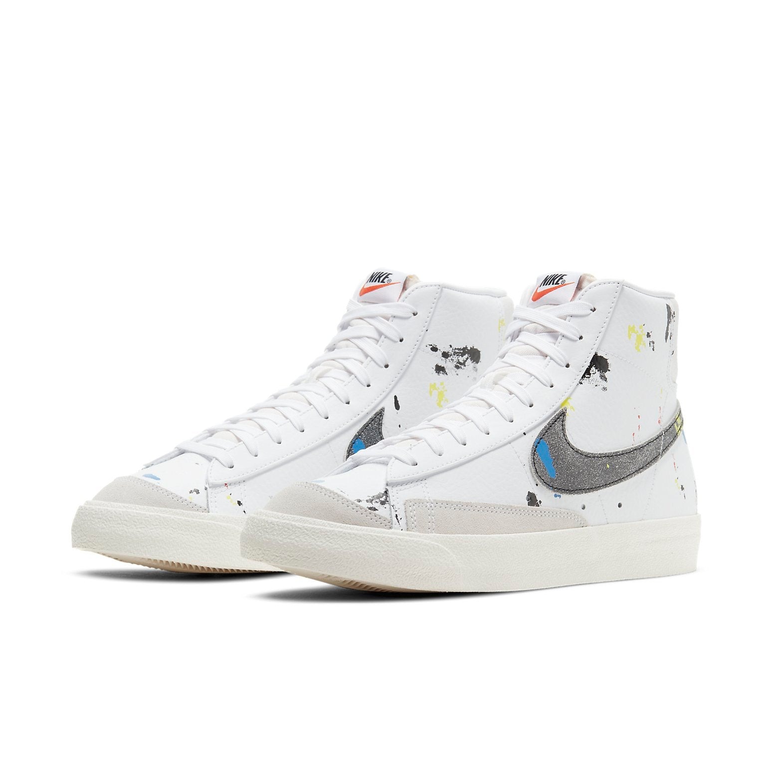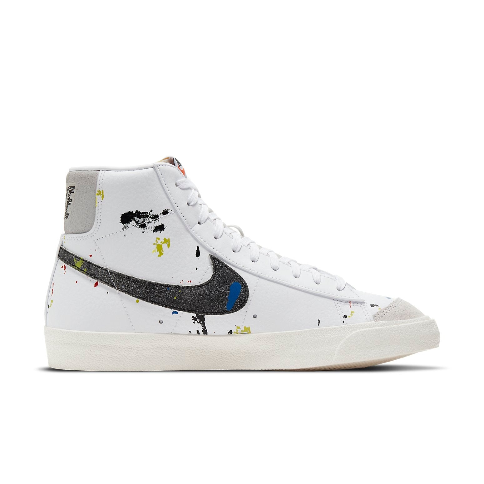 In the Nike Blazer Mid 77 Paint Splatter colorway, the piping, mudguard, and heel patch comes draping in white leather accents and grey suedes. Paint splatters in the colors of blue, black, yellow, and red on the heel, toe box, and side panels giving the sneaker its distinctive look. The open foam tongue, which makes a nod to the earliest tennis shoes, is a crucial component. A faded-black Swoosh contrasts the white design in addition to the vivid hues. Its heel tab features a huge faded Nike text logo, while the tongue is adorned with a Nike wordmark and Swoosh. Rounding out the sneaker is the herringbone traction outsole and foam midsole.Our experts think the distinguishing feature of this Mid 77 is the paint splatter detailing on the upper. This artistic touch adds a unique and eye-catching element to the design. The Nike Blazer Mid 77 Paint Splatter was released on 23rd April 2021 and retailed at $100.
