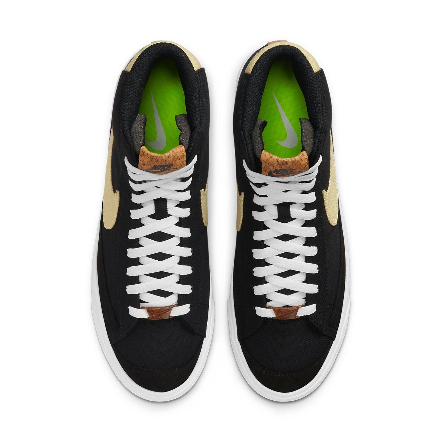 The Nike Blazer Mid 77 Pomegranate features a Black/Solar Flare/White/Black colorway with a pomegranate on a branch embroidered on one side. The upper is made of black canvas with a light beige canvas Swoosh and tab on the top of the heel that includes information about the pomegranate. A pinkish cork-like material appears on the heel and the tongue. The outersole is brown rubber with a chevron pattern and the midsole is white. The white laces feature a brown rubber-like tab with a Swoosh. The Nike Blazer Mid 77 Pomegranate was released on April 29, 2021, at a retail price of $110.