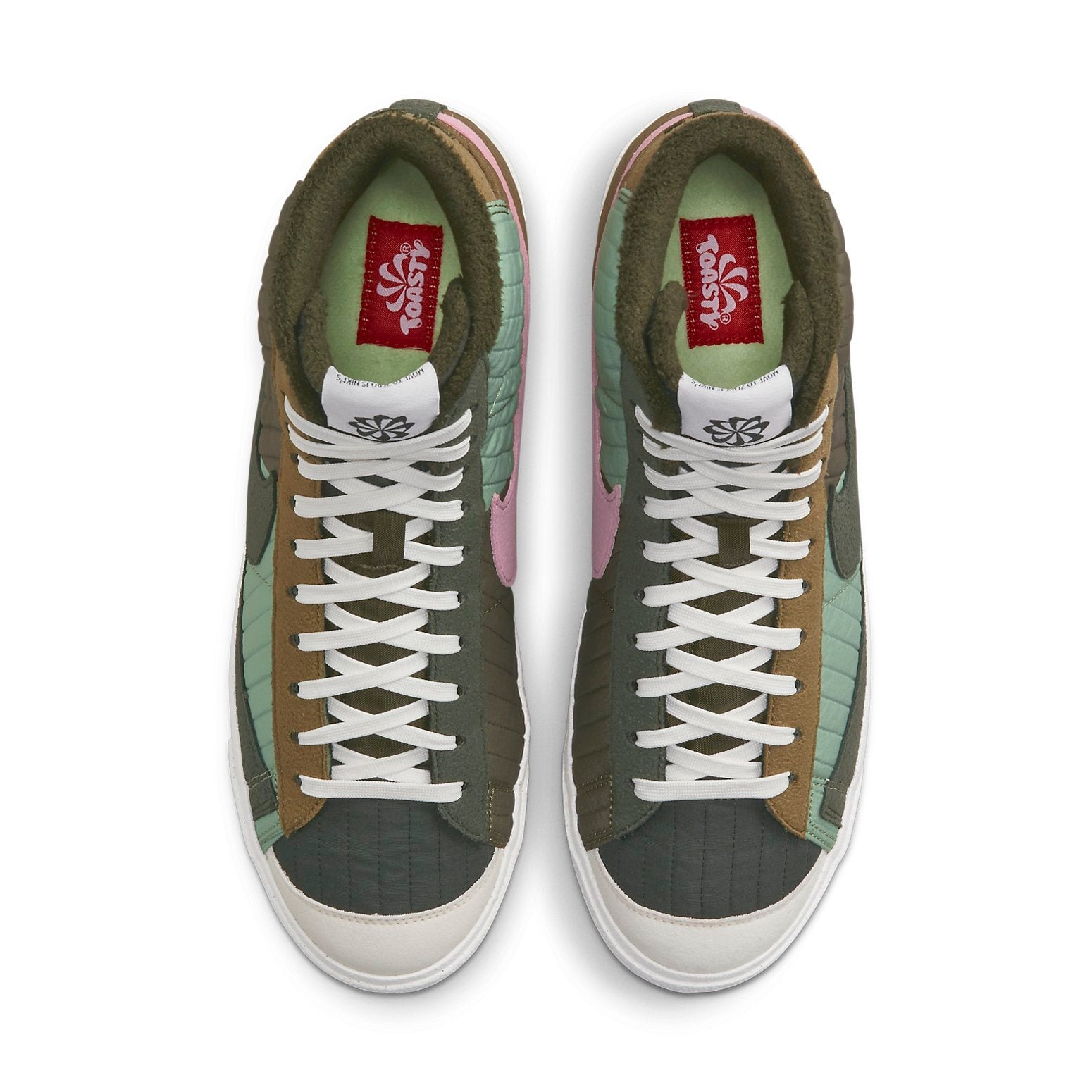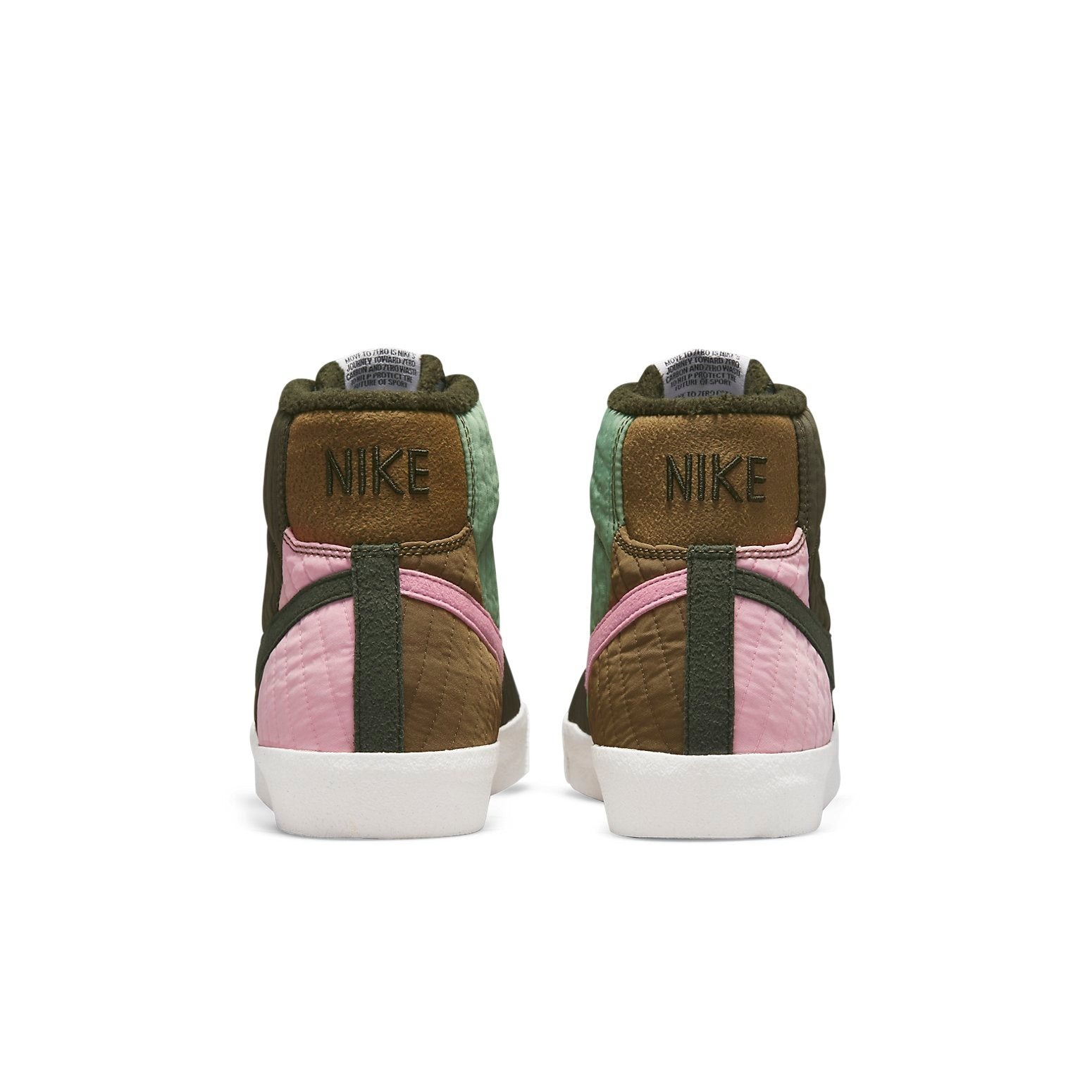 The retro basketball and lifestyle shoe known as the Nike Blazer Mid 77 Premium Toasty Sequoia Quilted features a winter-ready colorway and an eco-friendly updated design.The shoe’s upper consists of quilted fabrics and is partially recycled material by weight, granting it the silhouette of winter gear. The appearance of the cream rubber midsole clashes with the asymmetrical panels in brown, green, pink, and tan. Both sides have an olive-green textured Swoosh, while the heel features black « Nike » branding. The shoe’s multicolored look is contrasted by white laces. The pinwheel image on the shoe’s brown tongue tag alludes to its eco-friendly construction. The insole features a cute « Toasty » design that makes fun of the cozy fleece inside.What experts love is the tongue of the Nike Blazer Mid 77 Premium Toasty Sequoia Quilted that conveys the « Move to Zero » Pinwheel insignia, emphasizing that sustainable materials were used in this model’s manufacturing. The sneaker was released on November 10th, 2021, at $110.