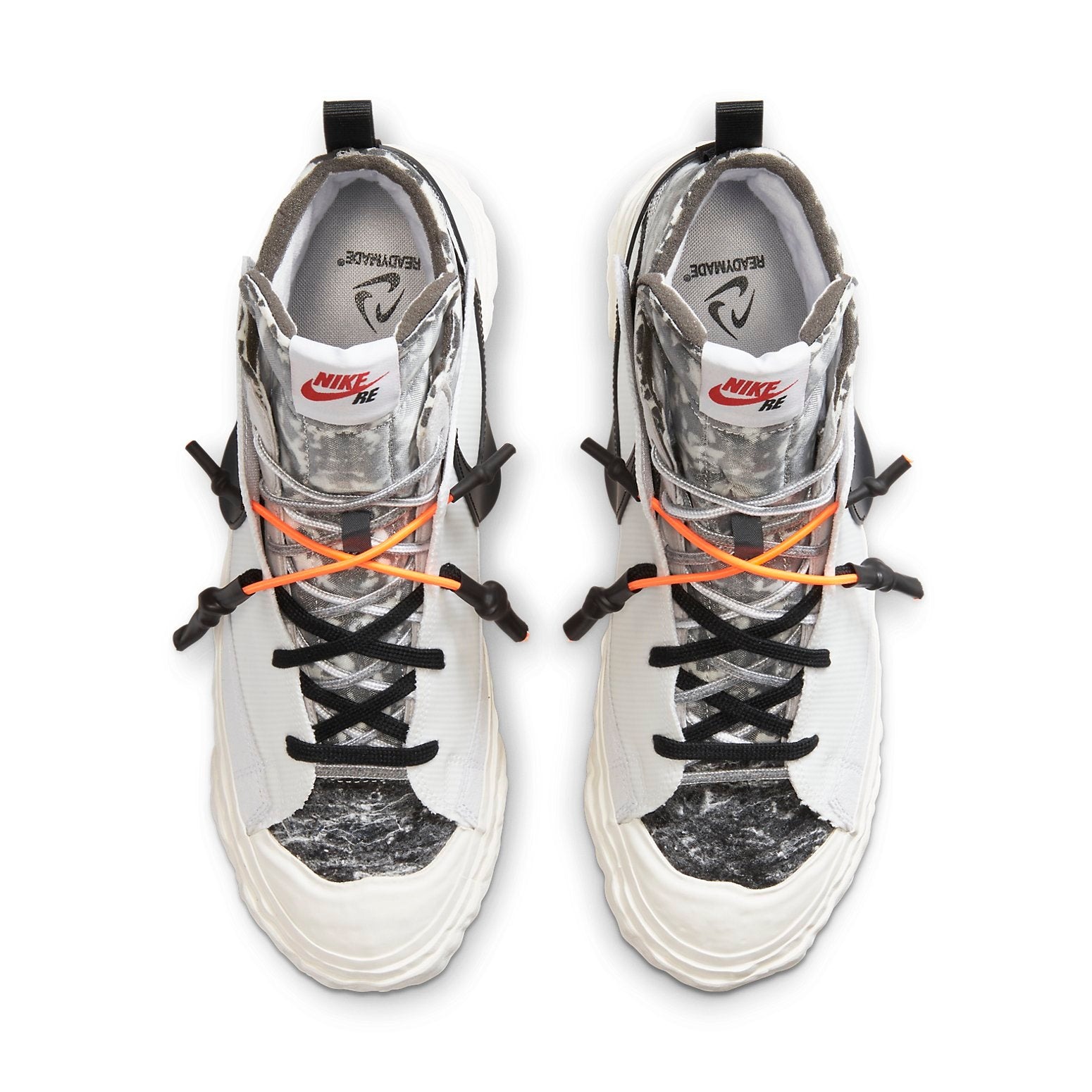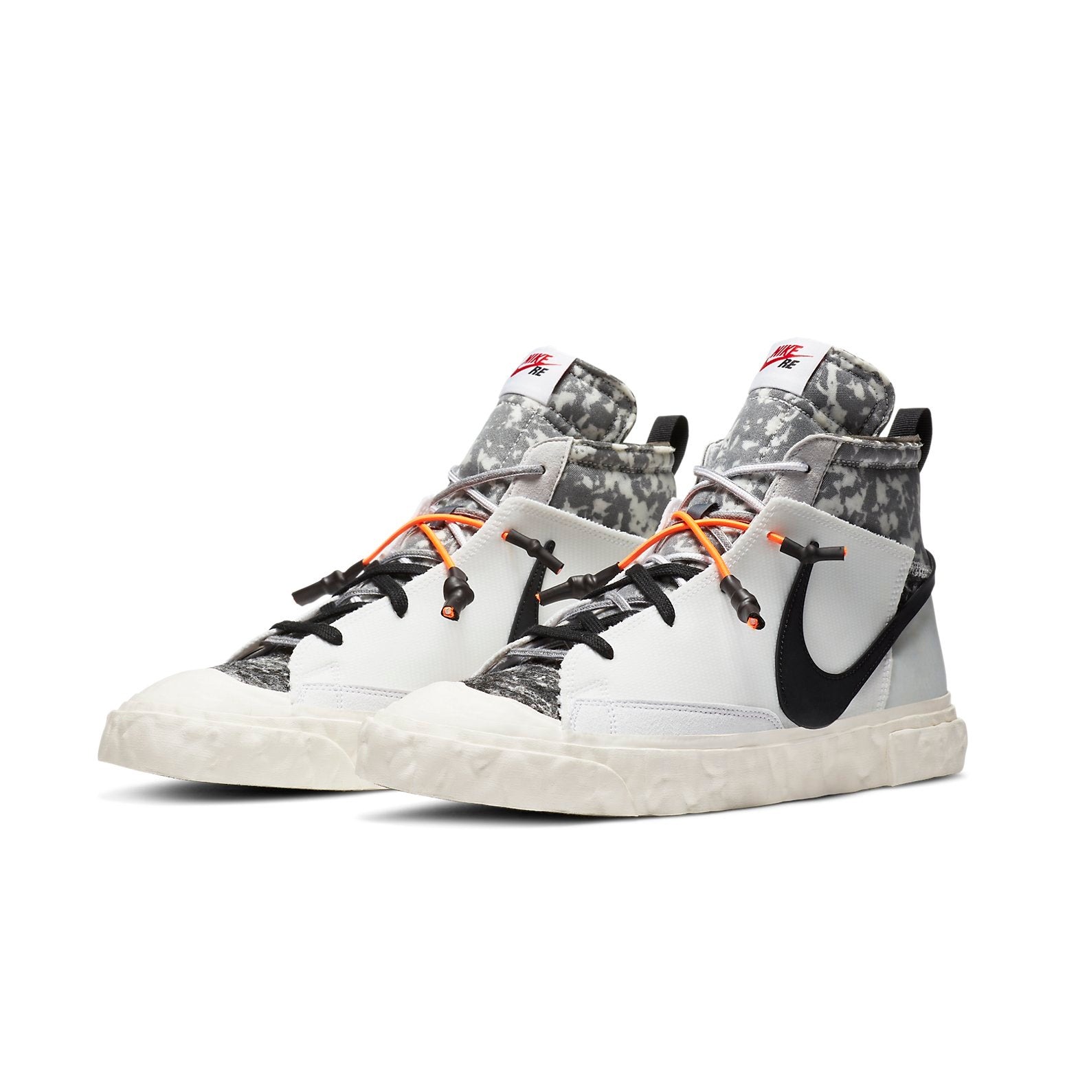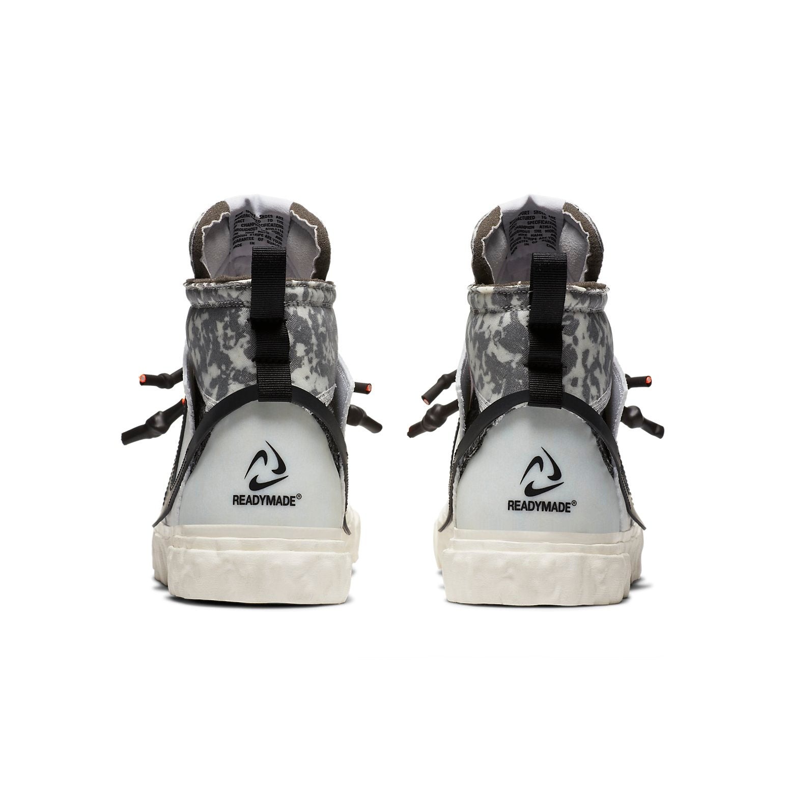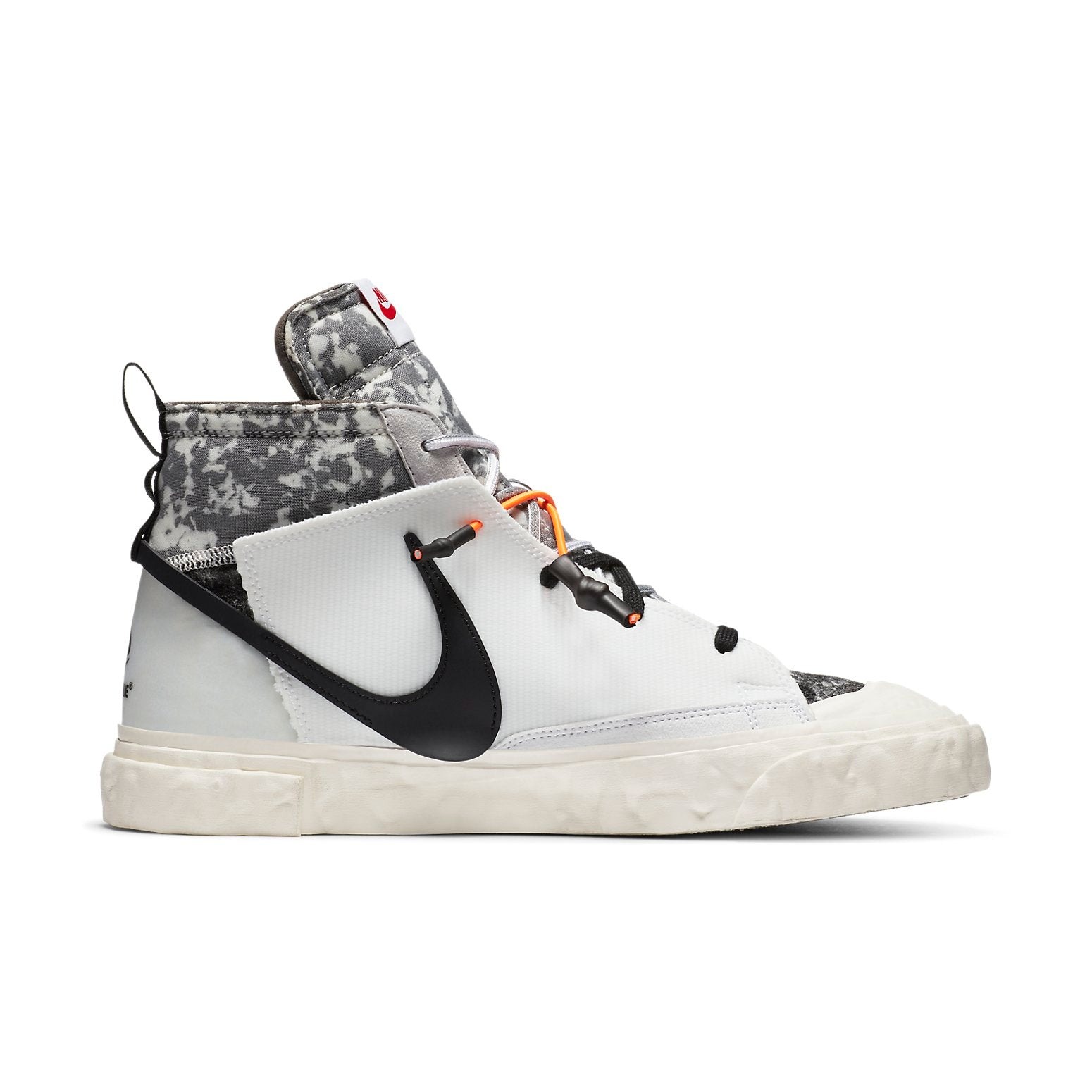 The Nike Blazer Mid READYMADE White features multiple colors with white, orange, volt, as well as vast grey being the dominant colors.These Mid READYMADE sneakers in White by Nike feature fabric overlays on their leather upper that is almost entirely white. The collar and tongue of this shoe boast exposed foam and graphics that are camouflage-inspired. The sneaker features also an angular midsole with standard Nike foams midsoles and Nike Grind rubber soles.The Nike Blazer Mid READYMADE White made its debut for the first time on 27 February 2021. It had a suggested retail price of $160.