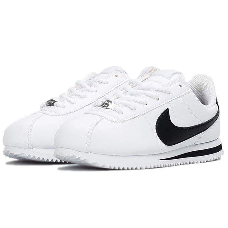 The Nike Cortez Basic White Black (GS) is an added colorway to the Nike Cortez line, and was designed for grade schoolers. The upper material of the Cortez Basic White Black is made up of a combination of genuine leather and synthetic materials, providing durability and breathability. Its leather toebox adds extra support and protection. The shoe has a lace-up design with a padded collar and tongue, providing a secure and comfortable fit. Its EVA midsole offers great cushioning and shock absorption, protecting your feet from impact and strain during energetic activities. It also features a herringbone rubber outsole, which provides excellent traction and grip on different surfaces. Our experts love the Nike Cortez Basic White Black (GS) for its streamlined and simplistic design. Its white colorway with minimal black detailing gives it a clean and sophisticated appearance. The shoe was released on January 1st, 2018, at a retail price of $60.