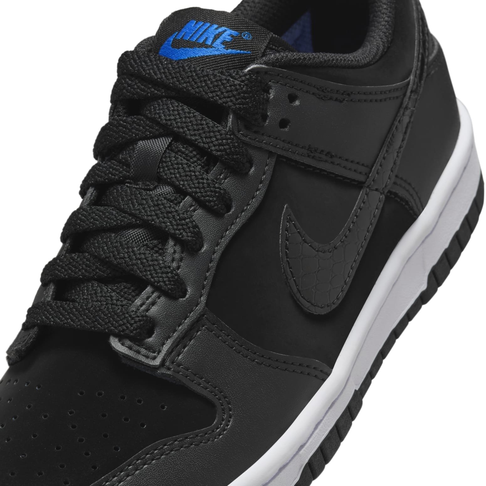 The Nike Dunk Low Black Croc (GS) features a Black/White/Game Royal colorway. This Nike Dunk Low SE was first released for $90 on July 18, 2024.