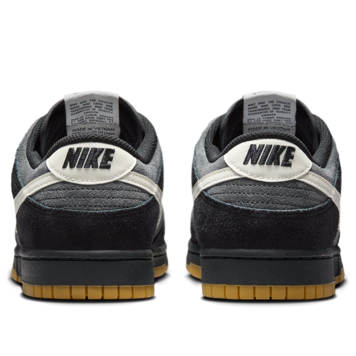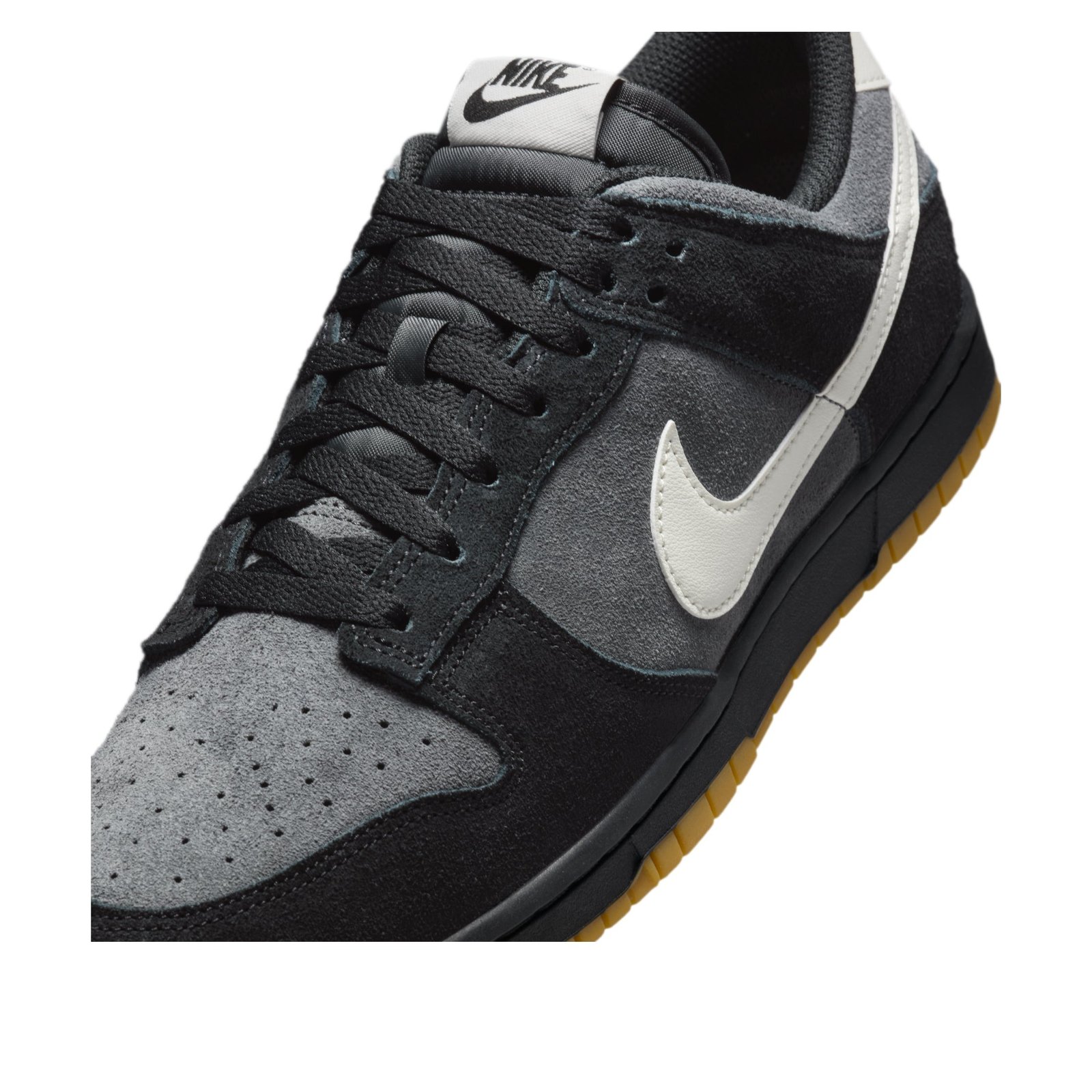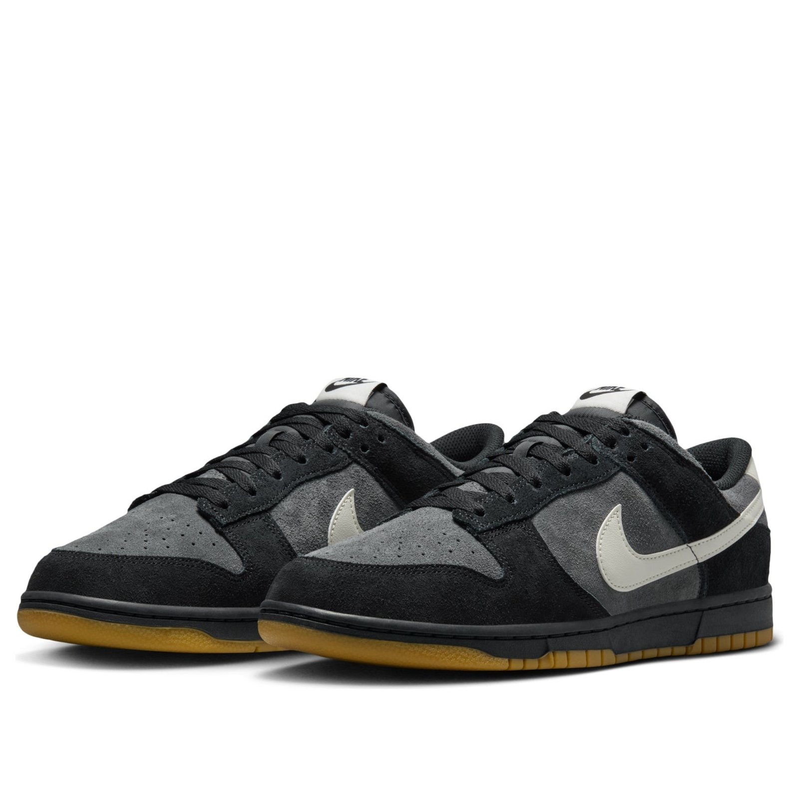 The Nike Dunk Low SE Black Grey Gum is a low-top shoe with a color-blocking design made with a mix of materials. This iteration of the Nike Dunk Low SE has a base of dark Grey suede that forms the perforated toe box, the ankle area, and the sides. Black overlays form the toe cap, eyestays, and ankle strap that runs down around the heel. The Nike Swoosh adorns both sides as a white leather overlay, and the heel collar is white with embroidered black Nike branding. The tongue also contains a white Nike logo patch. The midsole is black, while the outsole is a classic gum rubber for traction. What stands out about this shoe is certainly the white Nike Swoosh on each side, which provides a nice contrast against the otherwise dark build. The Nike Dunk Low SE Black Grey Gum was released on January 6, 2025, for $125.