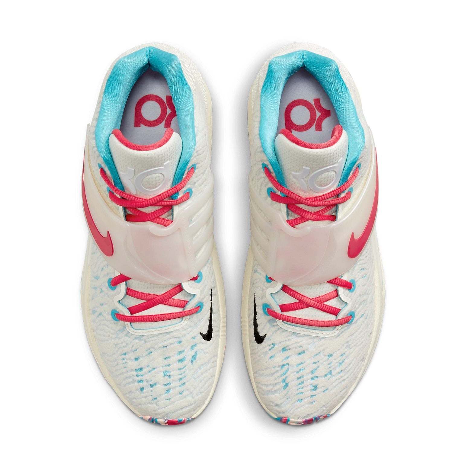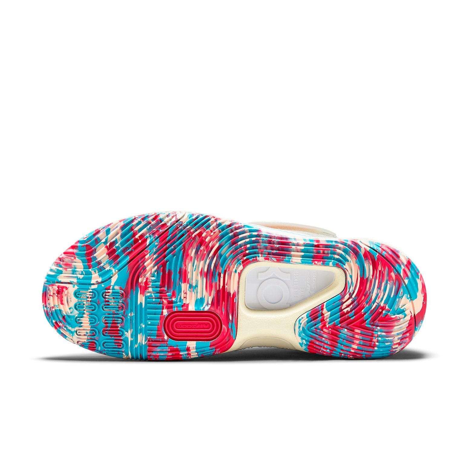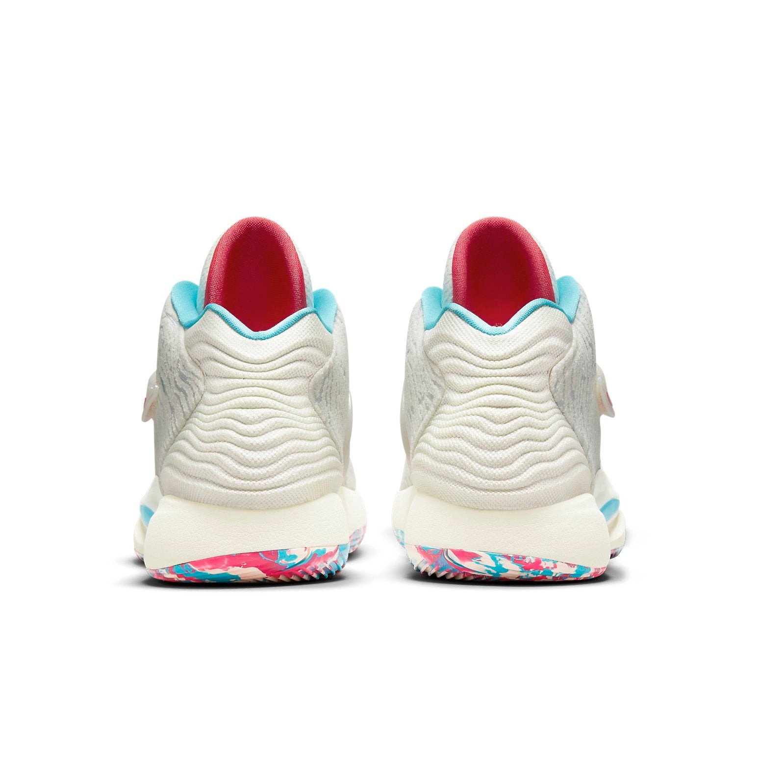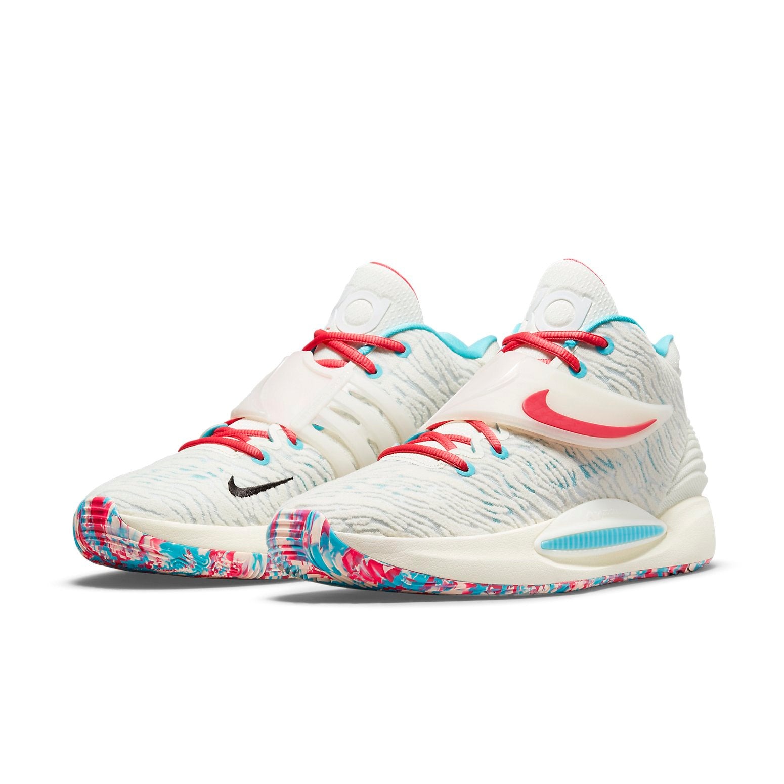 The Nike KD 14 Multicolor is part of a series of basketball shoes designed in collaboration with Kevin Durant.The KD 14 Multicolor has a multicolor design that includes a mix of colors, including Cyan and pink. The shoe has a breathable upper made with mesh and a durable synthetic overlay that supports the foot. The shoe’s tongue and collar are also padded, which adds to the shoe’s overall comfort. The midsole is made of Nike’s React foam technology, which provides excellent cushioning and shock absorption. The outsole of the shoe is made of durable rubber, and has a herringbone pattern that provides excellent traction on the court. We think that the notable feature of the Nike KD 14 Multicolor is its strap. The strap is made of a hard, molded plastic material and extends from one side to the other. The material used for the strap is strong and resistant to wear and tear, which makes it ideal for use in a basketball shoe. The Nike KD 14 Multicolor was released on July 24th, 2021, at a retail price of $150.