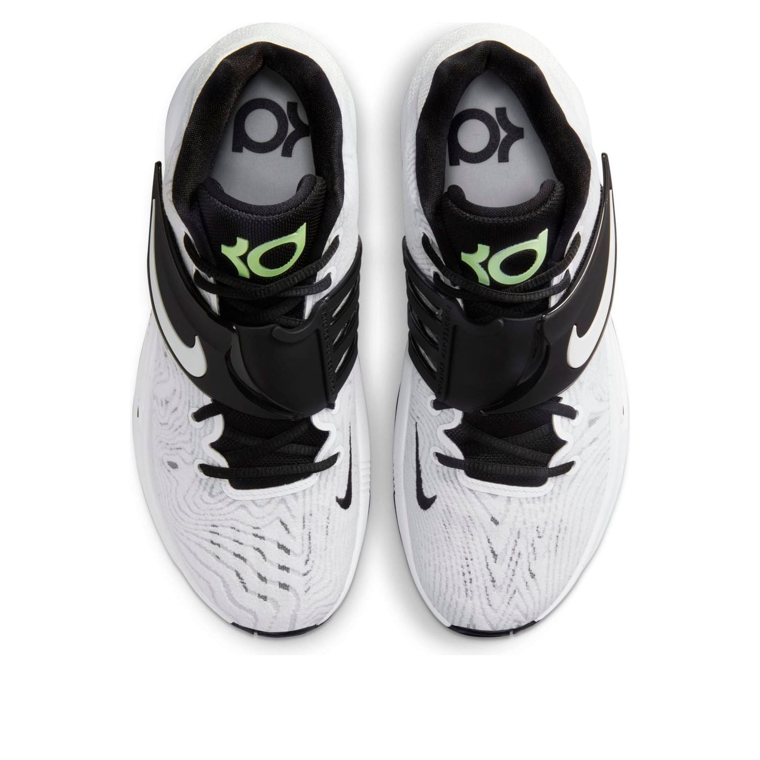 The Nike KD 14 TB White Black is part of Kevin Durant s 14 edition with Nike. While other Nike KD 14 TB variations come in team-based colors, the « White Black » iteration offers a neutral colorway that does not align with a particular sports team.The multi-layer mesh upper features a pattern resembling a fingerprint or a tree s rings. A sturdy, synthetic strap secures the foot while adding contrasting styling. The lateral side of the strap displays the signature Nike Swoosh, while the medial side boasts a 4-slate configuration that promotes breathability and flexibility. The sneaker houses a full-length Zoom Air unit and Cushlon foam cushioning designed to absorb impact.Our Newsole experts love the subtle, black Swoosh on the medial side of the sneaker. It adds additional branding without distracting from the shoe s minimalist design. The Nike KD 14 TB White Black was released on September 7, 2021, and retailed at $130.