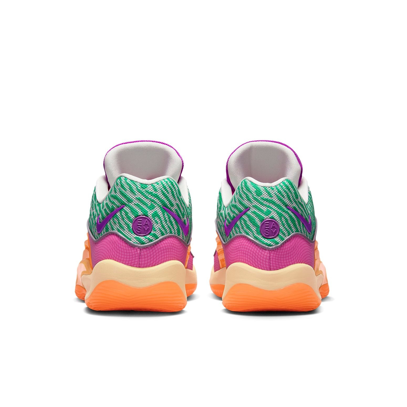 The Nike KD 16 All-Star is an athletic shoe featuring a mesh upper with green tiger print, complemented by blocks of magenta.Designed for the 2024 NBA All-Stars, Nike has created a special colorway for the Nike KD 16 collection, in honor of Phoenix Suns player Kevin Durant. Known as Easy Money because of his ability to effortlessly score points on the basketball court, the KD 16 pays homage to this nickname beneath the orange overlay. A holographic disc appears on the tongue tab, bearing the initials KB in dollar bill print. Kevin Durant branding appears as his name and number visible beneath semi-opaque overlays in Orange TPU, which extend to form the outsole. A yellow midsole and Nike Swooshes in purple at the heel complete the look. Our experts feel that the best feature of the KD 16 is its vibrant color palette, which is eye-catching and unique. The Nike KD 16 All-Star released on February 16, 2024, and retailed at $160.