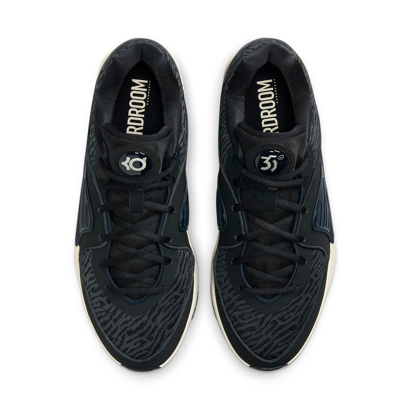 The Nike KD 16 NRG Boardroom is a singular, eye-catching sneaker designed in collaboration with NBA star Kevin Durant. This Kevin Durant Energy low top begins with a patterned mesh base in undulating strips of black and gray that gives this sneaker lightweight breathability. Black synthetic nubuck overlays course across the shoe, from the heel tab to the toecap, providing dynamic style and overall foot support. TPU midfoot wings in black offer midfoot containment. The Coconut Milk-colored cushion midsole houses Zoom Air for springy cushion and energy return, while the black rubber outsole is patterned with grooves and circles for multi-directional traction on the court. What we love the most about this sneaker is the meaning behind its hits of branding. The tongue tag on the left shoe says 35V, which is the investment in the media company founded by Kevin Durant and his agent. The Nike KD 16 NRG Boardroom was released on November 1, 2023, for a retail price of $160.