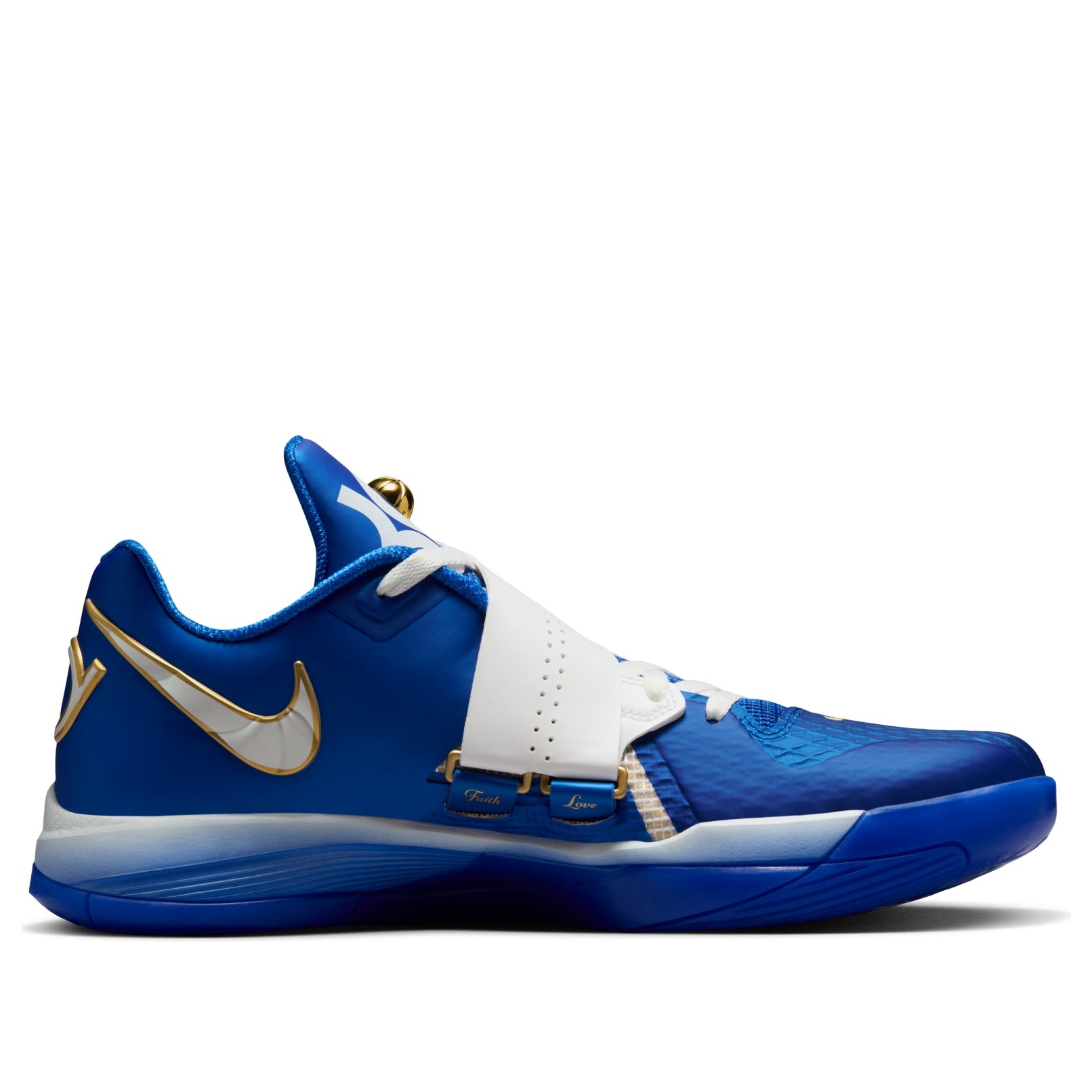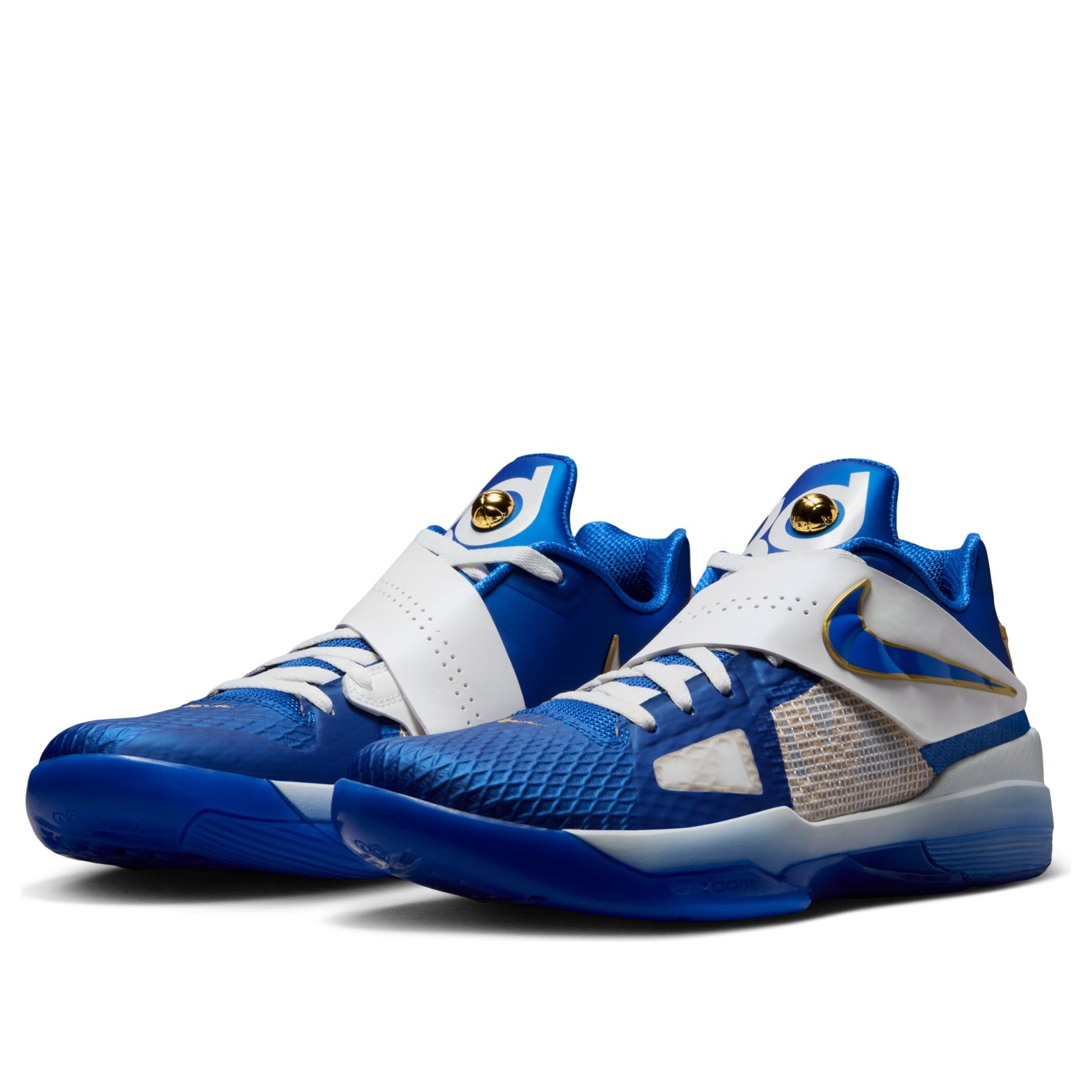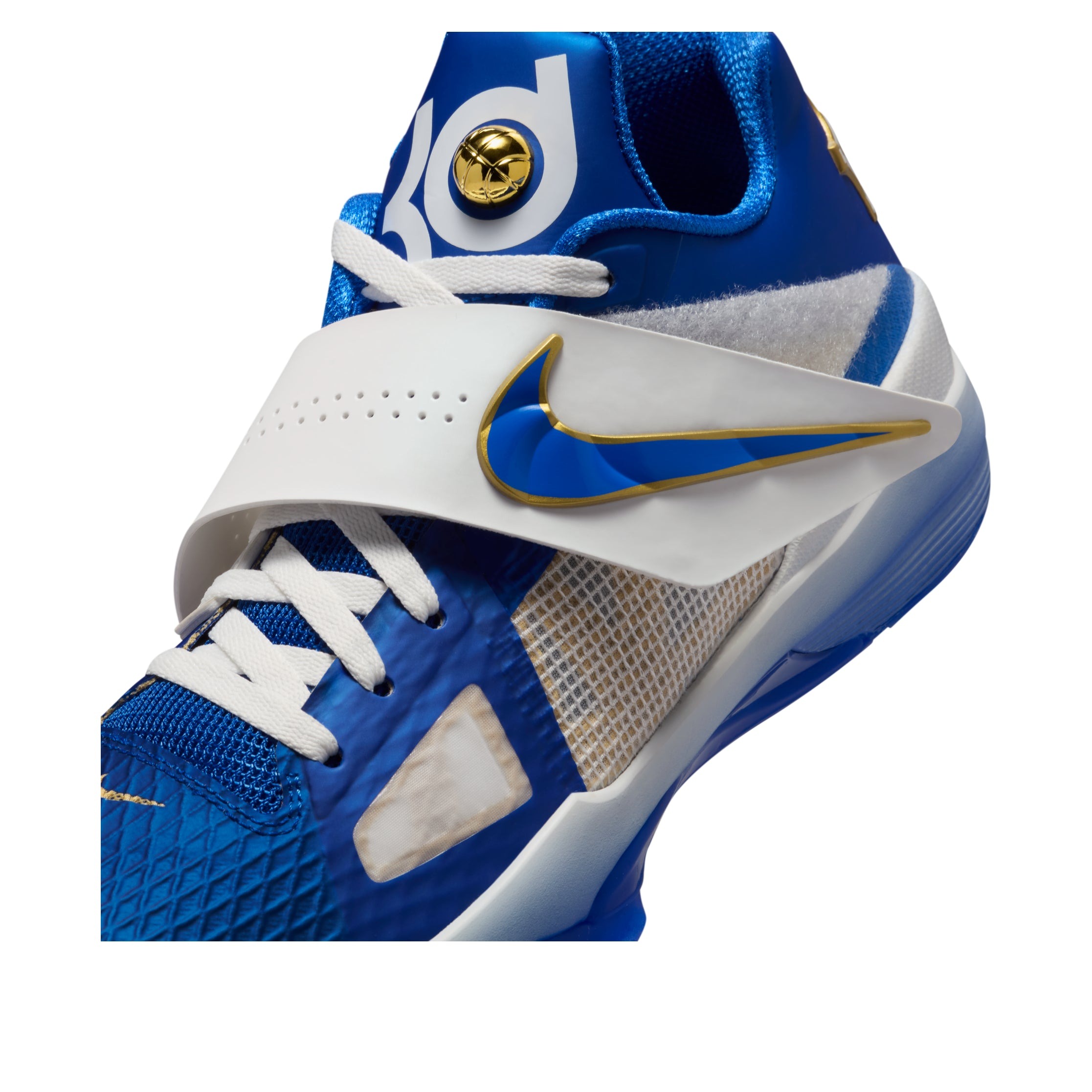 The Nike KD 4 MVP is a colorway from NBA superstar Kevin Durant s fourth signature sneaker, that pays homage to his MVP season with the Oklahoma City Thunder. In this lightweight Nike KD 4, a hyper royal upper with summit white and luxe metallic gold accents that celebrate Durant s MVP season with the Thunder. Constructed with Nike s Hyperfuse technology, a white Swoosh adorns the medial side, while the summit white midfoot strap has air perforations with a hyper blue Swoosh. Metallic gold accents appear as strap buckles, outlines on the Swooshes and on the heel branding. A gradient blue midsole completes the look. We think a standout element of the Nike KD 4 MVP is the raised metallic gold basketball embedded in the tongue, nestled within the KD logo. This detail feels like a miniature trophy and a tactile nod to Durant s MVP status and championship legacy. This sneaker originally retailed for $130 when it was released on February 18, 2025.