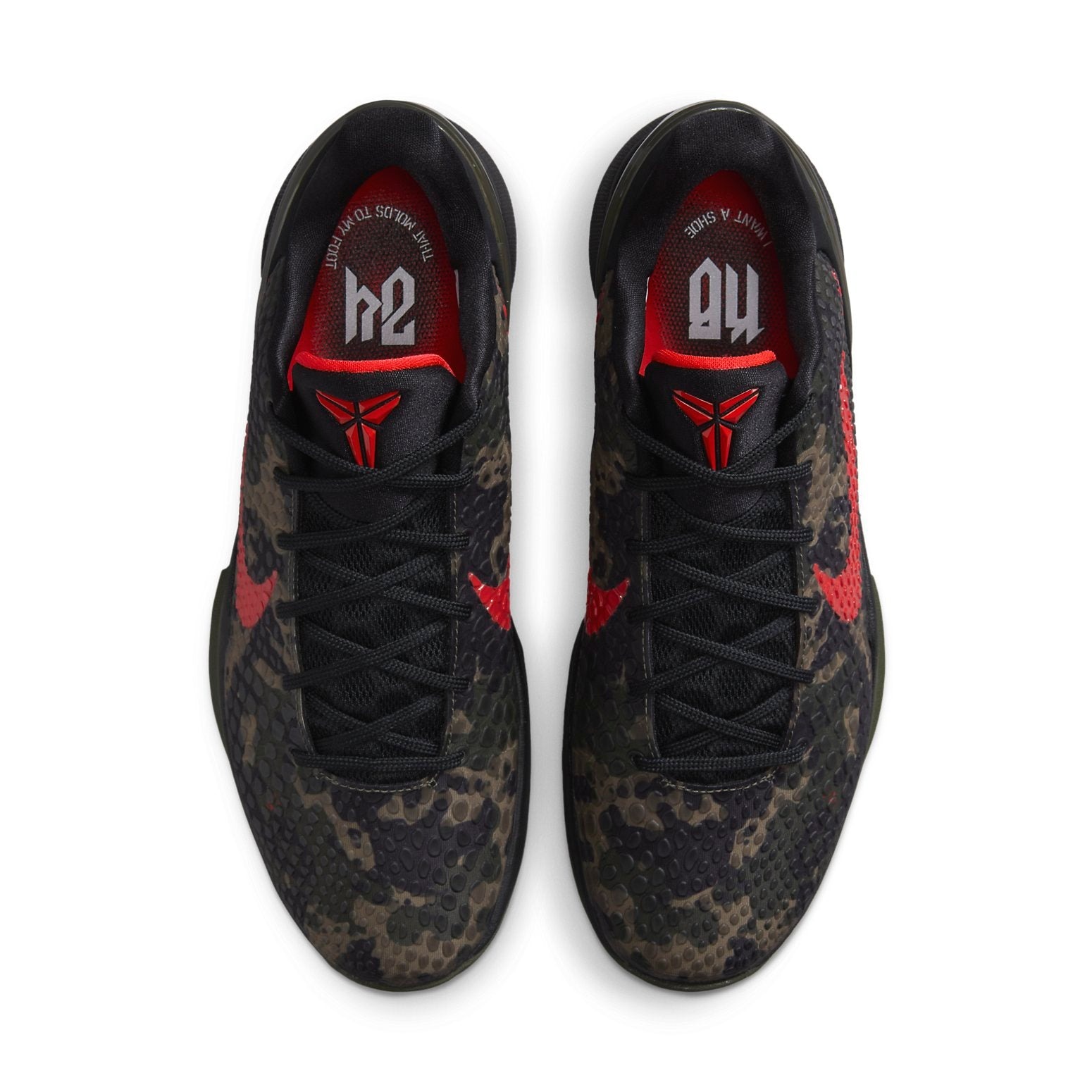 Introducing the Nike Kobe 6 Protro Italian Camo 2024, a sleek rendition of the classic Kobe 6, set to captivate with its unique camouflage pattern inspired by Kobe Bryant’s early years in Italy. The colorway, a sophisticated blend of black, crimson bog, and khaki, is a stylish nod to Kobe’s formative experiences and his enduring legacy. Tailored for those who admire the subtleties of design and the stories behind them, this sneaker combines the essence of Kobe’s history with cutting-edge footwear technology. The Kobe 6 Protro isn’t just about its standout Italian Camo aesthetic; it’s a powerhouse of sneaker tech. The shoe is engineered with advanced performance features like Zoom Air cushioning for responsive comfort, a Cushlon midsole for lightweight support, and a durable outsole that pays homage to Kobe’s multidirectional playing style. The sneaker’s unique texture mimics a snake’s skin, reflecting Kobe’s « Black Mamba » persona, while the innovative tech ensures these shoes stand up to the demands of both performance and everyday wear. On April 13, 2024, the Nike Kobe 6 Protro Italian Camo dropped at a retail price of $190. This release offers a piece of basketball royalty’s origin story, wrapped in modern performance and timeless design. Embrace the spirit of Kobe’s legacy and add a touch of Italian finesse to your sneaker collection with this 2024 re-release. It’s a sneaker that celebrates history, innovation, and the endless pursuit of greatness, perfect for those who walk the path less traveled.