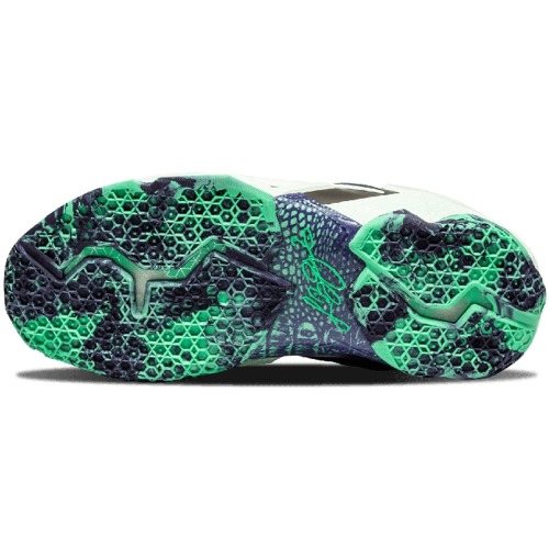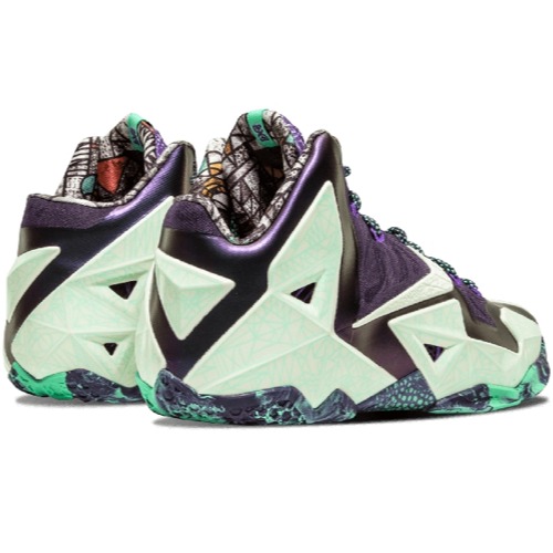 The Nike LeBron 11 NOLA Gumbo League Gator King comes in a mix of different colors, with Purple Dynasty, Green Glow, and Cashmere being the major hues.The construction of this NOLA Gumbo League Gator King Nike LeBron 11 is completed with a Purple Dynasty finish and highlighted with Green Glow on the Hyperposite panels. These panels have a glow-in-the-dark feature that reveals hand-drawn graphics. The tongue of this shoe showcases a reptile-skin print, and the outsole has a marbled effect, adding extra distinction to the pattern.The Nike LeBron 11 NOLA Gumbo League Gator King was set to retail at $220 when it was launched on February 14th, 2014.