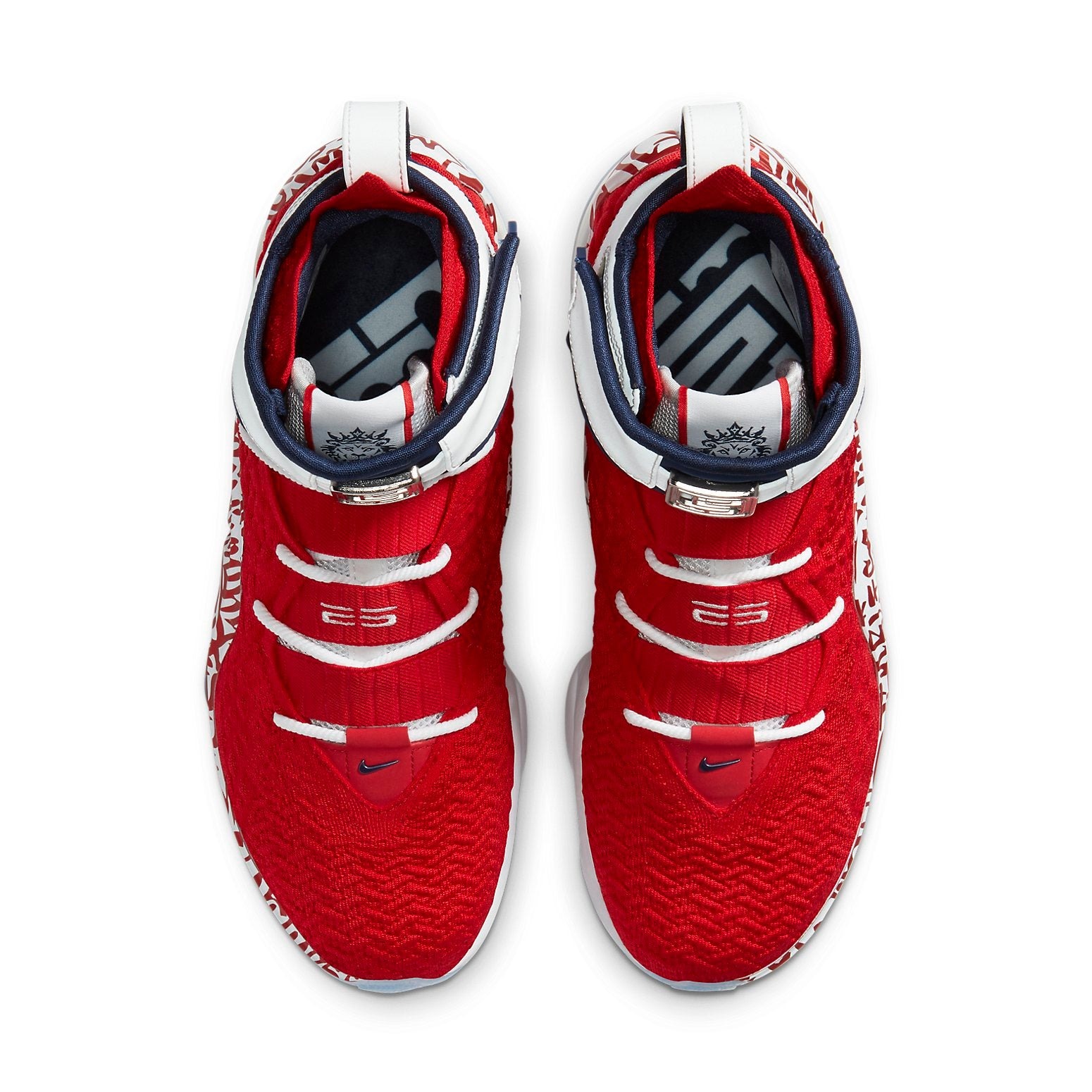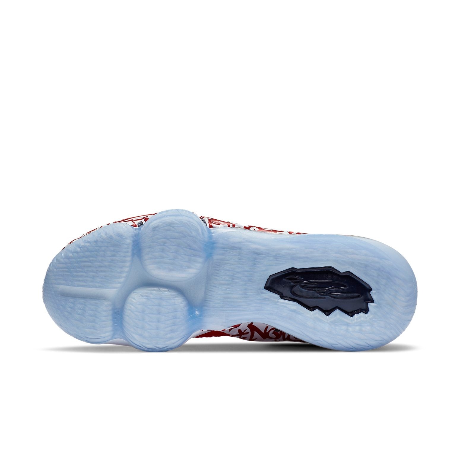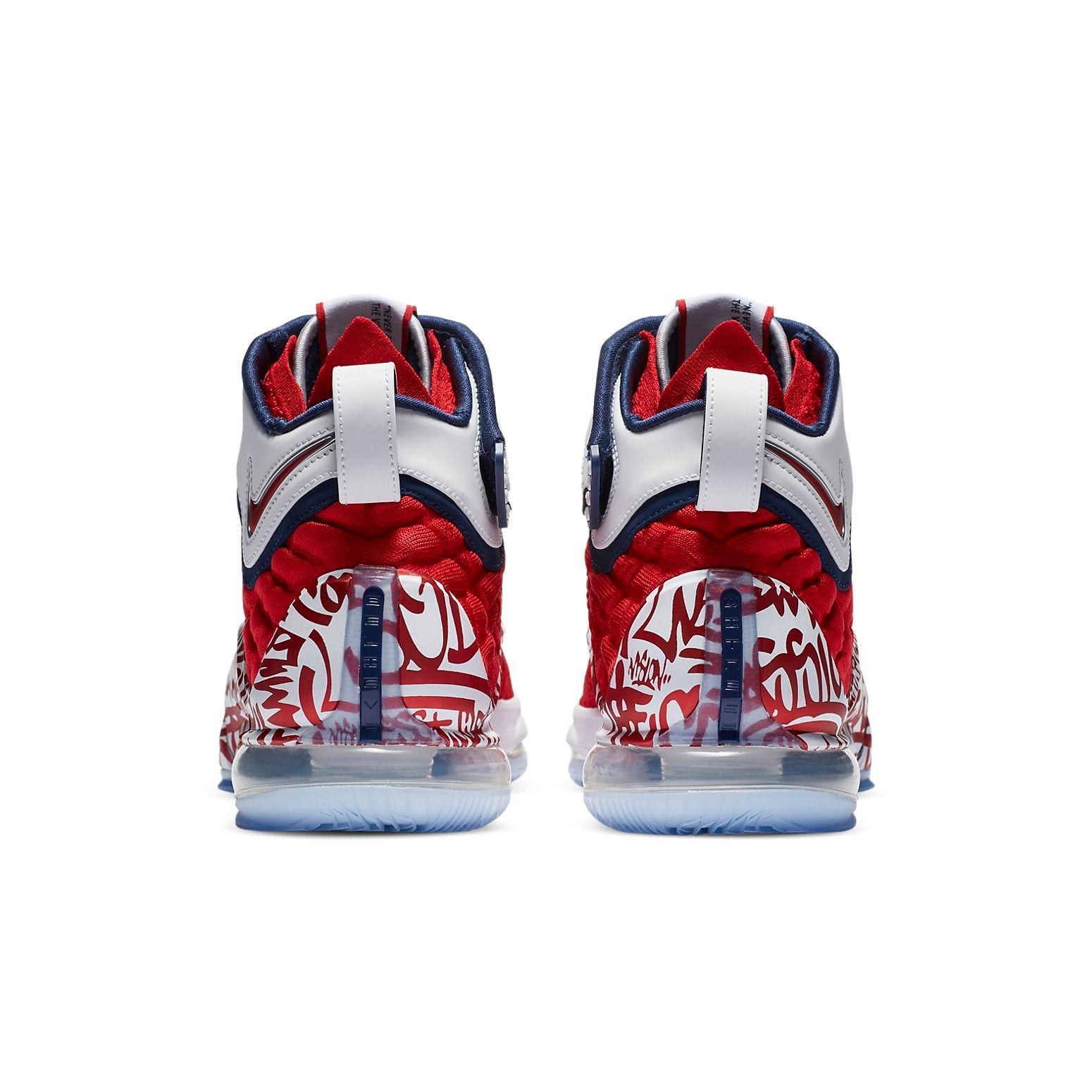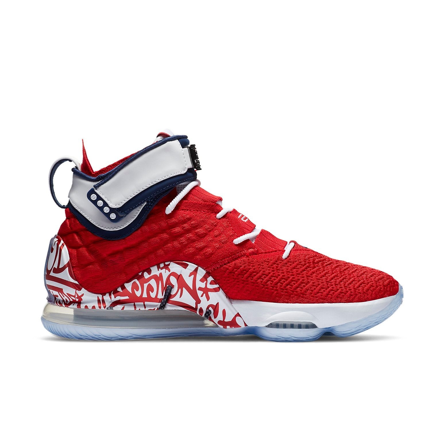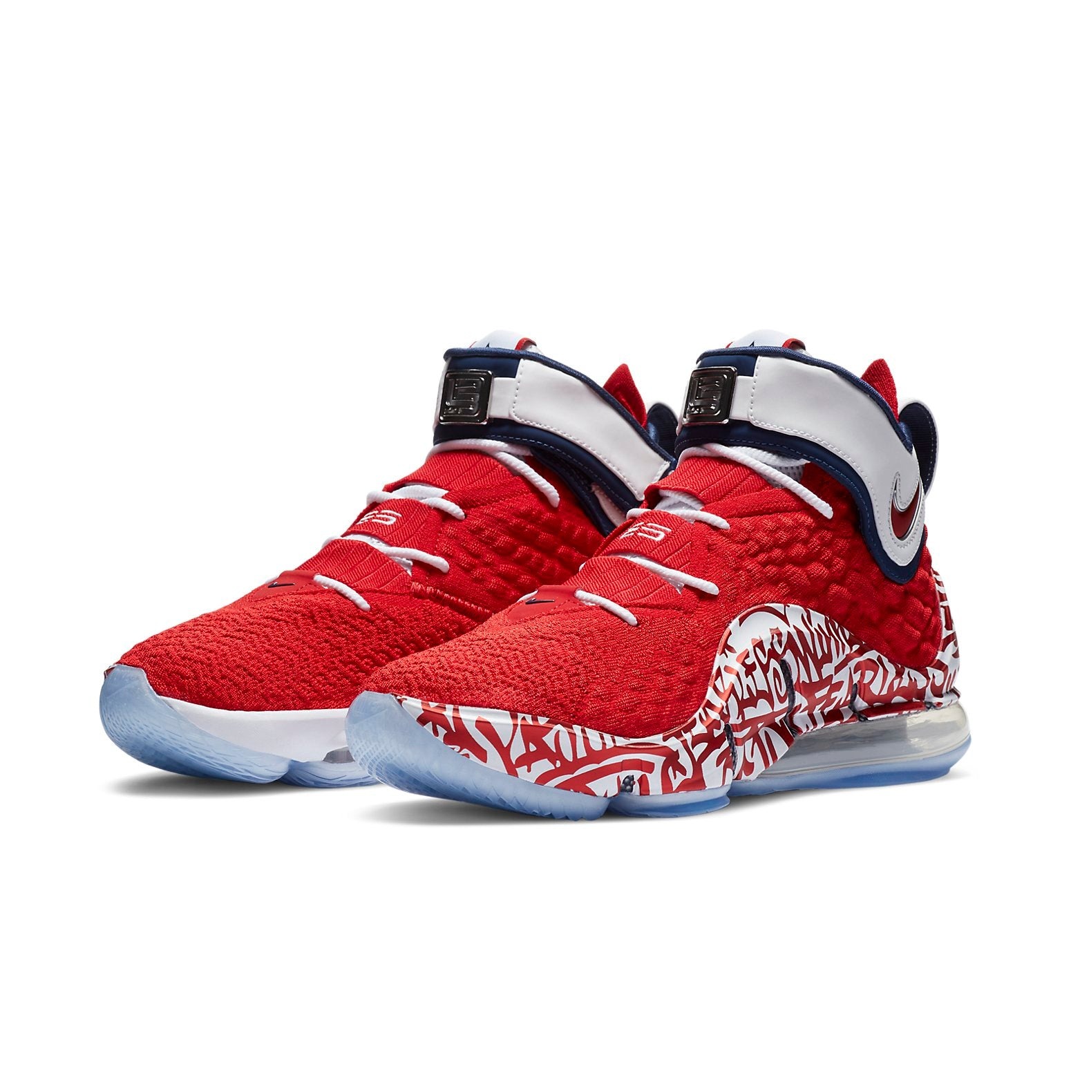 The Nike LeBron 17 Graffiti Remix Red was influenced by urban graffiti and street culture.The Graffiti Remix Red Nike LeBron 17 prominently features the color red. The woven fixtures along the upper are adorned with bold shades of red, which complement the vandalism-inspired design below and the red swoosh embedded on the white leather strap. The hard shell overlays in a neutral tone are positioned on the bottom half, sandwiched between the vibrant red upper and the light blue tread. Navy accents are sparingly incorporated along the collar, lining the edges of the fastener, heel pull, and the silver metallic buckle at the front.What do we think the standout feature of the Graffiti Remix Red Nike LeBron 17 is? But of course, its bold red color scheme. This color choice exudes confidence and adds an energetic flair to the overall design. The Nike LeBron 17 Graffiti Remix Red was released on July 28, 2020, and retailed at $225.