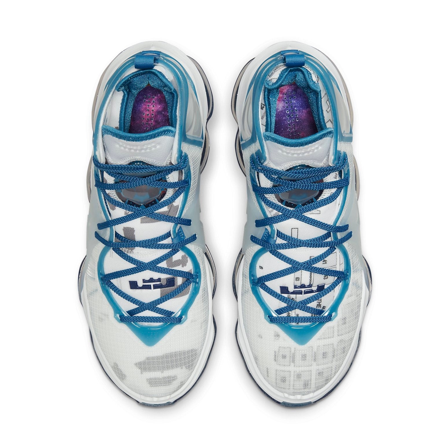 The Nike Lebron 19 Space Jam design is inspired by a mixture of different hues, with Blue Void, white, and Dutch Blue being the dominant colors.The Space Jam Nike LeBron 19 stands out with its notable features, such as the double-chambered Air Max unit located in the heel and the Zoom Air forefoot unit. This iteration of the Nike LeBron 19, inspired by the film « Space Jam, » showcases a color scheme of white and blue. Transparent overlays are positioned atop a base that features a mismatched print. The bottom of the shoe is designed to resemble valves and tubes, which forms its inner workings. This shoe also comes with thermoplastic polyurethane overlays in its upper. The shoes also features hexagonal-shaped traction patterns.When the Nike LeBron 19 Space Jam was introduced to the market on November 8, 2021, it sold for a retail price of $200.