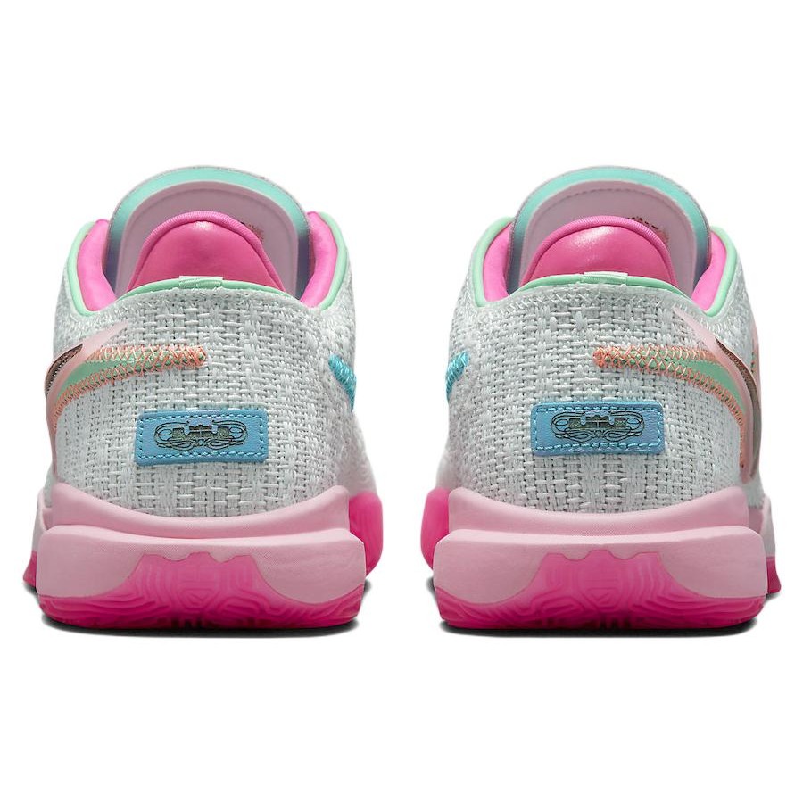 The Nike Lebron 20 Time Machine is a multi-toned sneaker that features medium soft pink and barely green hues as the dominant color schemes.The woven mesh upper of this Lebron 20 from Nike is contrasted by the fuchsia-colored padded collar that is complemented by a orange hue stitching on the leather eyestay. The lateral side features a turquoise Swoosh with exposed deco stitching encircling it, placed above an iridescent Swoosh. The sneaker also has a guardrail coated in synthetic material and decorated with a design that holds the lateral forefoot in place.The Nike Lebron 20 Time Machine debuted on September 29th, 2022, with a retail price of $200.