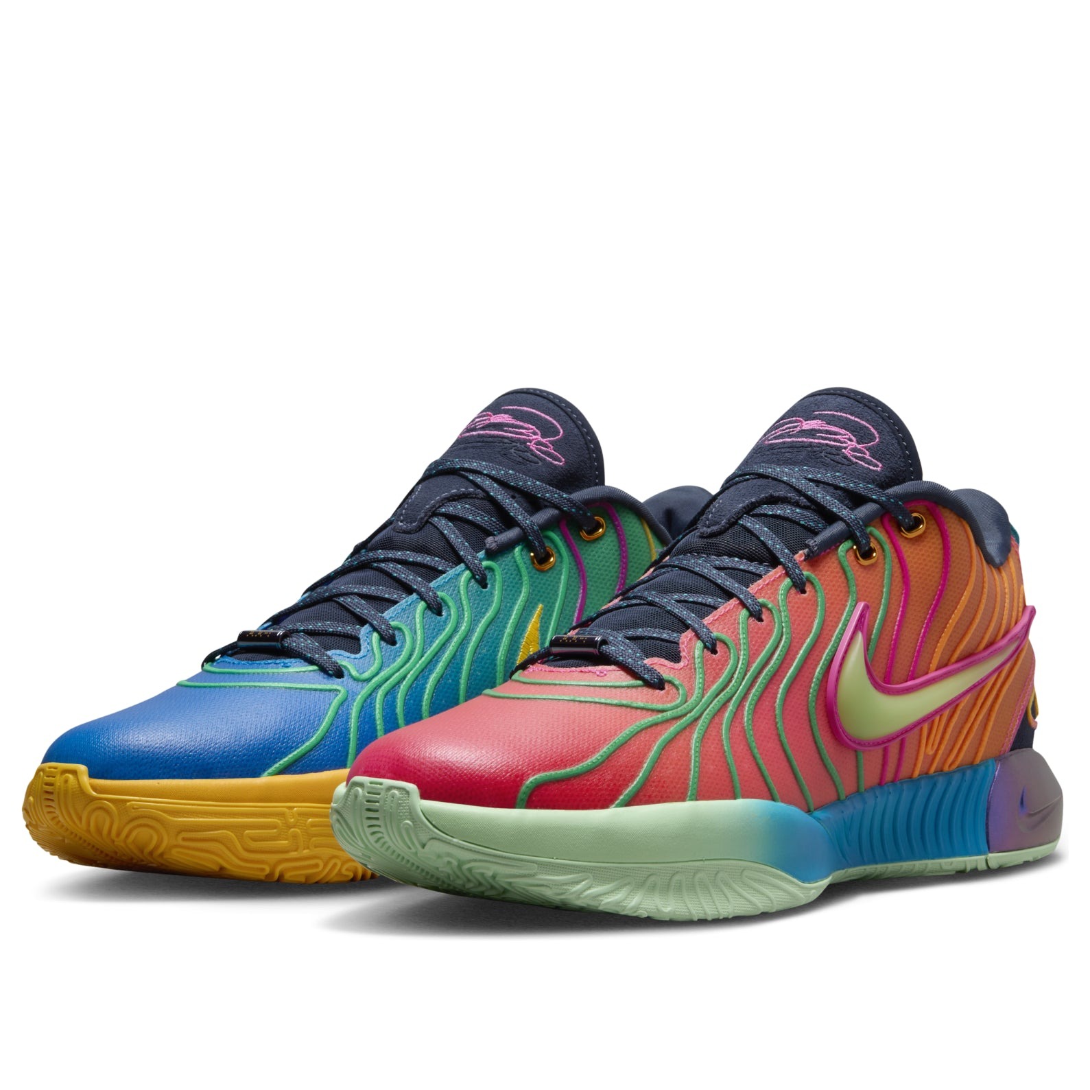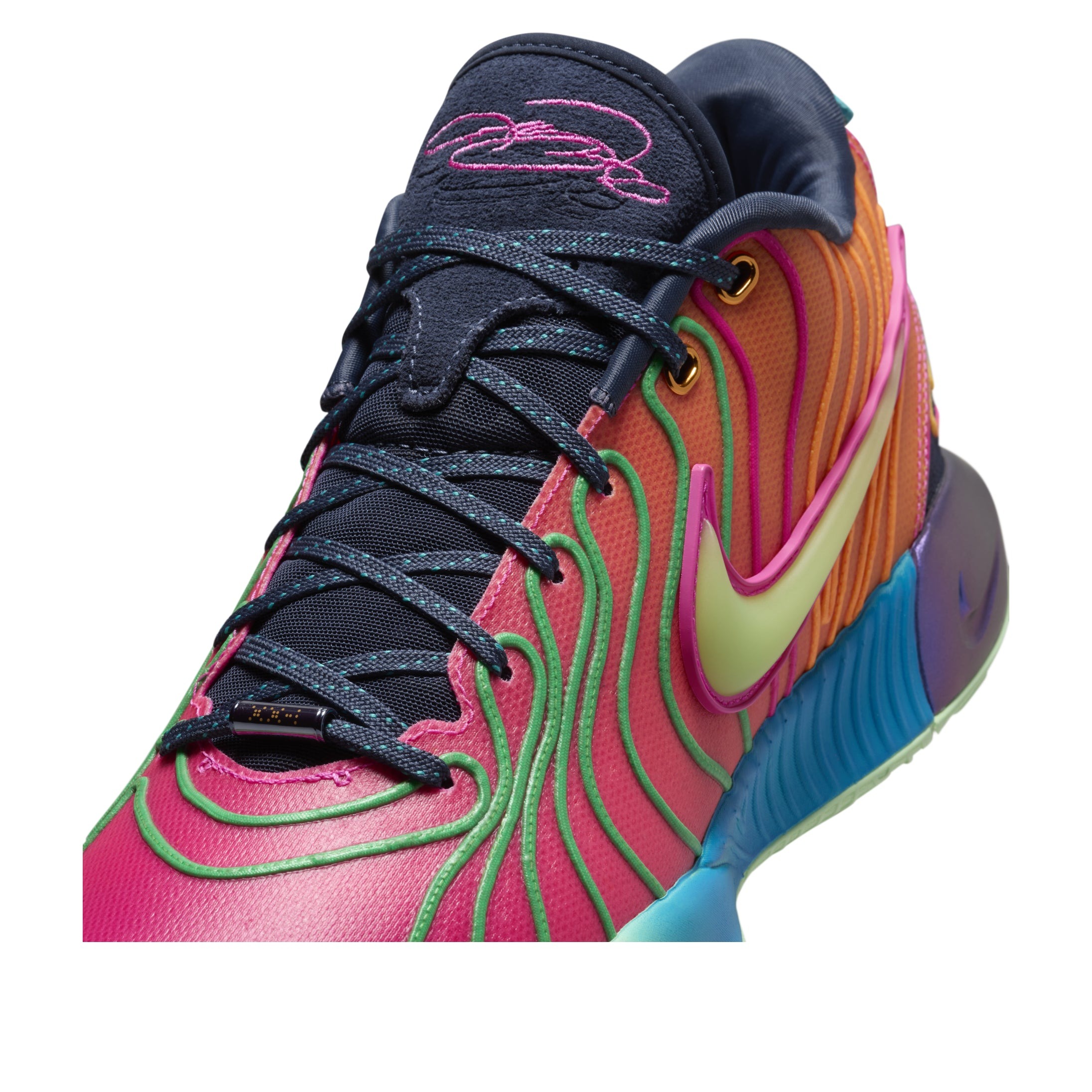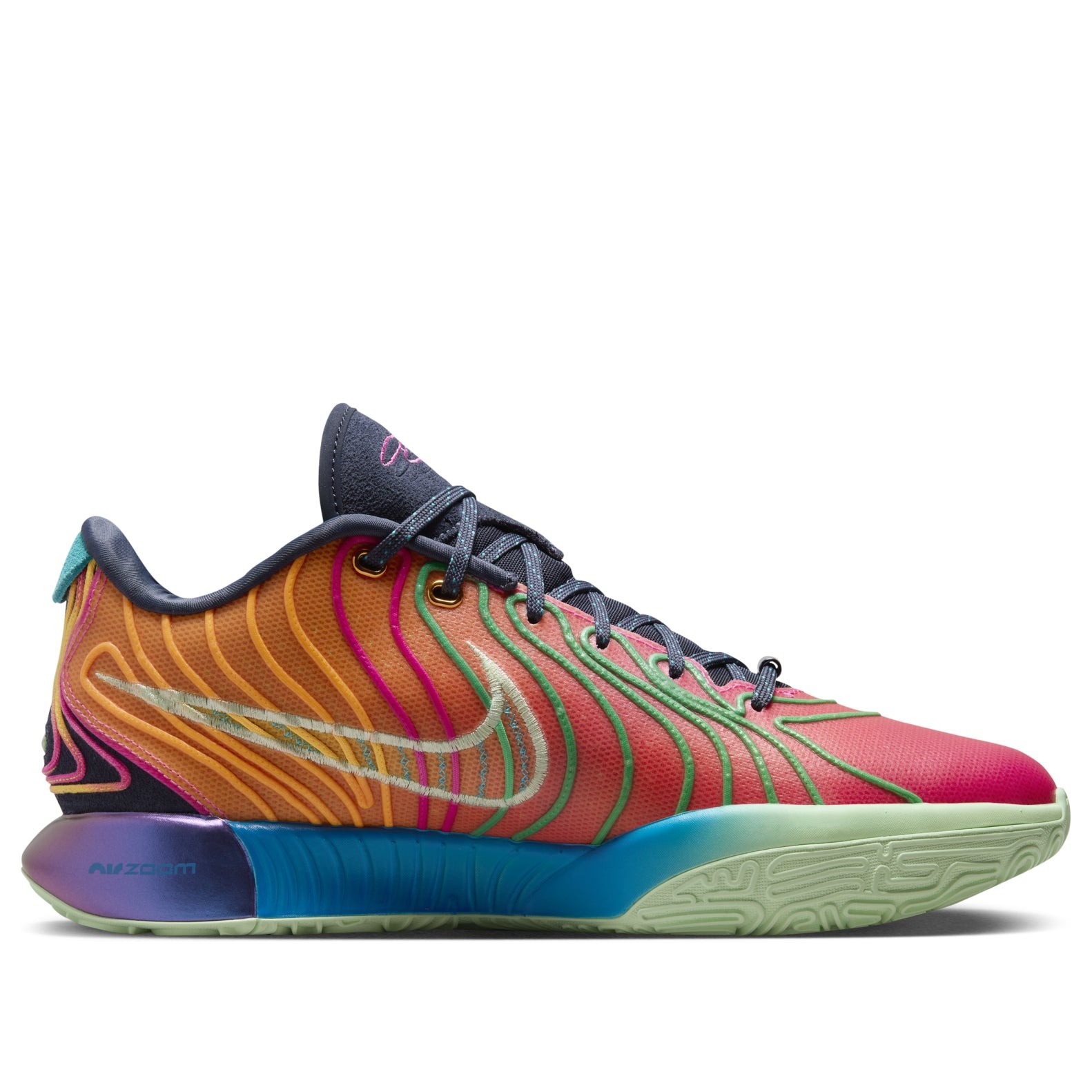 The Nike LeBron 21 Optimism brings a psychedelic, mismatched color gradient to the LeBron 21 silhouette.The left shoe of the Optimism Nike LeBron 21 fades from Bliss Pink to Laser Orange, while the right shoe displays a color gradient from Photo Blue to Vapor Green. The mesh upper boasts a 360-degree zonal cabling system a series of wavy lines that radiate from the midsole and provide superior containment. These multicolor lines create an optical illusion, giving the upper a more molded appearance. Contrasting vibrant hues can also be found on the Phylon midsole, which houses Zoom Air cushioning in the heel and forefoot. Finally, the TPU shank plate supports the foot and provides structure.Our experts at Newsole like the symbolism behind the exposed cabling system. The lines resemble the ridges on an oyster shell and symbolize LeBron s desire to protect and shelter his daughter. The Nike LeBron 21 Optimism was released on May 1, 2024, and sold for $200.