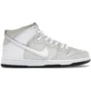The Nike SB Dunk High Antihero Skateboards is a high-top shoe designed as a partnership between the sportswear brand and the skateboard brand. The Antihero Skateboards version of the Nike SB Dunk High has a leather upper. The base is an off-white, almost gray color which forms the sides, the perforated toe box, and even the eyestays and toe cap overlays. The Nike Swoosh appears in white leather on both sides, while the ankle strap that runs down to form the heel is also white leather. The tongue contains dual Antihero and Nike SB branding, while the heel contains a subtle embossed Antihero logo. The shoe sits on a white midsole and black outsole.What we like best about this shoe is the textured leather upper, which adds visual interest even though the colors are neutral. The Nike SB Dunk High Antihero Skateboards was released on November 21, 2024, for $145.