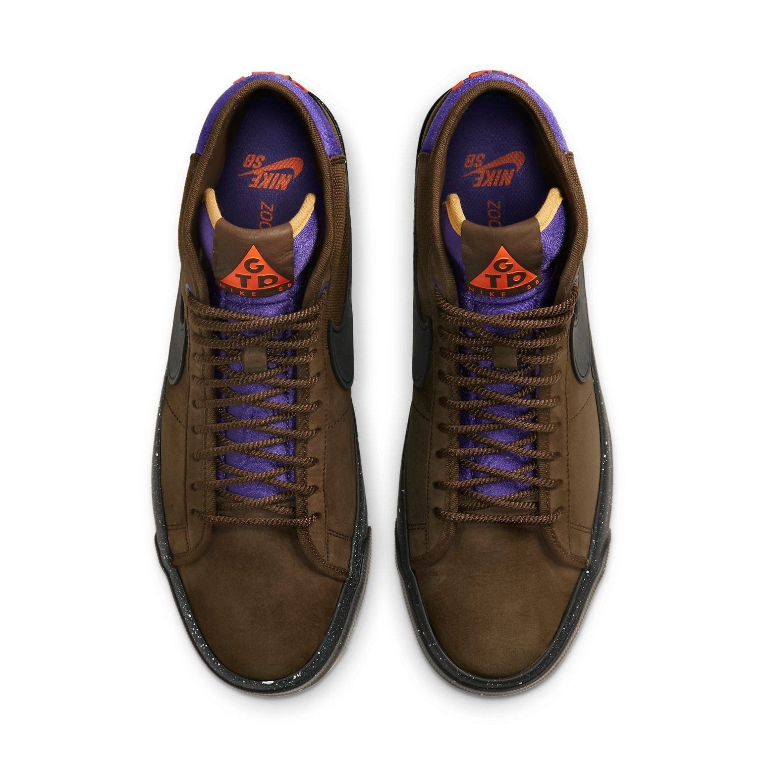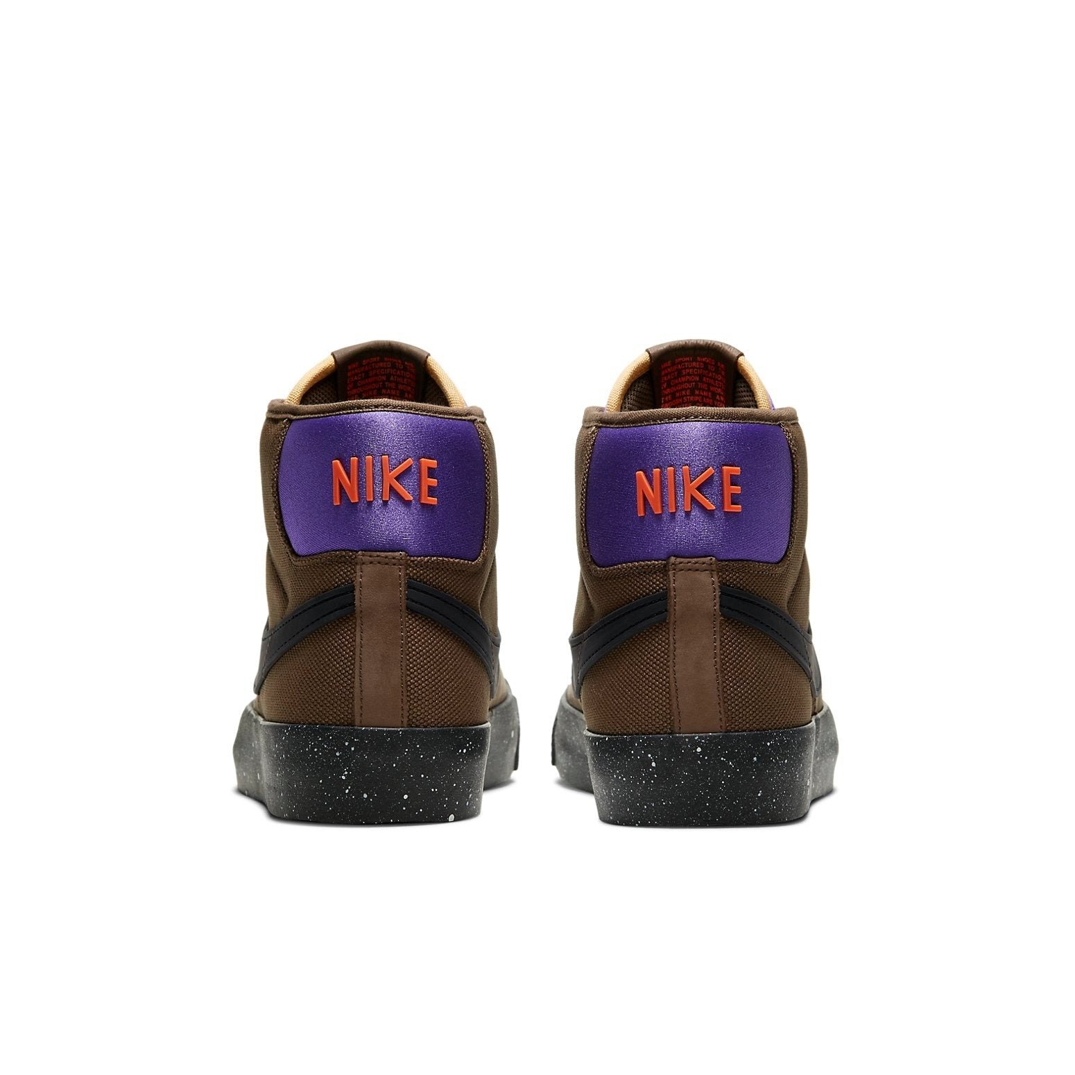 The Trails End Brown, Prism Violet, Total Orange and Black dressed Nike SB Zoom Blazer Mid GT ACG is one of the Nike SB Zoom Blazer Mid sneaker brands accessed on the market.The Nike SB Zoom Blazer Mid GT ACG sneaker s design features a predominantly Trails End Brown leather upper contrasted with black accents on the sneaker and enlarged black Swoosh on the lateral sides. The design also features Trails End Brown shoe laces across a Prism Violet tongue. The tongue also features a tag dressed in Total Orange colors. The total orange colors on the tongue are also contrasted with NIKE and CDG brandings. Concluding the design is the Prism Violet heel cap that also features NIKE branding in Total Orange color.The Nike SB Zoom Blazer Mid GT ACG was launched as one of Nike brand of sneakers accessed on the market on 10th October 2020 with a recommended retail price of $100.