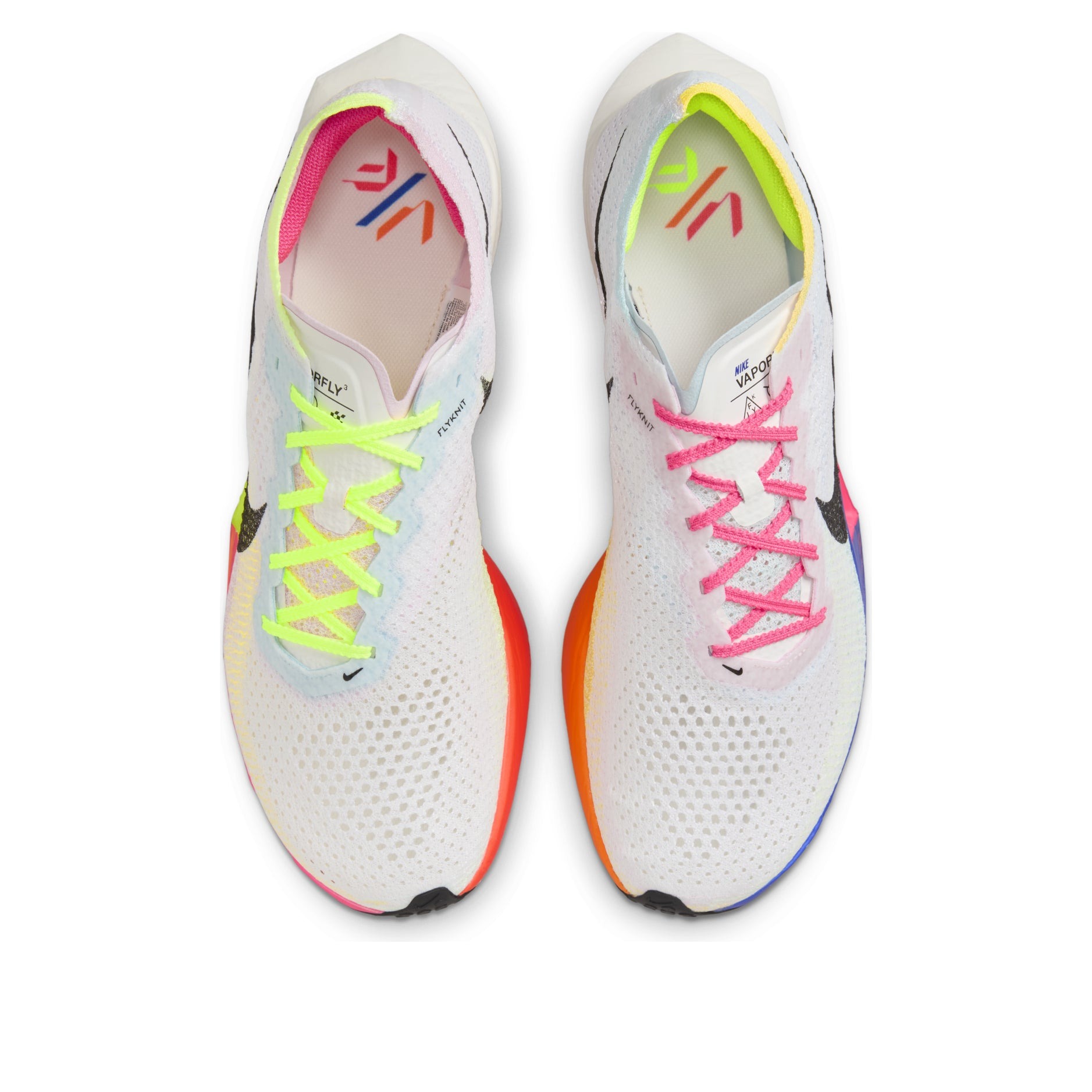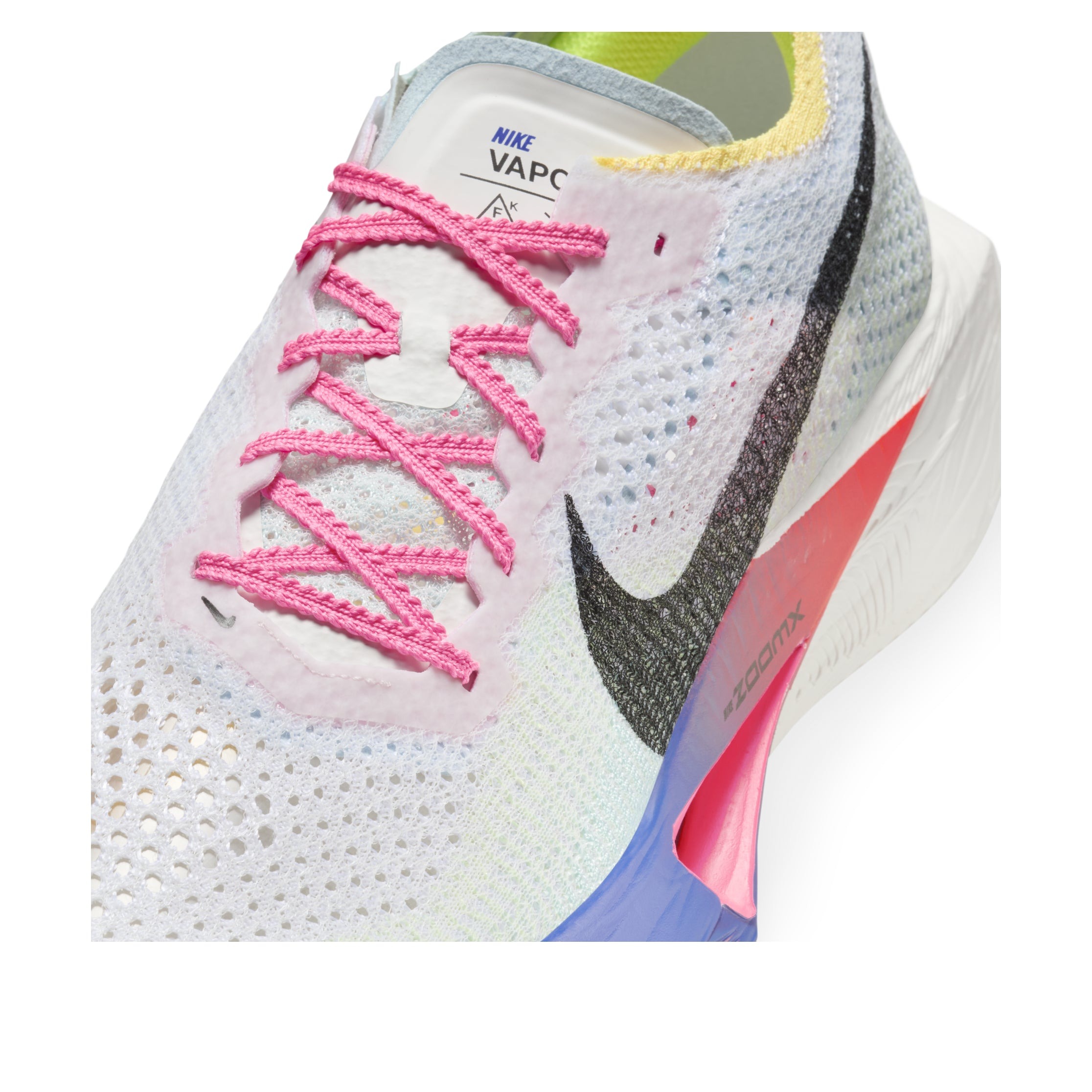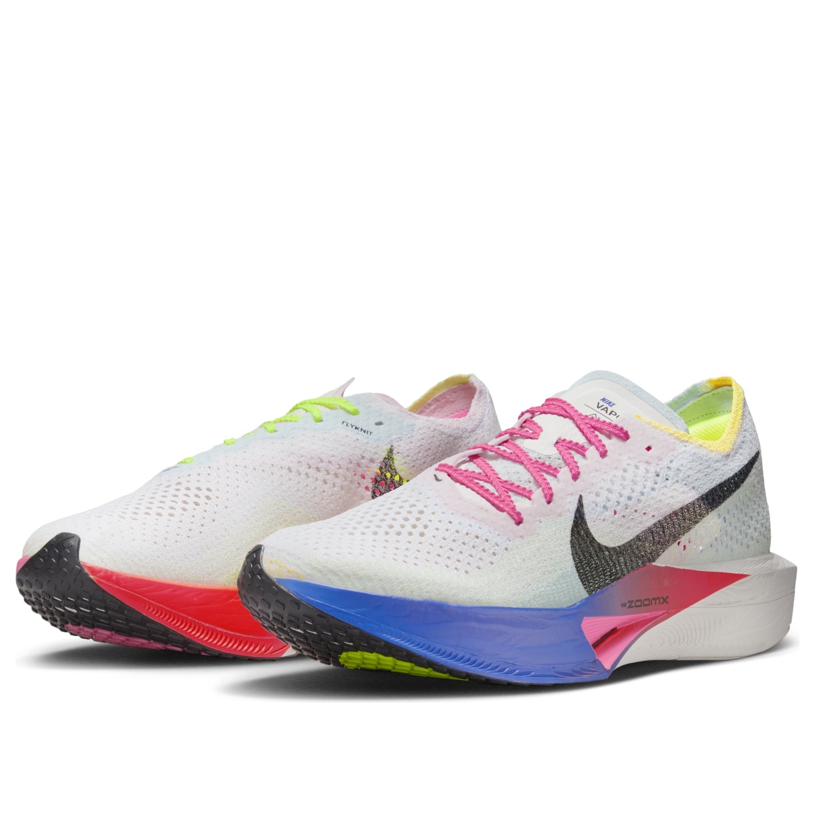 The Nike ZoomX Vaporfly 3 Multi-Color is a vibrantly colored trainer featuring a comfortable chunky sole and an extremely lightweight, breathable mesh upper. It combines a modern angular design with vintage contours. These Multi-Color Nike ZoomX Vaporfly 3 trainers also have serious athletic credentials. The ZoomX unit provides elite levels of impact absorption and energy return. Theyre all-rounders, capable of getting you through anything from a marathon to a Saturday morning park run. A full-length carbon fiber fly plate both protects your foot and helps the shoe maintain its athletic rigidity. Extra padding has been added to the tongue to reduce lace pressure. The colorway features a blend of pink and luminous yellow, complemented by shades of cream, blue, and gray. Our Newsole experts were very impressed by the performance of this trainer. It is a comfortable shoe to wear at home, boasting a modern design that belies its true capabilities. The unusual colorway and material blend make it a worthwhile collectible as well. The Nike ZoomX Vaporfly 3 Multi-Color was released on October 3, 2024, at a retail price of $260.