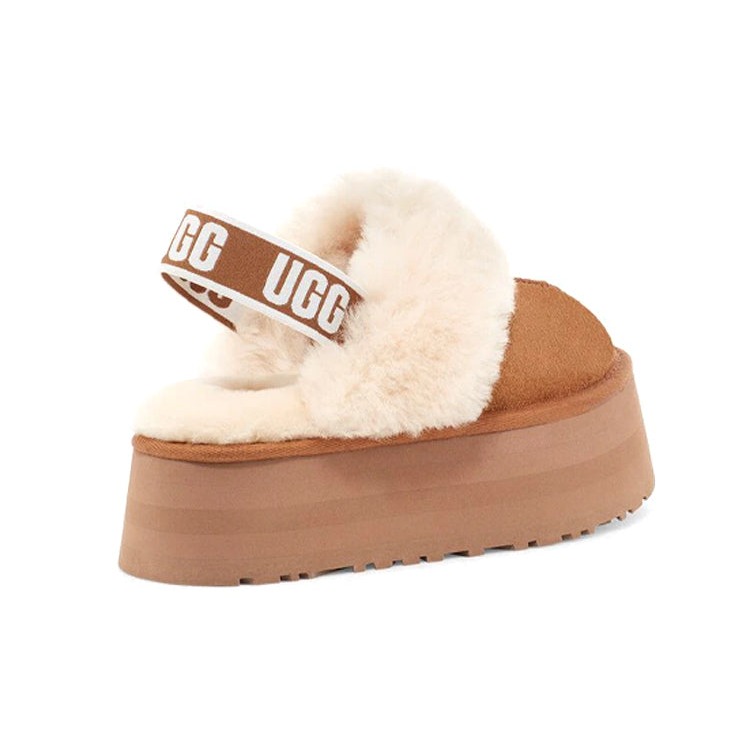 The UGG Funkette Slipper Chestnut (Women’s) presents decadently comfortable slip-on footwear sized explicitly for women. This slipper offers platform height for ultimate comfort and undeniable style.The Chestnut color of the UGG Funkette slipper for Women sports an upper composed of rich chestnut-colored suede with thick sheepskin edging at the collar. A chestnut elastic heel strap sports a white rim and white UGG branding that matches the soft sheepskin insole and lining. Chestnut foxing created from recycled polyester fiber surrounds the bottom of the upper, and a ridge outlined in stitching courses vertically up the forefoot.The aspect of this slipper that we most appreciate is the impressive sole unit. A chestnut-colored EVA foam midsole approximately one inch thick at the heel provides support and cushioning. The outsole patterned with traction grooves is made of SugarSole or Treadlite, two responsibly sourced compounds created by UGG. The UGG Funkette Slipper Chestnut (Women’s) was released on September 24, 2023, at a retail price of $130.