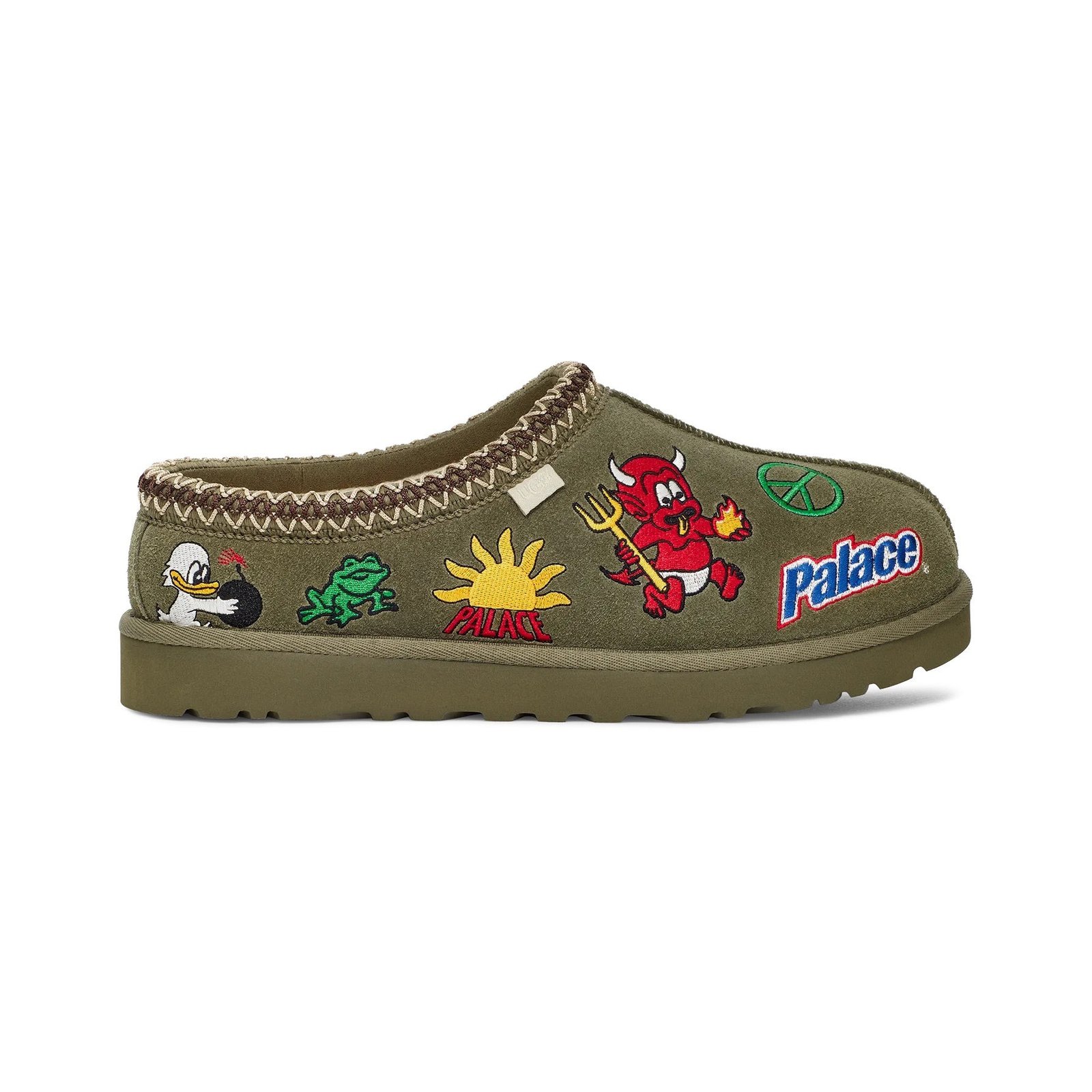 The UGG Tasman Slipper Palace Burnt Olive is part of a collaboration between UGG and Palace, a skate brand known for its 90s-inspired apparel and pop culture references.This collaboration sees the Tasman slipper decorated with a collection of signature patches. On the lateral side, one patch features a cartoon devil holding a pitchfork, while another displays a green frog poised to jump. The medial side boasts sasquatch, a cupid shooting an arrow, a flaming P, and many other patches. Like other Tasman variations, this version has a soft suede upper, a sheep skin lining, and the signature UGG braid around the collar. Plus, the Treadlite outsole provides cushioning and light traction without weighing down the slipper.Our experts like the way the patches stand out against the Burnt Olive upper. The UGG Tasman Slipper Palace Burnt Olive was released on December 1st, 2023, and retailed at $190.