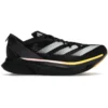 The adidas Adizero Adios Pro 3 Black Spark brings innovative technology and bold design to elite running shoes. This shoe is designed for speed and combines advanced engineering with a striking black, yellow, and orange aesthetic to redefine performance on the track and road. The Black Spark Adizero Adios Pro 3 by adidas features ENERGYRODS 2.0 embedded in a Lightstrike Pro midsole for optimized propulsion. The breathable mesh upper comes in black with fiery yellow and white accents. The Continental rubber outsole offers traction on various surfaces. The adidas Adizero Adios Pro 3 was developed through extensive research and testing to optimize marathon running performance, including performance testing, materials science, and more. As the experts, something we love about the Black Spark adidas Adizero Adios Pro 3 is the curve that molds the foots arc. The 3-Stripes in white and the golden detail in the outsole make these shoes one to watch in the gym or elsewhere. Retailing at $250, it was released on 17th April 2024 and combines technical precision with cutting-edge design.