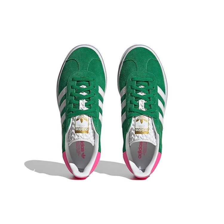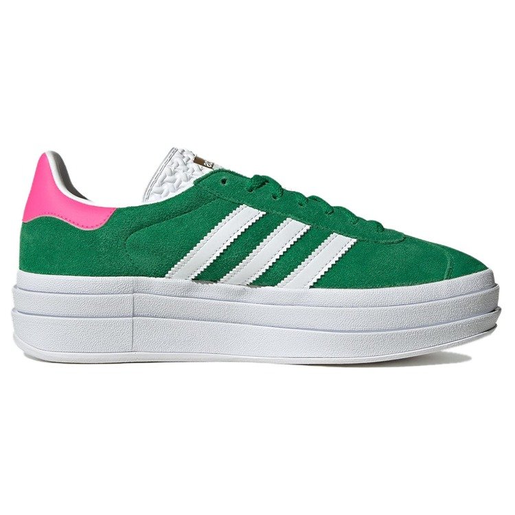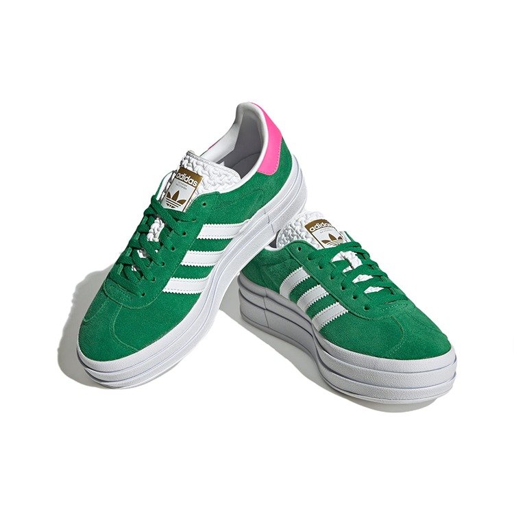 The adidas Gazelle Bold Green Lucid Pink Womens is a women s model that provides a new take on the original Gazelle shoe, which was initially launched in 1968. It features bright colors and the classic 3-Stripes on the side.This adidas Gazelle model is made from a mixture of rubber, leather, and suede. It has a Dark Forest Green suede body, with bright pink suede and leather appearing on the back of the shoe. The sole and midsole are composed of three thick layers of white rubber that are meant to provide support. These shoes also come with Forest Green laces that are crisscrossed. A feature of the adidas Gazelle Bold Green Lucid Pink Womens that our group of experts particularly likes is the white textured tongue that helps to make this model especially unique. This pair of shoes first was released for sale on June 1st, 2023, and its starting retail price began at $120.