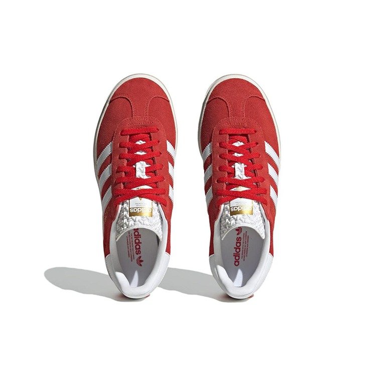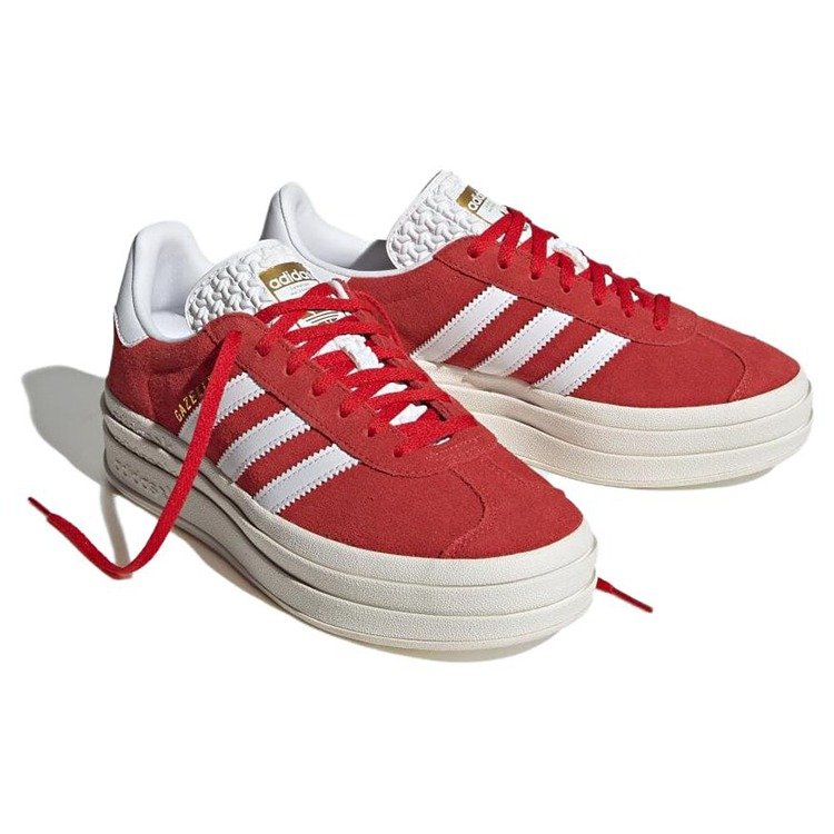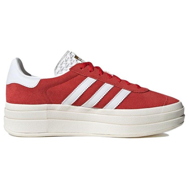 The adidas Gazelle Bold Red Cloud White (Women’s) is a women s exclusive sneaker from the adidas Gazelle Bold lineup in a red and Cloud White colorway. This adidas Gazelle Bold features a Vivid Scarlet suede upper highlighted by white leather detailing on the serrated edge three stripes on the sides and the heel tab. More white detailing appears on the padded tongue and branded insoles. Traditional details include Metallic Gold “GAZELLE” wording on the lateral next to the three stripes and a T-toe overlay on the vamp. Other details include Vivid Scarlet laces and gold adidas branding on the tongue. The highlight of this sneaker is the platform sole unit, which comprises three stacked layers of the traditional sole unit in Vintage Off-White. Our experts particularly love this sneaker s modern update and vibrant colorway, which gives it a stylish and eye-catching appearance. The adidas Gazelle Bold Red Cloud White (Women’s) was released on May 14th, 2023, retailing at $120.