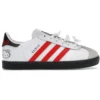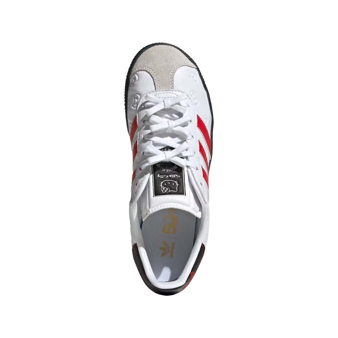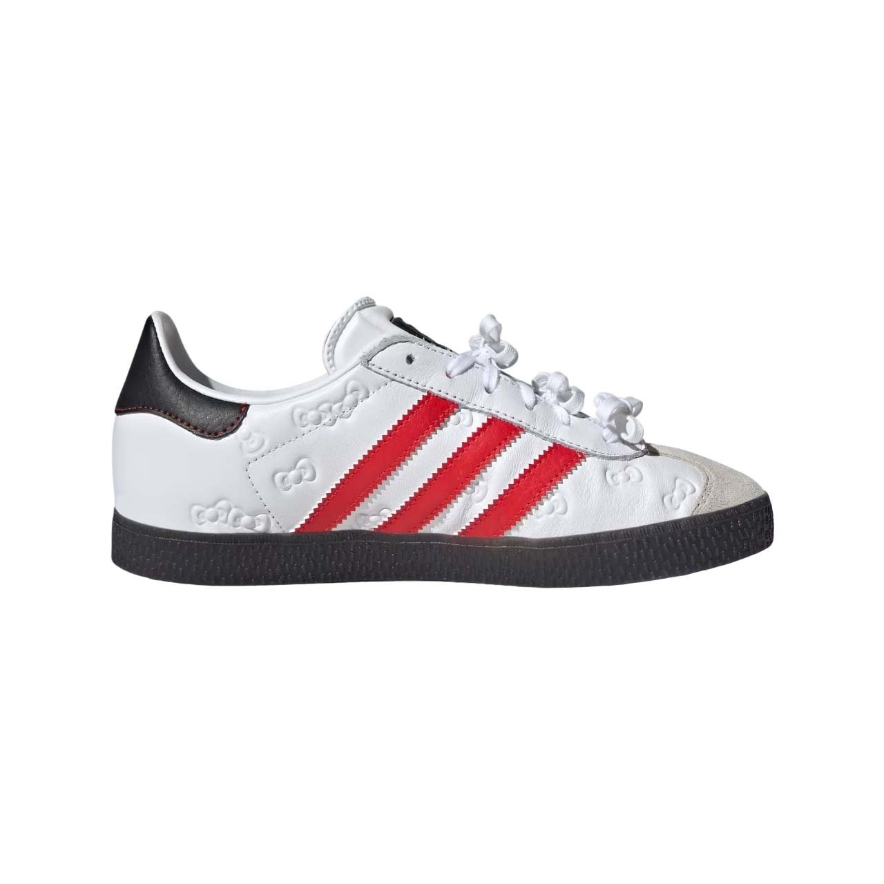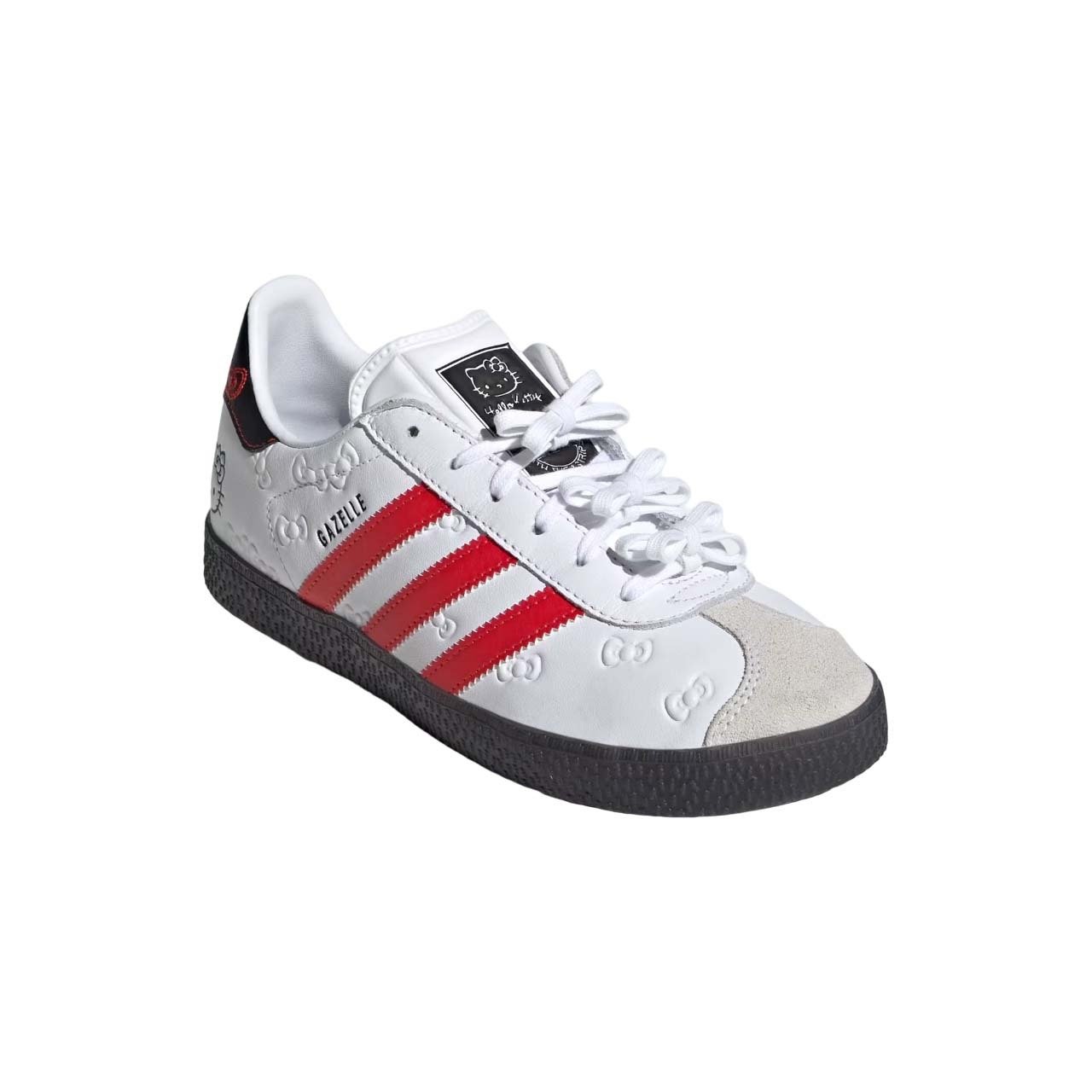 The adidas Gazelle Hello Kitty (GS) decks out the familiar Gazelle silhouette with motifs and colors inspired by the Japanese cat character.As part of a collaboration between adidas and Sanrio, this grade-school version of the Gazelle celebrates Hello Kitty s 50th anniversary. The white leather upper displays debossed hair bows, inspired by one of Hello Kitty s favorite accessories. Hello Kitty s face graces the heel, while a small, red bow decorates the leather heel mustache. The serrated 3-Stripes logo comes in bright red, complementing the exposed stitching on the heel mustache. Other noteworthy features include the Hello Kitty branding on the tongue and tiny white bows along the laces. Completing the look, a suede toe box overlay in beige protects the toe, while the dark rubber outsole matches the black accents.Our experts at Newsole like the dual adidas and Hello Kitty branding printed in metallic gold on the insole. The adidas Gazelle Hello Kitty (GS) was released on October 1, 2024, and sold for $85.