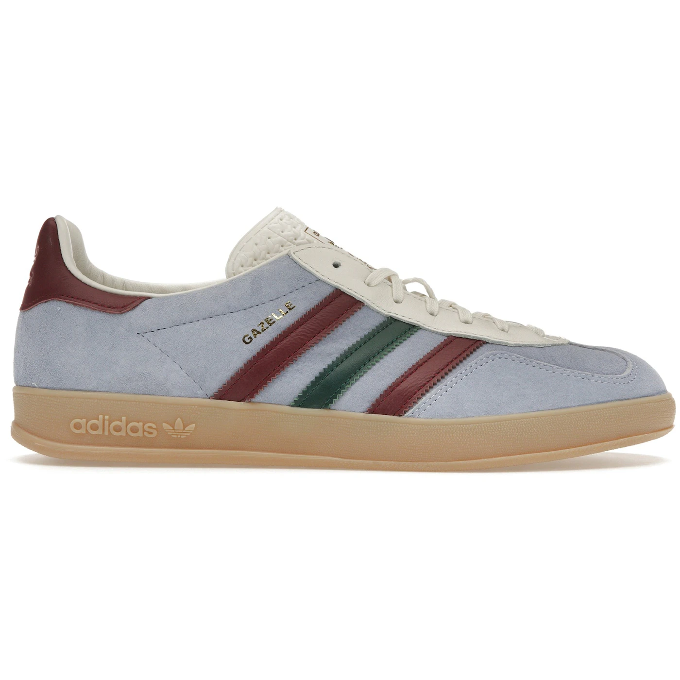 The adidas Gazelle Indoor Blue Dawn Collegiate Burgundy shakes up the recognizable Gazelle design by adding a brand-new colorway.This indoor soccer shoe features a Blue Dawn base with the signature 3-Stripes logo in Collegiate Burgundy and Core Green on the suede upper. The leather heel counter also comes in Collegiate Burgundy, which complements the 3-Stripes. Like all Gazelle sneakers, this iteration boasts a gum rubber sole, the adidas Trefoil on the tongue, and gold GAZELLE lettering alongside the 3-Stripes. The sneaker offers the classic T-toe overlays as well as a non-bulky midsole debossed with adidas . The insole comes with subtle branding details and the liner is made of a soft textile.Our Newsole experts love the white laces, lace cage, and tongue that offset the bold colors on the upper. The adidas Gazelle Indoor Blue Dawn Collegiate Burgundy was released on August 25, 2023, and retailed at $150.
