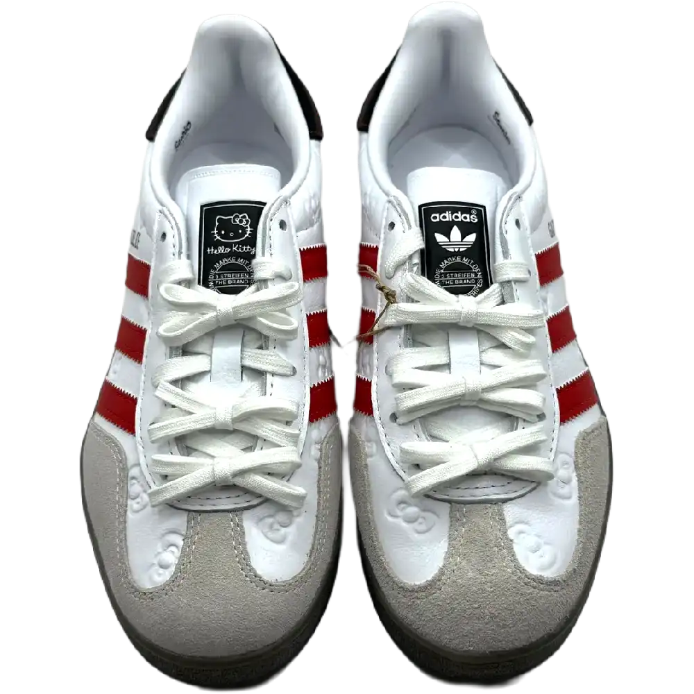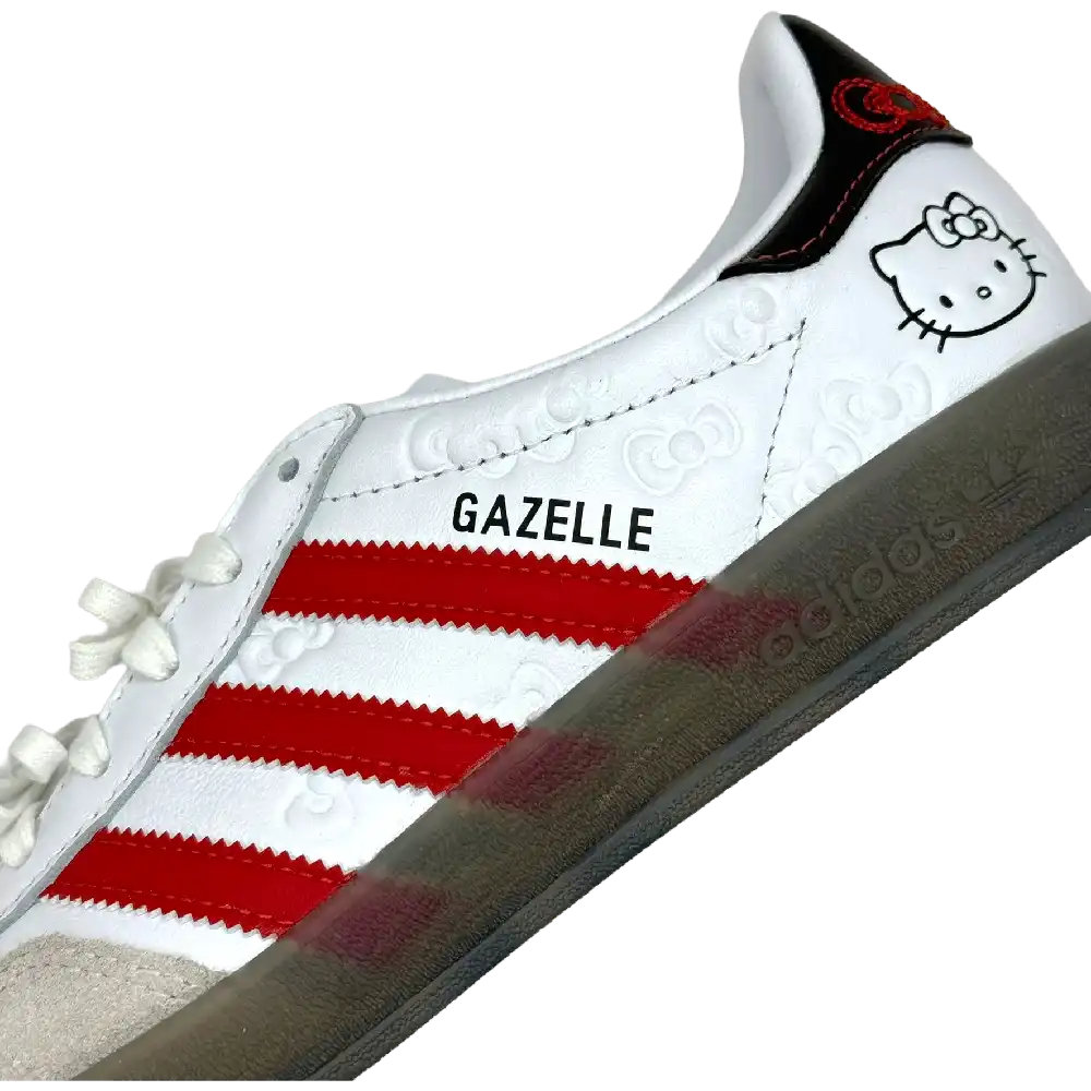 In women’s sizes, the adidas Gazelle Indoor Hello Kitty (Women’s) is an athletic shoe crafted with a debossed bow print leather and suede upper in Core White, accented by a Core Black heel tab. Gazelle branding is printed next to the signature 3-Stripes in Red. Hello Kitty’s face and signature Red bow appear on the rear heel and tab. Additional Hello Kitty branding appears on the tongue, accented by laces with three bows. adidas, the German athletic shoe brand producing iconic footwear styles since the 1940s, is known worldwide for its timeless footwear, with the Gazelle having been in rotation since 1966. Hello Kitty is an iconic character who is a worldwide phenomenon in her own right, beloved by fans since her introduction in 1975. adidas worked with Sanrio to create a Gazelle infused with Kitty’s signature motifs.In our opinion, the best feature of this shoe is its specialized lacing, which further extends its Hello Kitty aesthetic. The adidas Gazelle Indoor Hello Kitty (Women’s) was released on October 1, 2024, and retailed at $120.
